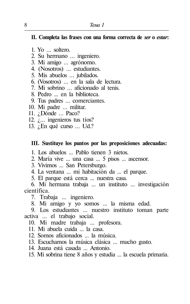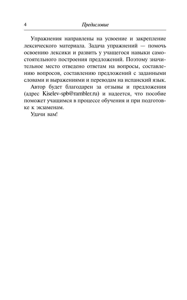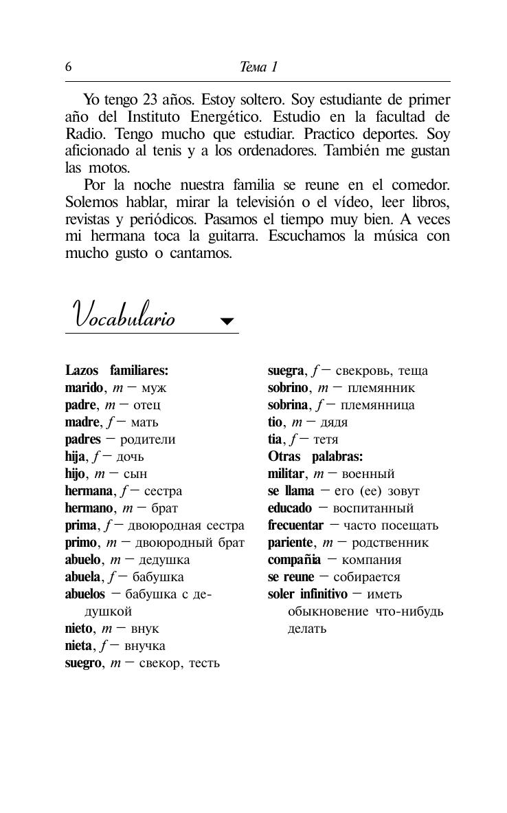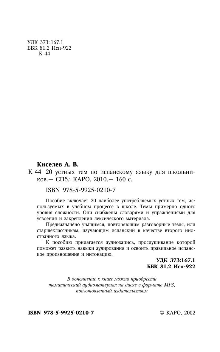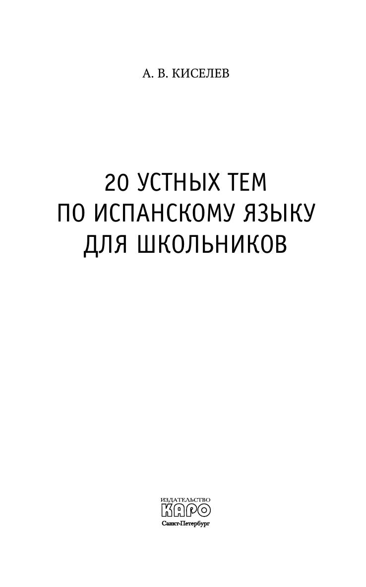 Пособие включает 20 наиболее употребляемых устных тем, используемых в учебном процессе в школе. Темы примерно одного уровня сложности. Они снабжены словарями и упражнениями для усвоения и закрепления лексического материала. Предназначено учащимся, повторяющим разговорные темы, или старшеклассникам, изучающим испанский в качестве второго иностранного языка. К пособию прилагается аудиозапись, прослушивание которой поможет развить навыки аудирования и освоить правильное испанское произношение и интонацию.