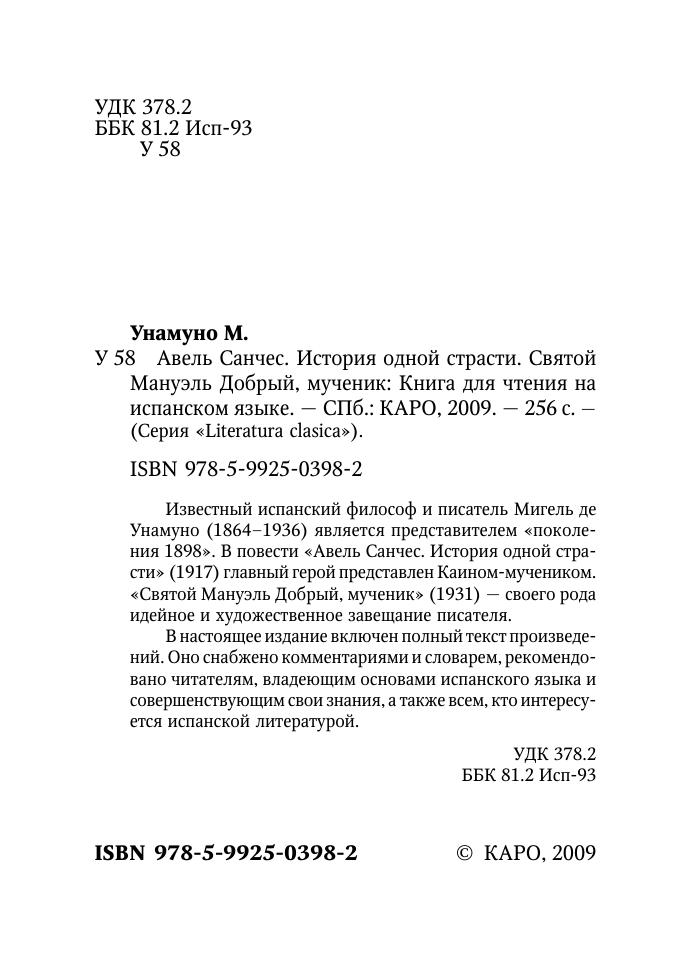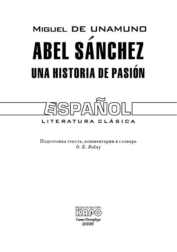 Известный испанский философ и писатель Мигель де Унамуно (1864–1936) является представителем «поколения 1898». В повести «Авель Санчес. История одной страсти» (1917) главный герой представлен Каином-мучеником. «Святой Мануэль Добрый, мученик» (1931) — своего рода идейное и художественное завещание писателя. В настоящее издание включен полный текст произведений. Оно снабжено комментариями и словарем, рекомендовано читателям, владеющим основами испанского языка и совершенствующим свои знания, а также всем, кто интересуется испанской литературой