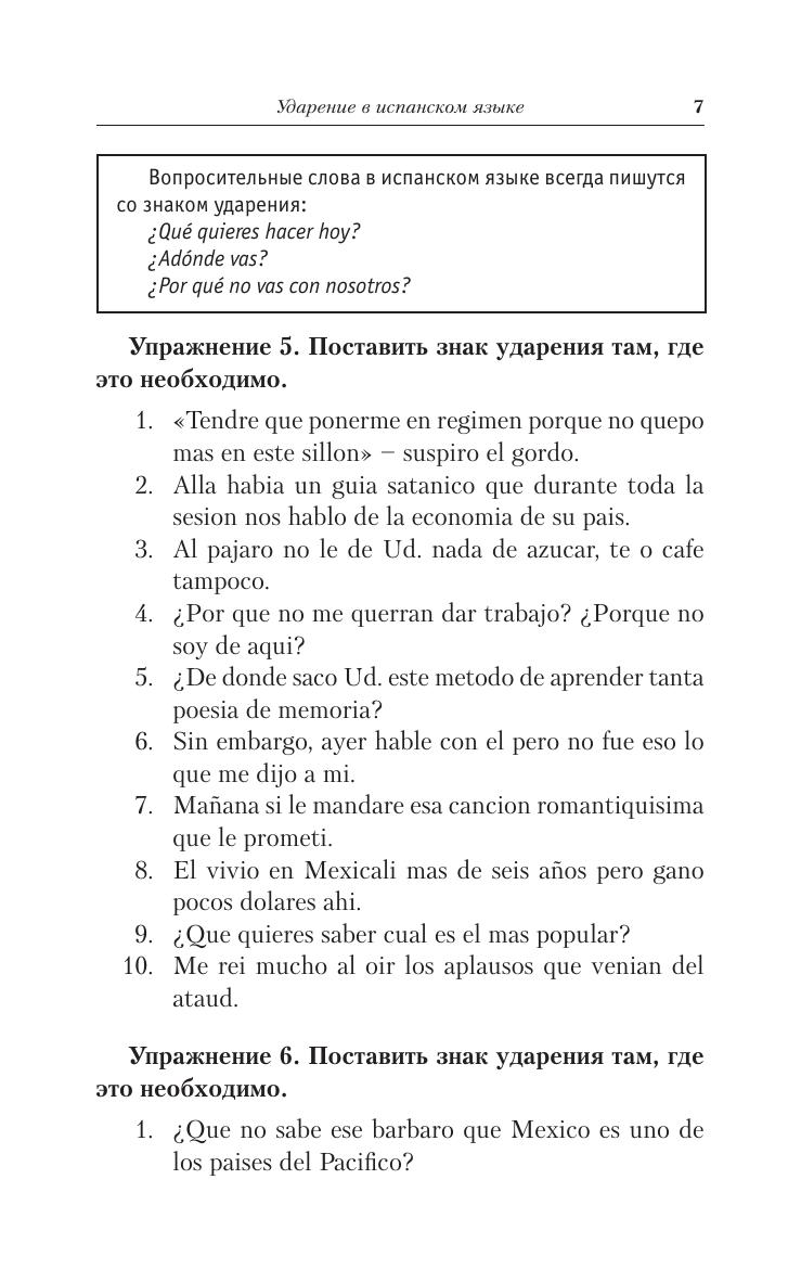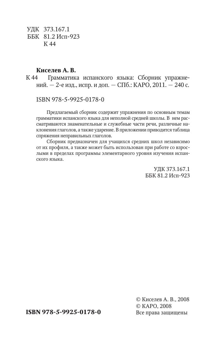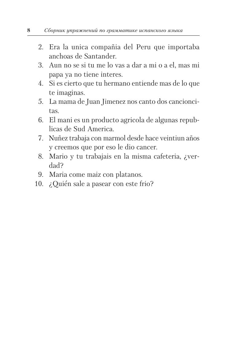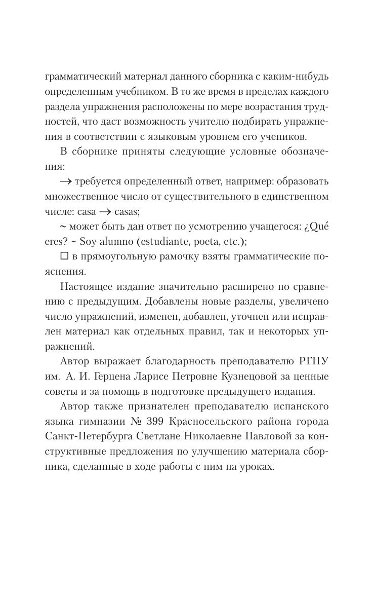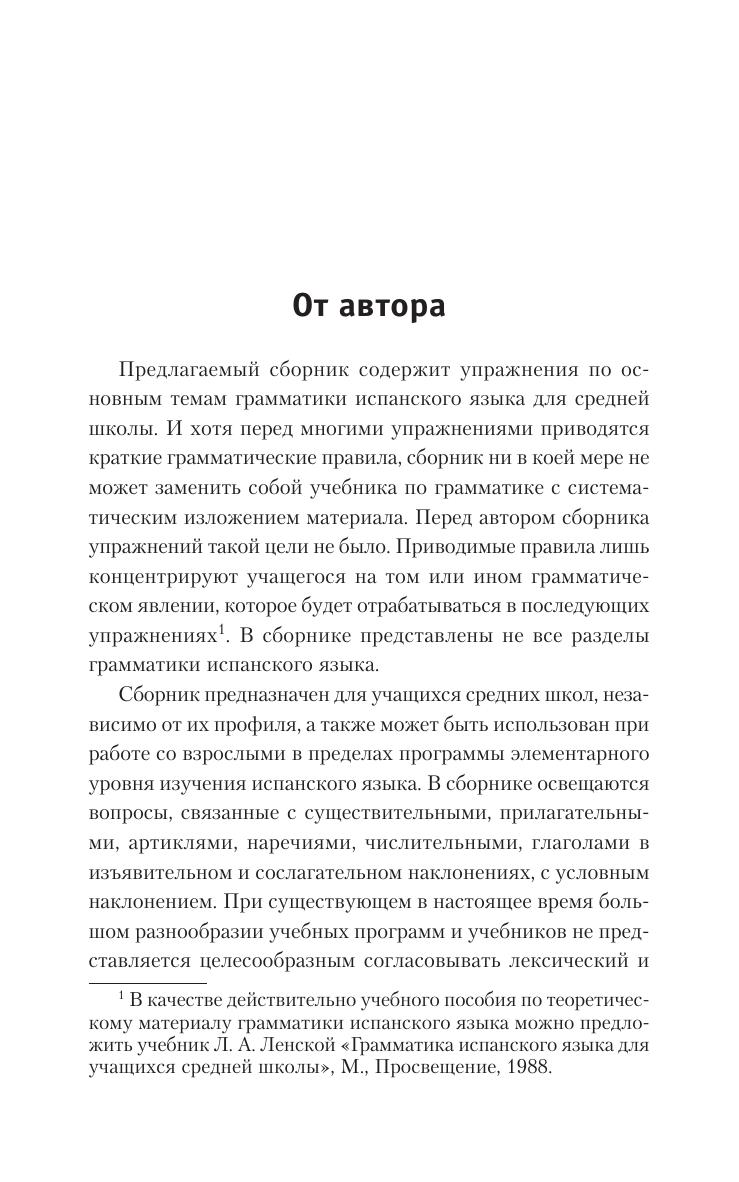 Предлагаемый сборник содержит упражнения по основным темам грамматики испанского языка для неполной средней школы. В нем рассматриваются знаменательные и служебные части речи, различные наклонения глаголов, а также ударение. В приложении приводится таблица спряжения неправильных глаголов. Сборник предназначен для учащихся средних школ независимо от их профиля, а также может быть использован при работе со взрослыми в пределах программы элементарного уровня изучения испанского языка.