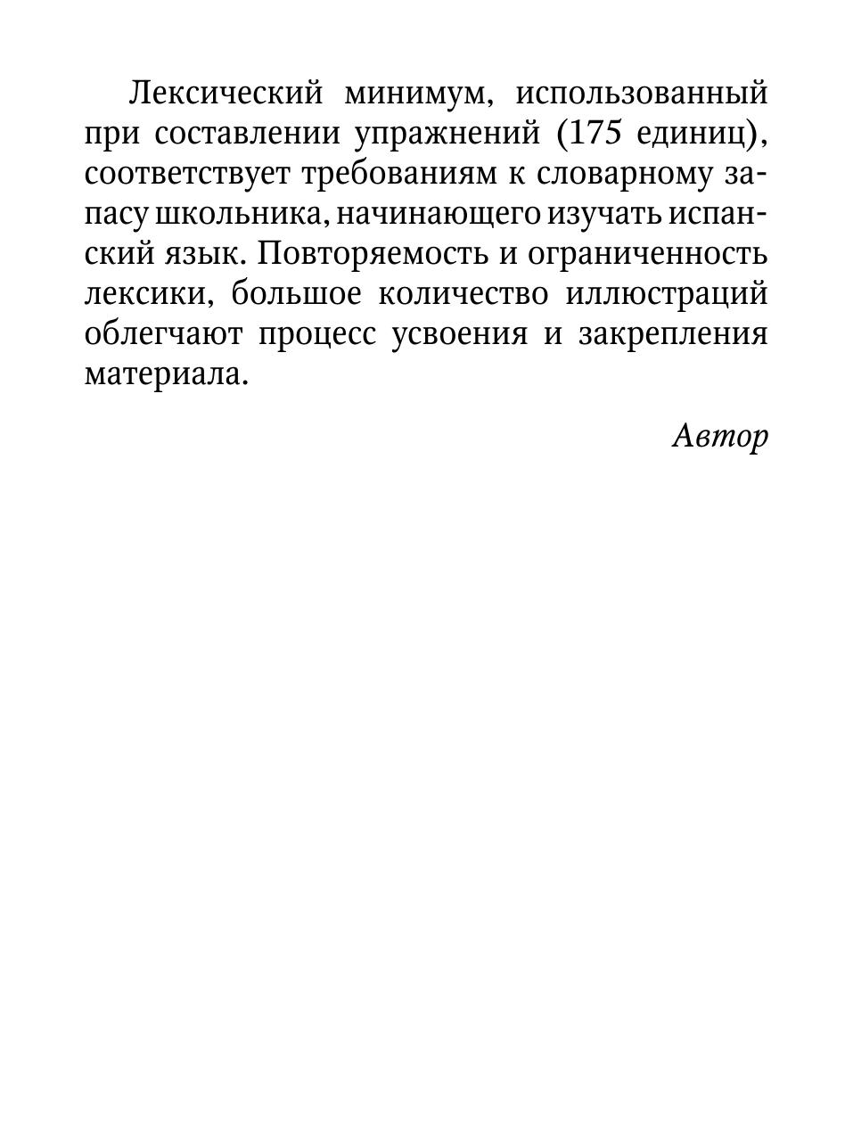 Лексический минимум, использованный при составлении упражнений (175 лексических единиц), соответствует требованию к словарному запасу школьника, начинающего изучать испанский язык.