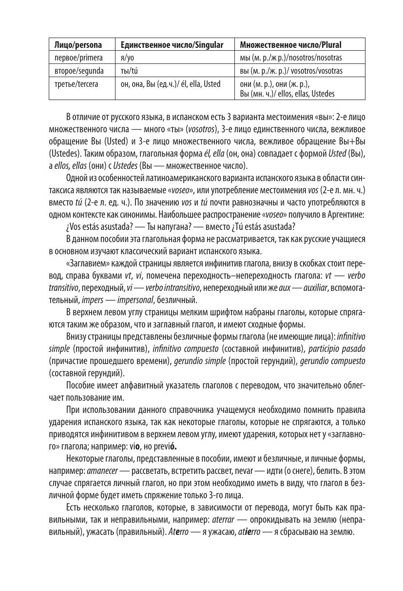 Как и во всех романских языках, главной частью речи в испанском языке является глагол. Множество испанских глаголов относится к нерегулярным (неправильным), они спрягаются не по правилам, их спряжение нужно учить наизусть. Эти глаголы и являются содержанием предлагаемого учебного пособия.