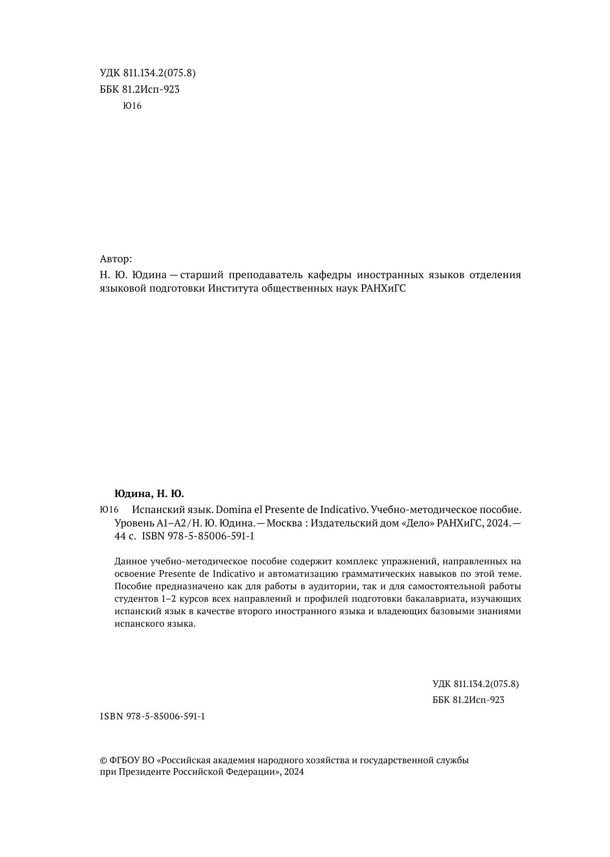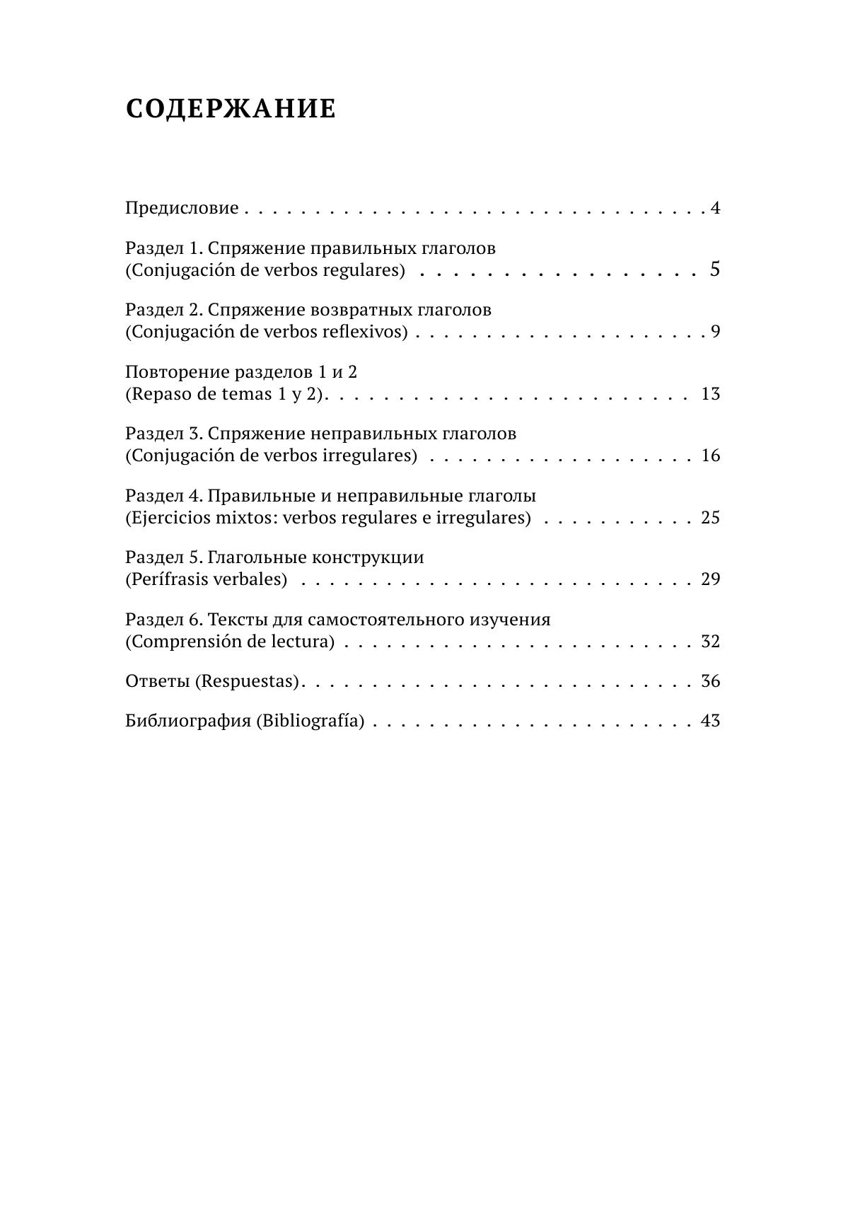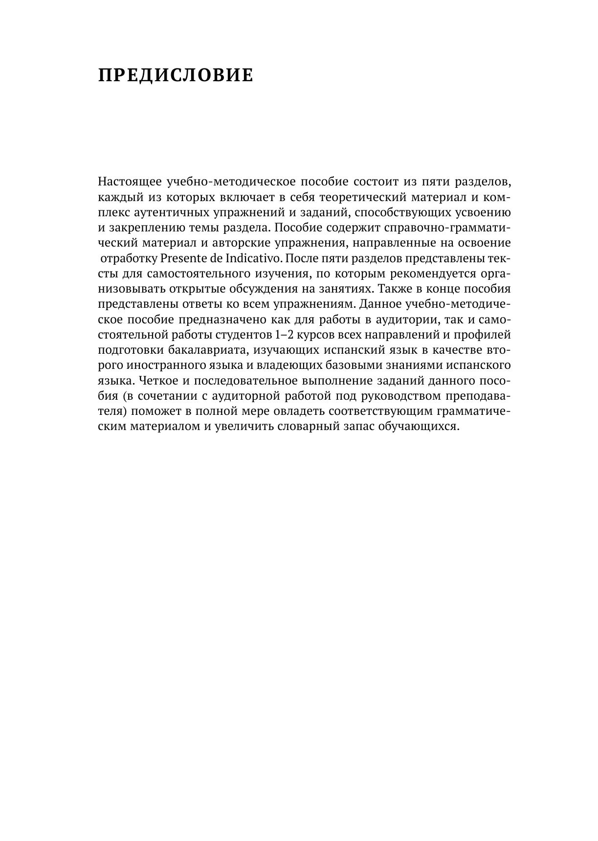 Данное учебно-методическое пособие содержит комплекс упражнений, направленных на освоение Presente de Indicativo и автоматизацию грамматических навыков по этой теме. Пособие предназначено как для работы в аудитории, так и для самостоятельной работы студентов 1–2 курсов всех направлений и профилей подготовки бакалавриата, изучающих испанский язык в качестве второго иностранного языка и владеющих базовыми знаниями испанского языка.