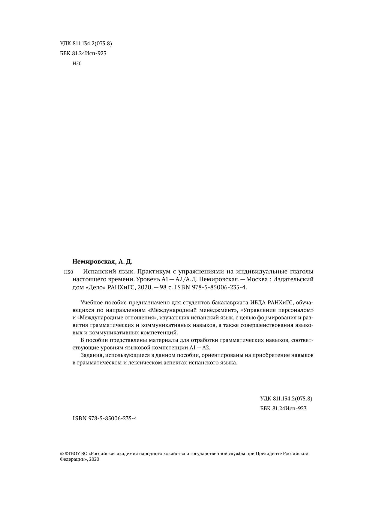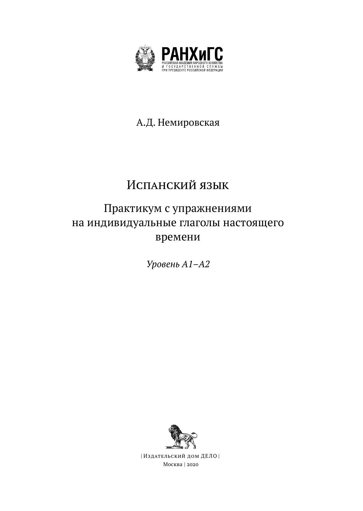 Учебное пособие предназначено для студентов бакалавриата ИБДА РАНХиГС, обучающихся по направлениям «Международный менеджмент», «Управление персоналом» и «Международные отношения», изучающих испанский язык, с целью формирования и развития грамматических и коммуникативных навыков, а также совершенствования языковых и коммуникативных компетенций. В пособии представлены материалы для отработки грамматических навыков, соответствующие уровням языковой компетенции A1 — A2. Задания, использующиеся в данном пособии, ориентированы на приобретение навыков в грамматическом и лексическом аспектах испанского языка.