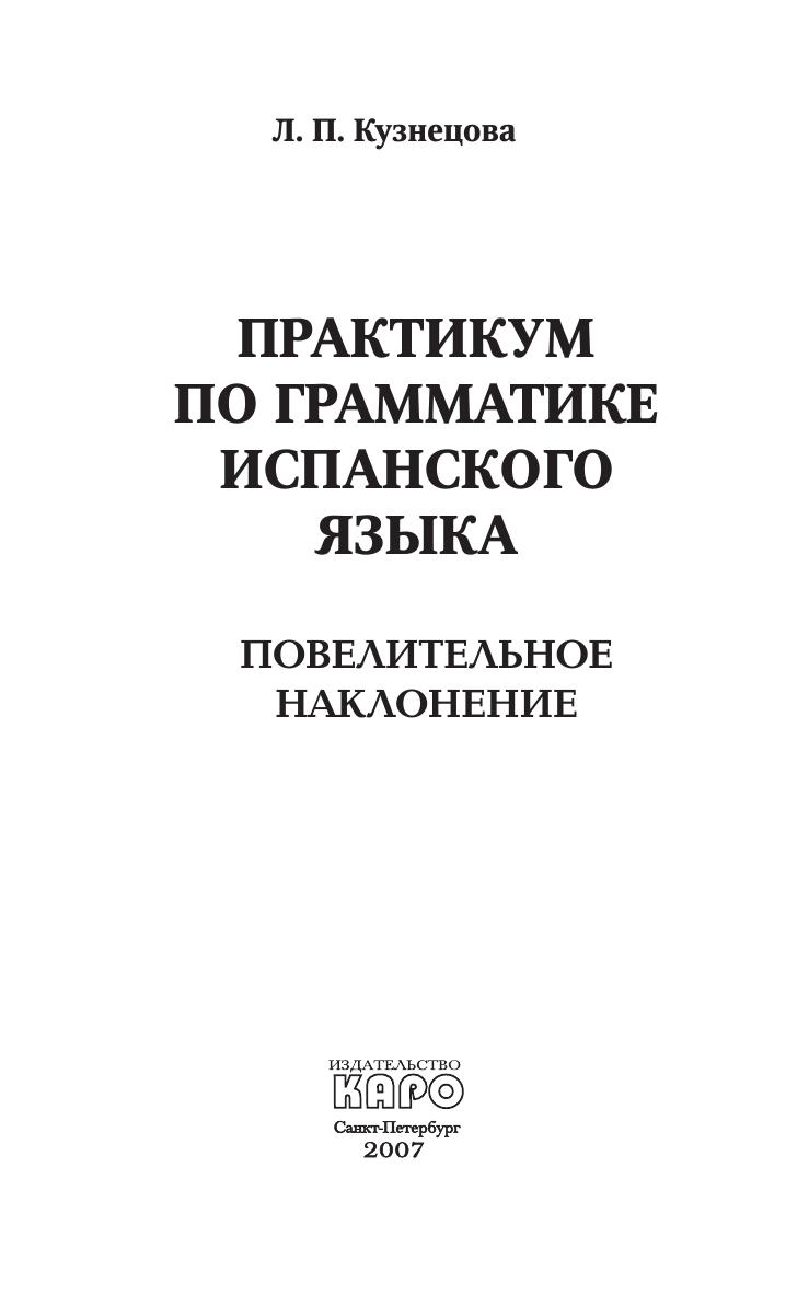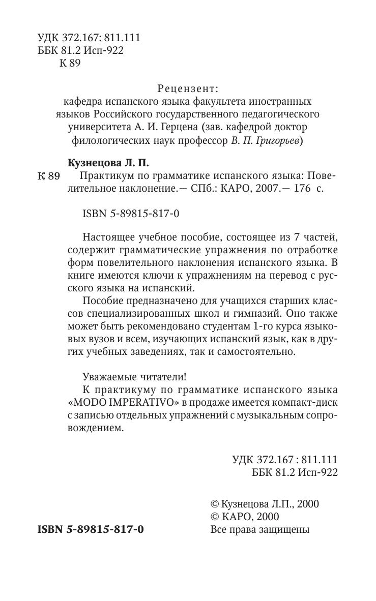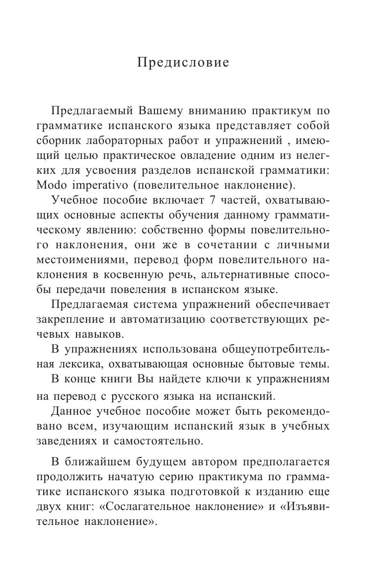 Настоящее учебное пособие, состоящее из 7 частей, содержит грамматические упражнения по отработке форм повелительного наклонения испанского языка. В книге имеются ключи к упражнениям на перевод с русского языка на испанский. Пособие предназначено для учащихся старших классов специализированных школ и гимназий. Оно также может быть рекомендовано студентам 1-го курса языковых вузов и всем, изучающих испанский язык, как в других учебных заведениях, так и самостоятельно.