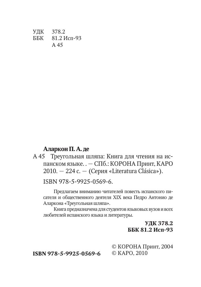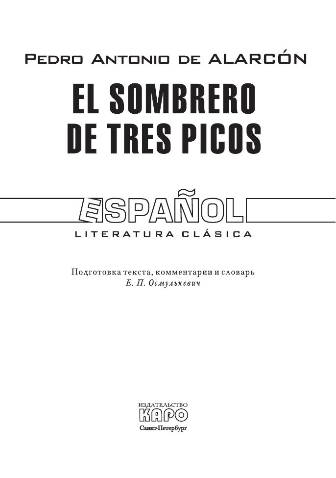 Предлагаем вниманию читателей повесть испанского писателя и общественного деятеля XIX века Педро Антонио де Аларкона «Треугольная шляпа». Книга предназначена для студентов языковых вузов и всех любителей испанского языка и литературы.