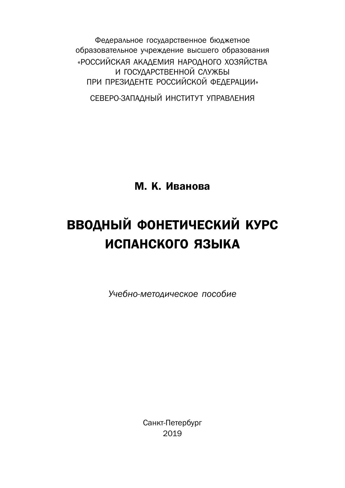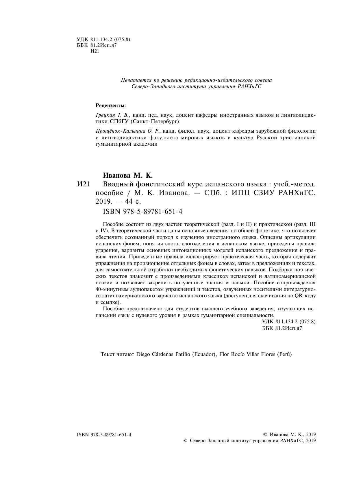 Пособие состоит из двух частей: теоретической (разд. I и II) и практической (разд. III и IV). В теоретической части даны основные сведения по общей фонетике, что позволяет обеспечить осознанный подход к изучению иностранного языка. Описаны артикуляции испанских фонем, понятия слога, слогоделения в испанском языке, приведены правила ударения, варианты основных интонационных моделей испанского предложения и правила чтения. Приведенные правила иллюстрирует практическая часть, которая содержит упражнения на произношение отдельных фонем в словах, затем в предложениях и текстах, для самостоятельной отработки необходимых фонетических навыков. Подборка поэтических текстов знакомит с произведениями классиков испанской и латиноамериканской поэзии и позволяет закрепить полученные знания и навыки. Пособие сопровождается 40-минутным аудиопакетом упражнений и текстов, озвученных носителями литературного латиноамериканского варианта испанского языка (доступен для скачивания по QR-коду и ссылке). Пособие предназначено для студентов высшего учебного заведения, изучающих испанский язык с нулевого уровня в рамках гуманитарной специальности.