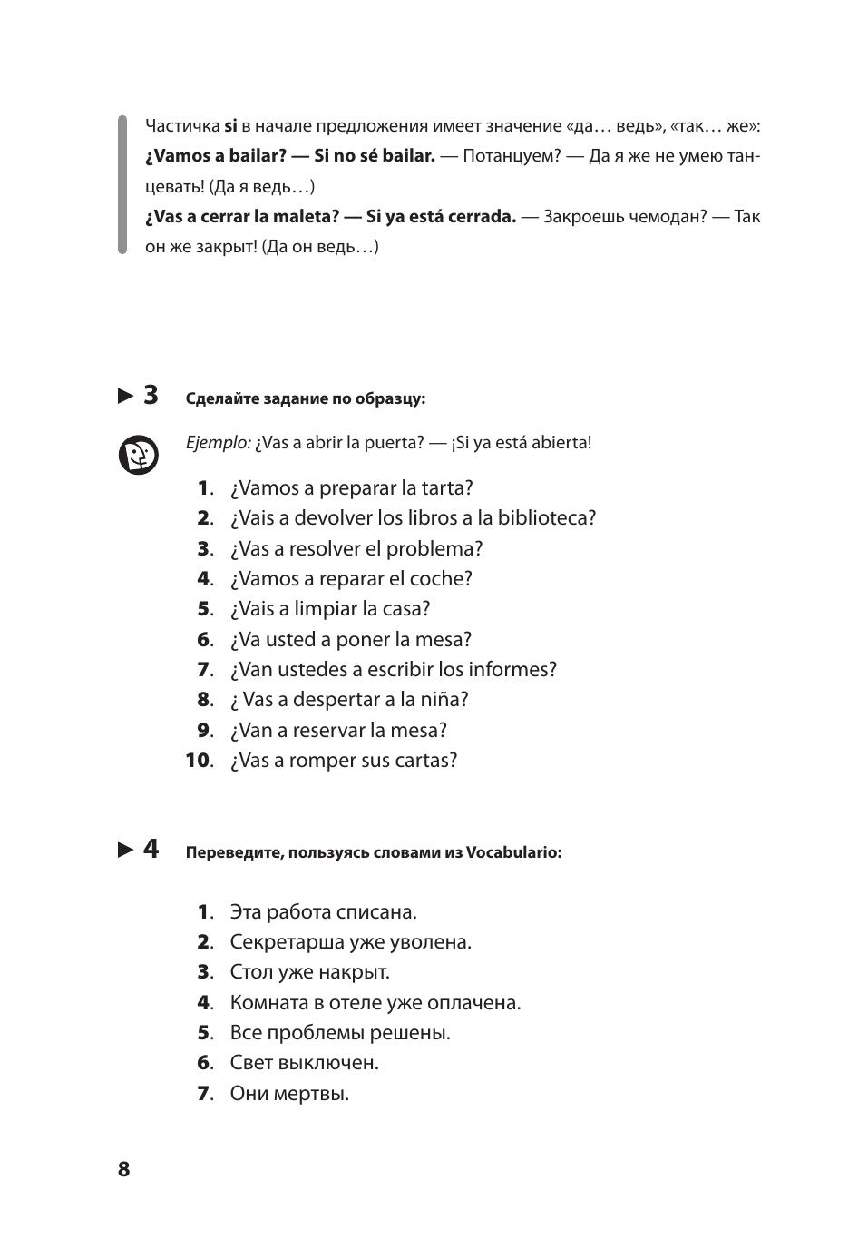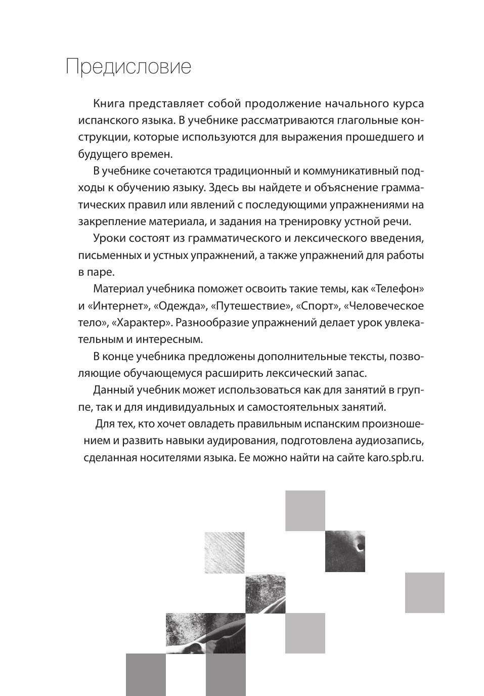 Книга представляет собой продолжение начального курса испанского языка. В учебнике рассматриваются глагольные конструкции, которые используются для выражения прошедшего и будущего времен. Книга адресована всем желающим изучать испанский язык: как студентам языковых курсов, так и тем, кто изучает его самостоятельно. Также может послужить отличным источником дополнительных заданий для студентов, обучающихся в вузах.