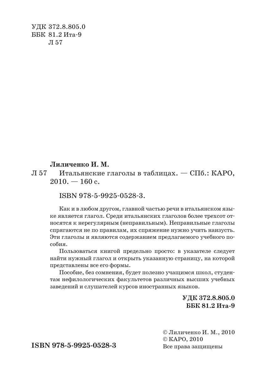 Как и в любом другом, главной частью речи в итальянском языке является глагол. Среди итальянских глаголов более трехсот относятся к нерегулярным (неправильным). Неправильные глаголы спрягаются не по правилам, их спряжение нужно учить наизусть. Эти глаголы и являются содержанием предлагаемого учебного пособия.Пользоваться книгой предельно просто: в указателе следует найти нужный глагол и открыть указанную страницу, на которой представлены все его формы.Пособие, без сомнения, будет полезно учащимся школ, студентам нефилологических факультетов различных высших учебных заведений и слушателей курсов иностранных языков.