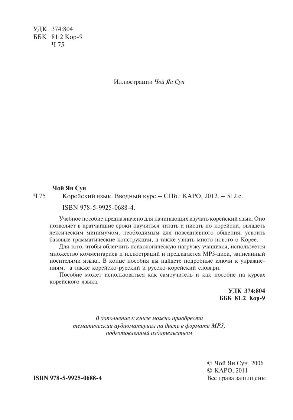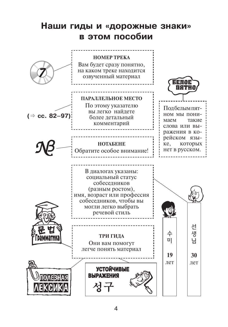 Учебное пособие предназначено для начинающих изучать корейский язык. Оно позволяет в кратчайшие сроки научиться читать и писать по-корейски, овладеть лексическим минимумом, необходимым для повседневного общения, усвоить базовые грамматические конструкции, а также узнать много нового о Корее. Для того, чтобы облегчить психологическую нагрузку учащихся, используется множество комментариев и иллюстраций и предлагается MP3-диск, записанный носителями языка. В конце пособия вы найдете подробные ключи к упражнениям, а также корейско-русский и русско-корейский словари. Пособие может использоваться как самоучитель и как пособие на курсах корейского языка.