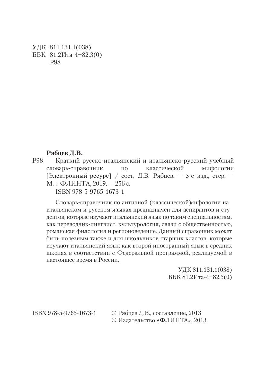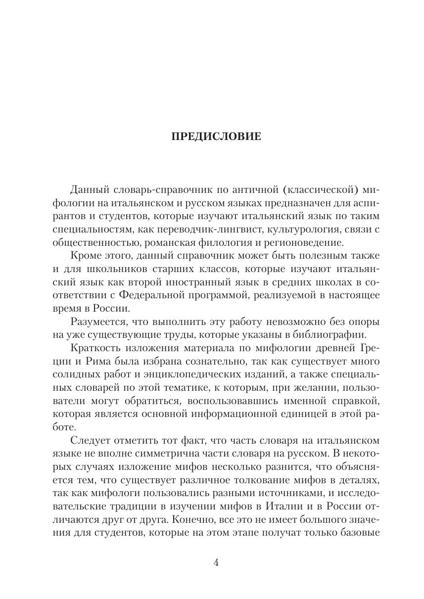 Словарь-справочник по античной (классической)м ифологии на итальянском и русском языках предназначен для аспирантов и студентов, которые изучают итальянский язык по таким специальностям, как переводчик-лингвист, культурология, связи с общественностью, романская филология и регионоведение. Данный справочник может быть полезным также и для школьников старших классов, которые изучают итальянский язык как второй иностранный язык в средних школах в соответствии с Федеральной программой, реализуемой в настоящее время в России.