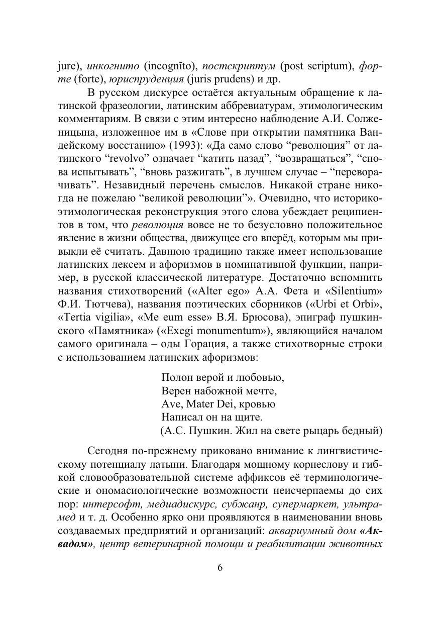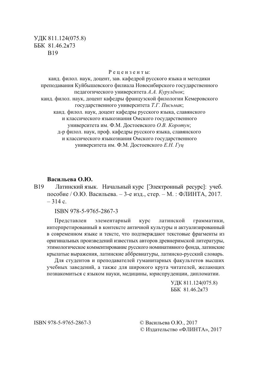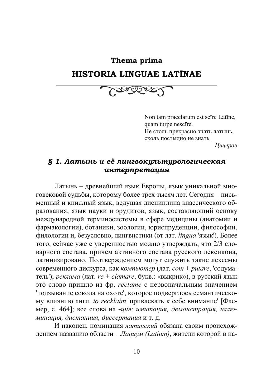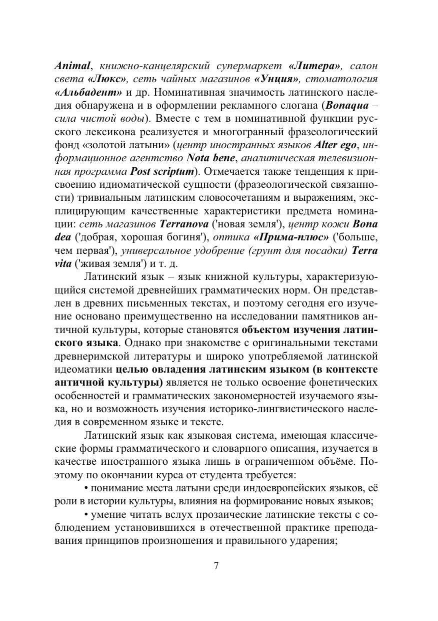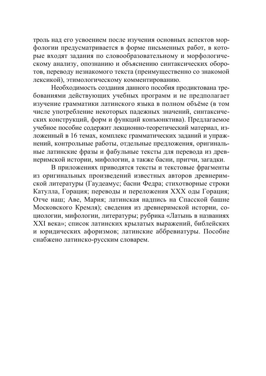 Представлен элементарный курс латинской грамматики, интерпретированный в контексте античной культуры и актуализированный в современном языке и тексте, что подтверждают текстовые фрагменты из оригинальных произведений известных авторов древнеримской литературы, этимологическое комментирование русского номинативного фонда, латинские крылатые выражения, латинские аббревиатуры, латинско-русский словарь.