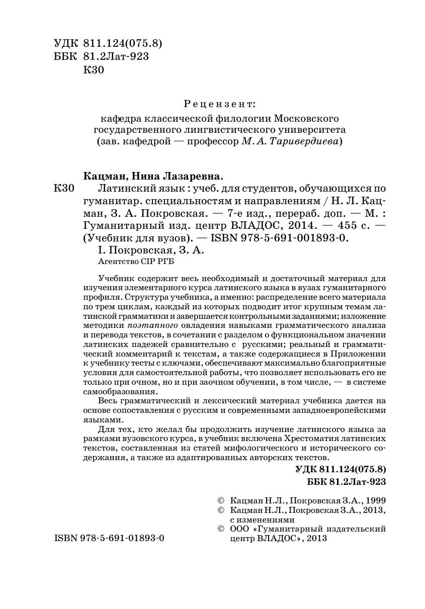 Для тех, кто желал бы продолжить изучение латинского языка за рамками вузовского курса, в учебник включена Хрестоматия латинских текстов, составленная из статей мифологического и исторического содержания, а также из адаптированных авторских текстов.