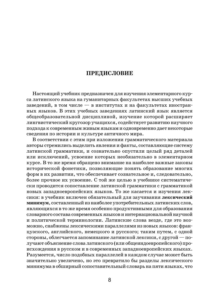 Учебник содержит весь необходимый и достаточный материал для изучения элементарного курса латинского языка в вузах гуманитарного профиля. Структура учебника, а именно: распределение всего материала по трем циклам, каждый из которых подводит итог крупным темам латинской грамматики и завершается контрольными заданиями; изложение методики поэтапного овладения навыками грамматического анализа и перевода текстов, в сочетании с разделом о функциональном значении латинских падежей сравнительно с русскими; реальный и грамматический комментарий к текстам, а также содержащиеся в Приложении к учебнику тесты с ключами, обеспечивают максимально благоприятные условия для самостоятельной работы, что позволяет использовать его не только при очном, но и при заочном обучении, в том числе, — в системе самообразования.