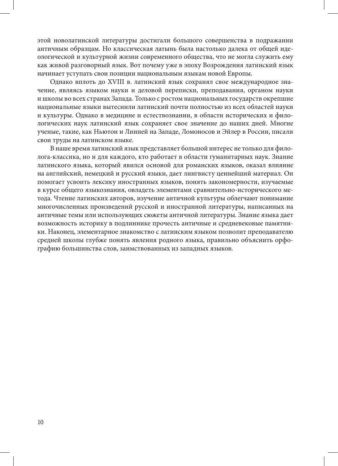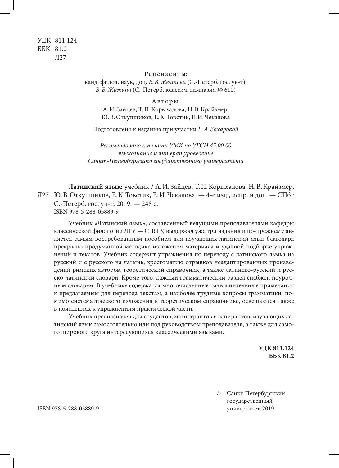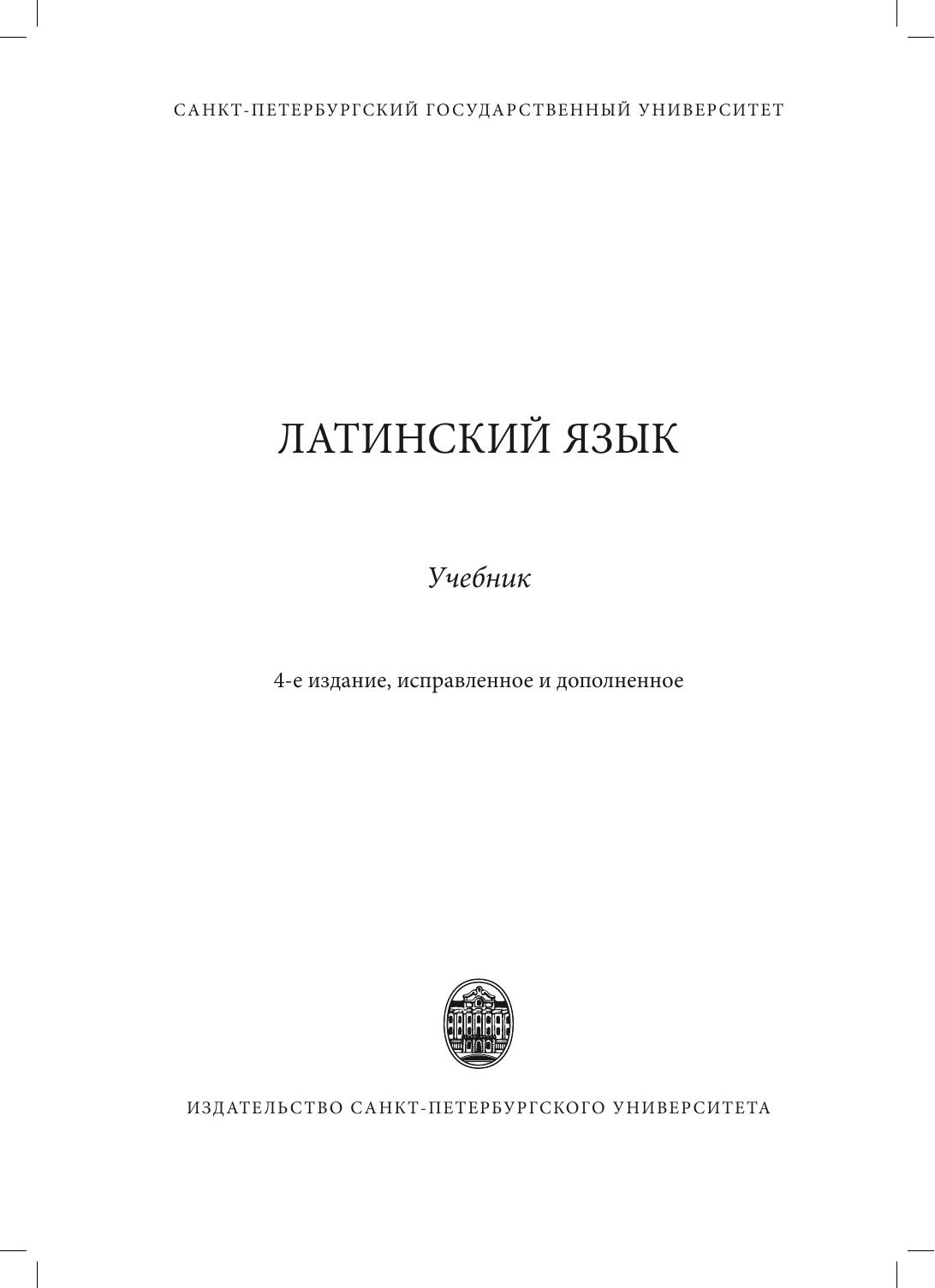 Учебник «Латинский язык», составленный ведущими преподавателями кафедры классической филологии ЛГУ — СПбГУ, выдержал уже три издания и по-прежнему является самым востребованным пособием для изучающих латинский язык благодаря прекрасно продуманной методике изложения материала и удачной подборке упражнений и текстов. Учебник содержит упражнения по переводу с латинского языка на русский и с русского на латынь, хрестоматию отрывков неадаптированных произведений римских авторов, теоретический справочник, а также латинско-русский и русско-латинский словари. Кроме того, каждый грамматический раздел снабжен поурочным словарем. В учебнике содержатся многочисленные разъяснительные примечания к предлагаемым для перевода текстам, а наиболее трудные вопросы грамматики, помимо систематического изложения в теоретическом справочнике, освещаются также в пояснениях к упражнениям практической части. Учебник предназначен для студентов, магистрантов и аспирантов, изучающих латинский язык самостоятельно или под руководством преподавателя, а также для самого широкого круга интересующихся классическими языками.