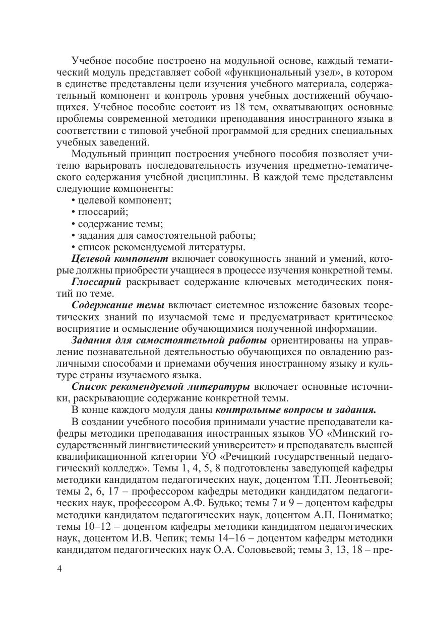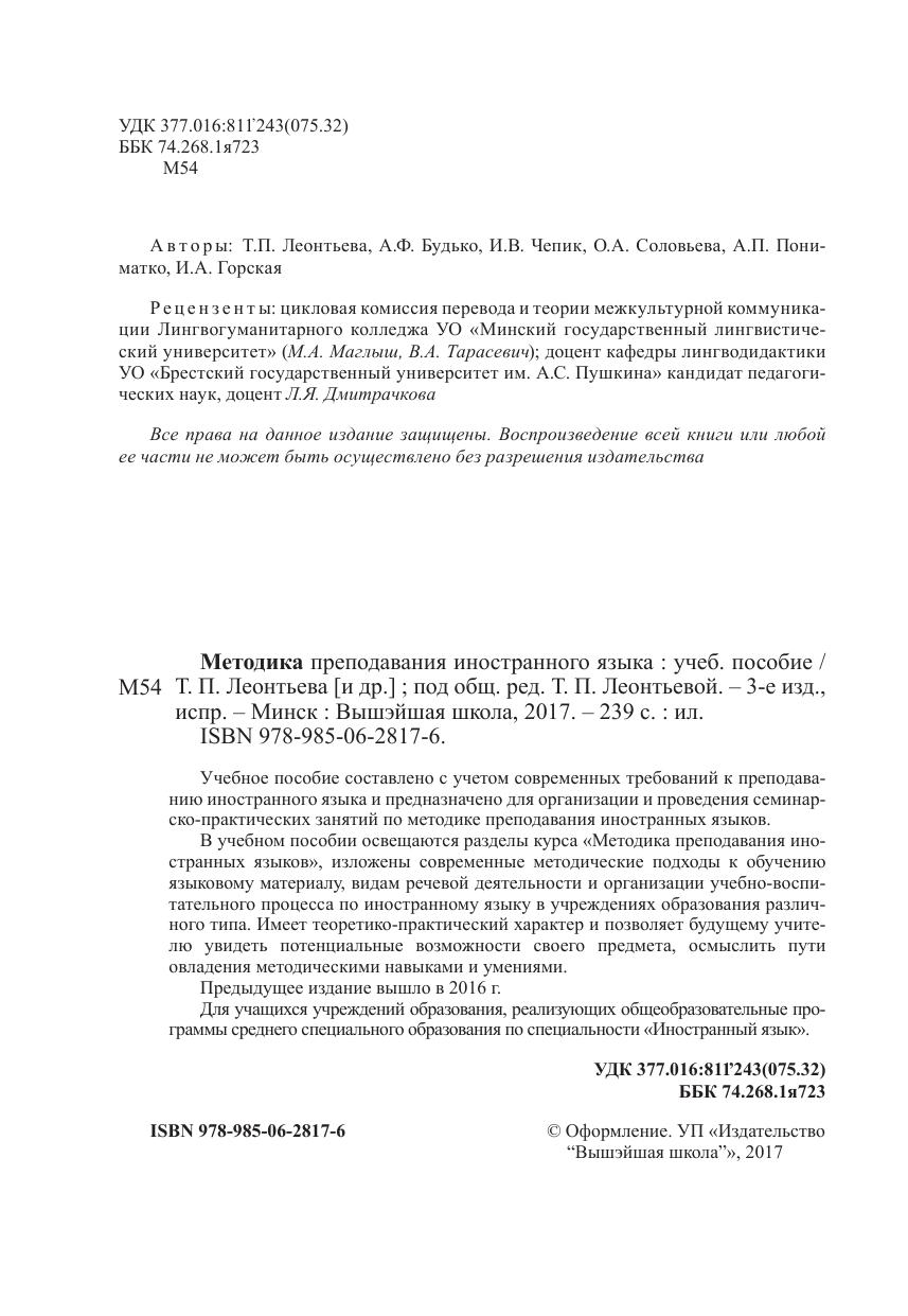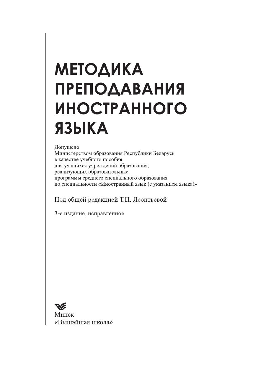 Учебное пособие составлено с учетом современных требований к преподаванию иностранного языка и предназначено для организации и проведения семинарско-практических занятий по методике преподавания иностранных языков. В учебном пособии освещаются разделы курса «Методика преподавания иностранных языков», изложены современные методические подходы к обучению языковому материалу, видам речевой деятельности и организации учебно-воспитательного процесса по иностранному языку в учреждениях образования различного типа. Имеет теоретико-практический характер и позволяет будущему учителю увидеть потенциальные возможности своего предмета, осмыслить пути овладения методическими навыками и умениями. Предыдущее издание вышло в 2016 г. Для учащихся учреждений образования, реализующих общеобразовательные программы среднего специального образования по специальности «Иностранный язык».
