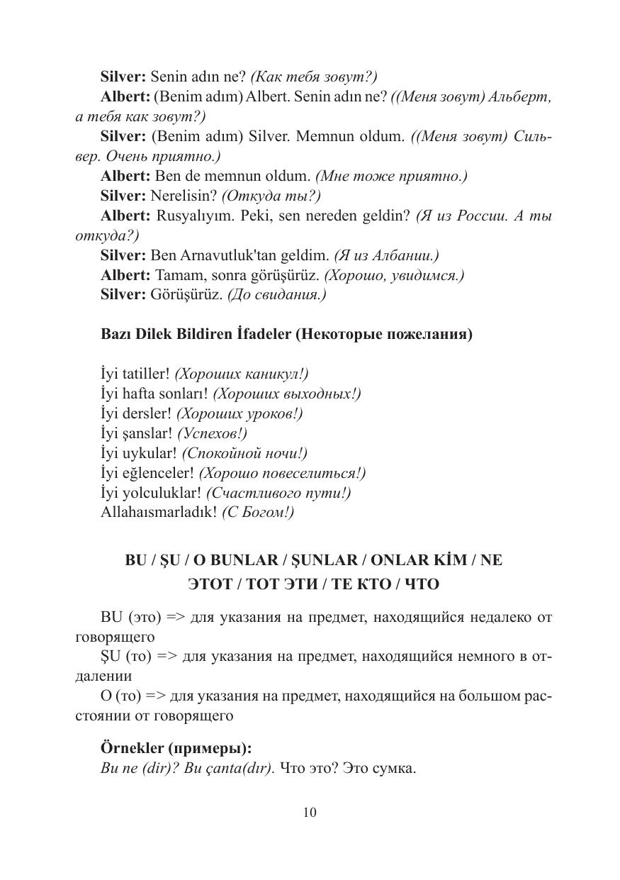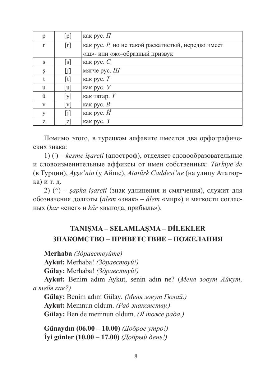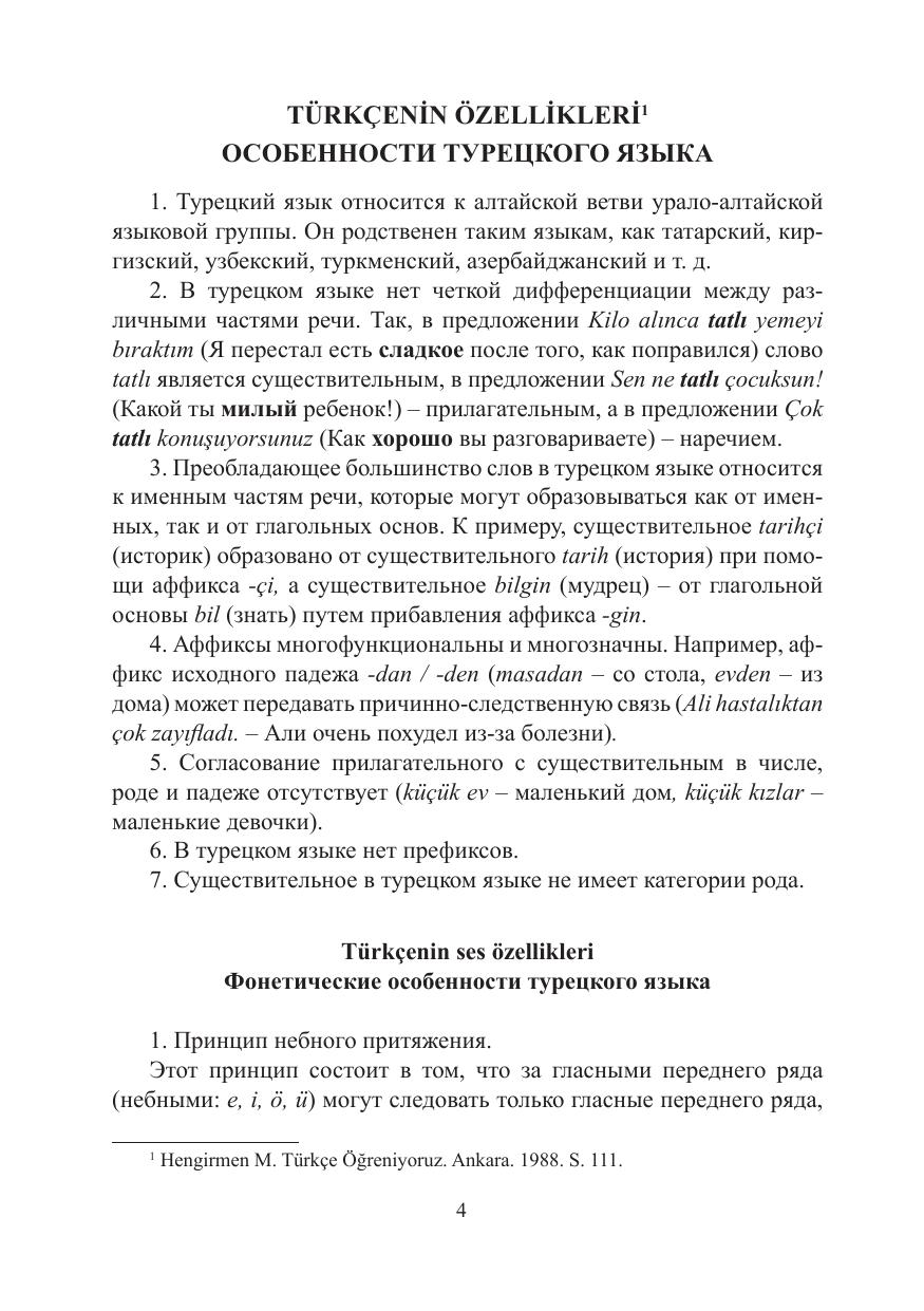 В настоящей книге представлена грамматика начального курса современного турецкого языка. Главы содержат в себе тексты для чтения, соответствующие темам разделов, грамматический материал на русском языке, примеры с переводами и упражнения на закрепление темы. Издание рассчитано в первую очередь на студентов-регионоведов, но будет, несомненно, полезно всем, кто совершенствует свой турецкий язык. Оно также может быть использовано как самоучитель и справочное пособие