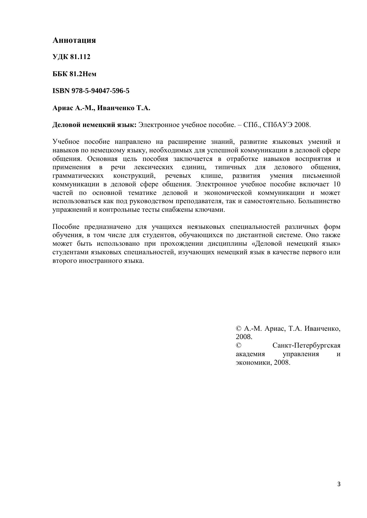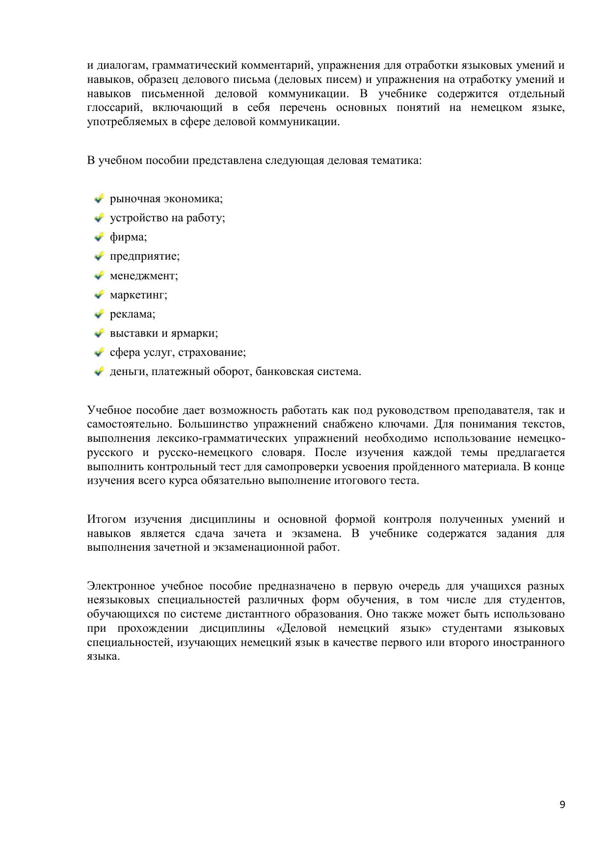 Учебное пособие направлено на расширение знаний, развитие языковых умений и навыков по немецкому языку, необходимых для успешной коммуникации в деловой сфере общения. Основная цель пособия заключается в отработке навыков восприятия и применения в речи лексических единиц, типичных для делового общения, грамматических конструкций, речевых клише, развития умения письменной коммуникации в деловой сфере общения. Электронное учебное пособие включает 10 частей по основной тематике деловой и экономической коммуникации и может использоваться как под руководством преподавателя, так и самостоятельно. Большинство упражнений и контрольные тесты снабжены ключами. Пособие предназначено для учащихся неязыковых специальностей различных форм обучения, в том числе для студентов, обучающихся по дистантной системе. Оно также может быть использовано при прохождении дисциплины «Деловой немецкий язык» студентами языковых специальностей, изучающих немецкий язык в качестве первого или второго иностранного языка. Электронное учебное пособие для дистанционного обучения