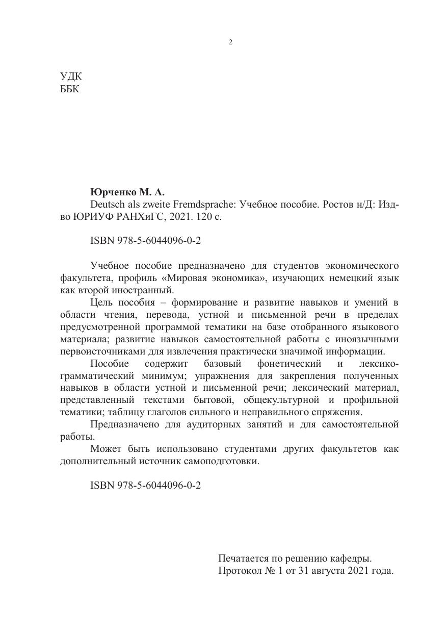 Учебное пособие предназначено для студентов экономического факультета, профиль «Мировая экономика», изучающих немецкий язык как второй иностранный. Цель пособия – формирование и развитие навыков и умений в области чтения, перевода, устной и письменной речи в пределах предусмотренной программой тематики на базе отобранного языкового материала; развитие навыков самостоятельной работы с иноязычными первоисточниками для извлечения практически значимой информации. Пособие содержит базовый фонетический и лексикограмматический минимум; упражнения для закрепления полученных навыков в области устной и письменной речи; лексический материал, представленный текстами бытовой, общекультурной и профильной тематики; таблицу глаголов сильного и неправильного спряжения. Предназначено для аудиторных занятий и для самостоятельной работы. Может быть использовано студентами других факультетов как дополнительный источник самоподготовки.