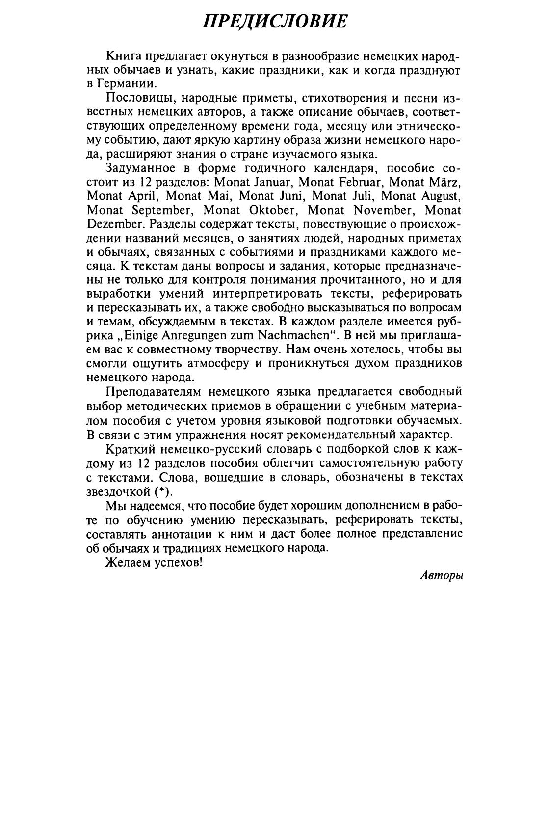 На немецком языке. Знакомит с праздниками и обычаями в Германии. Содержит тексты культуроведческого характера, вопросы и задания к ним, стихотворения, песни, описание народных примет, а также материалы для творчества. Снабжено кратким немецко-русским словарем. Для студентов вузов, учащихся гимназий, лицеев, колледжей, а также широкого круга лиц, изучающих немецкий язык.