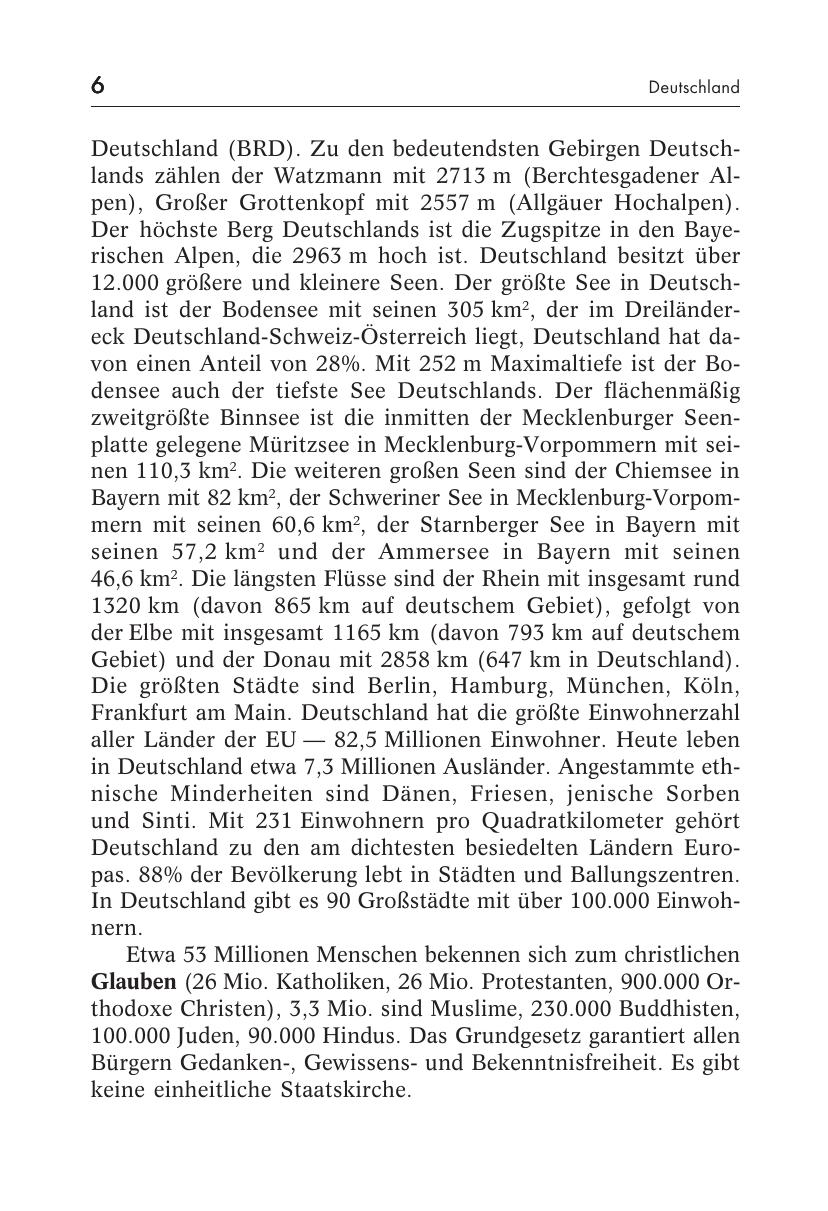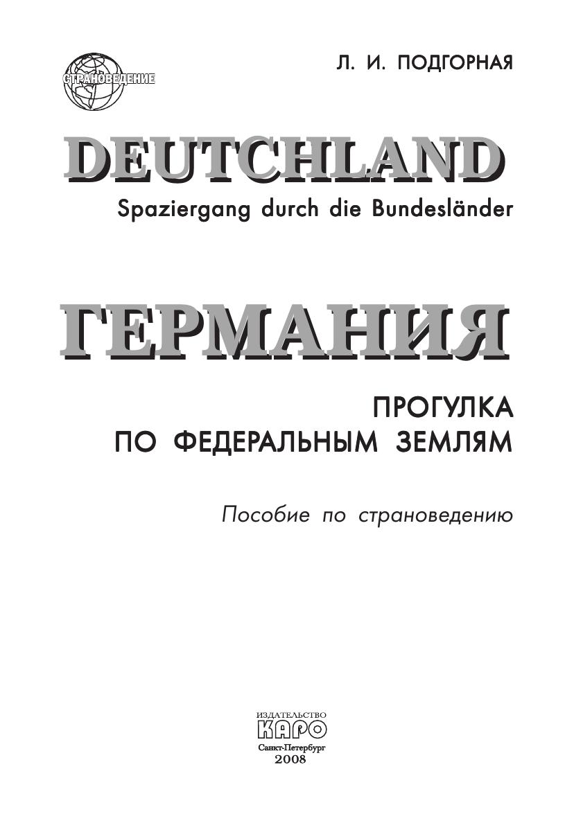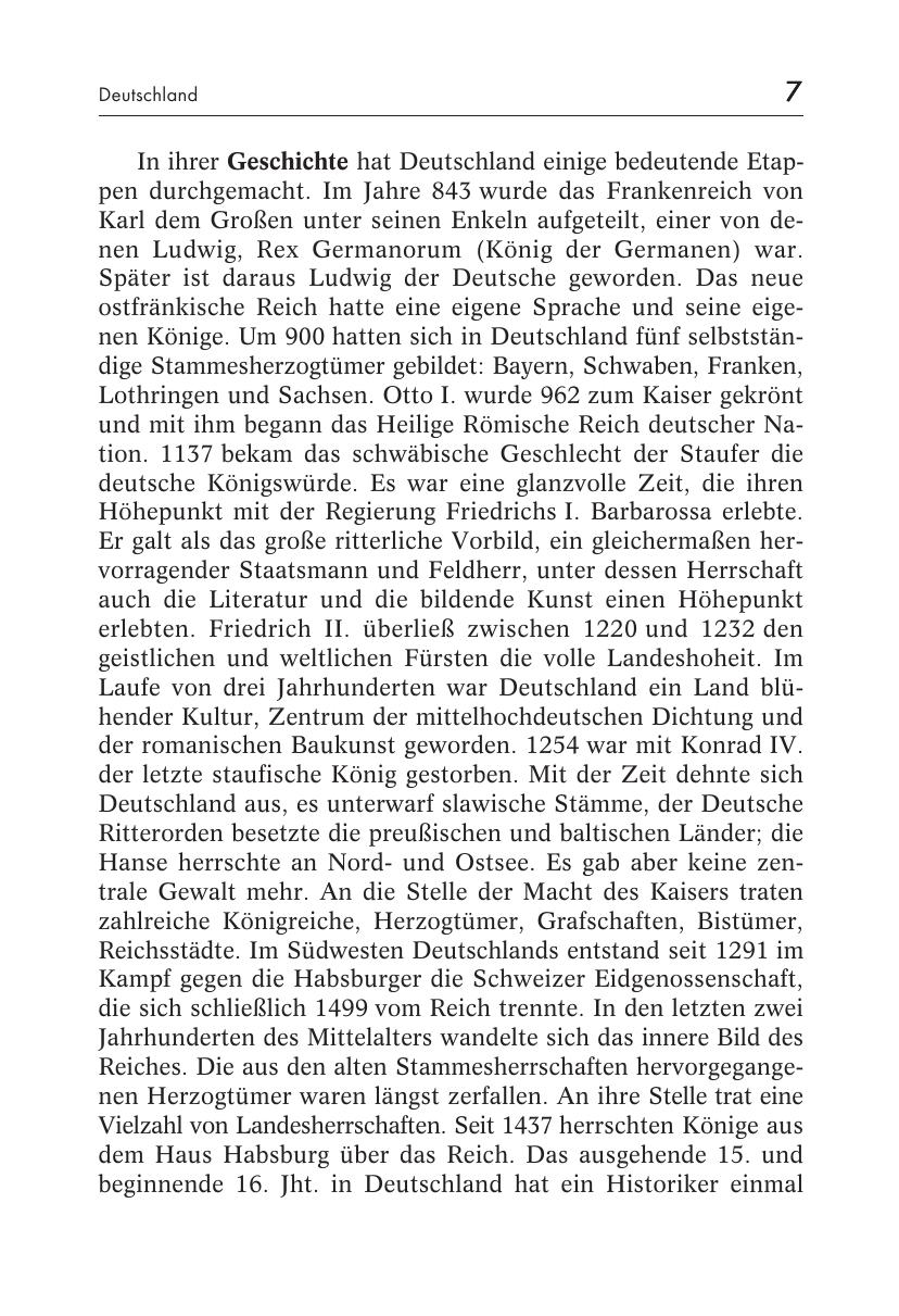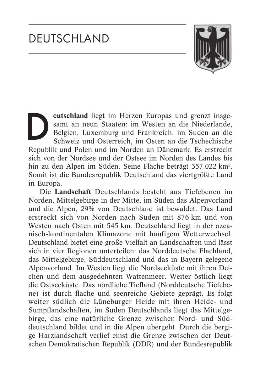 Данный учебник по страноведению Германии предназначен в первую очередь для школьников старших классов, изучающих немецкий язык, для студентов, а также для всех, кого интересует прошлое и настоящее Германии. Книга охватывает период с IX века до наших дней. Она состоит из 17 глав. В первой главе читателю кратко представляется Федеративная Республика Германия. Эта глава, как и все последующие, построена по следующему принципу: географическое положение страны, население, исторический обзор, современная Германия, ее управление, конституция, герб, гимн, армия, язык, экономика, система образования. В остальных 16 главах говорится (по тому же принципу) о каждой из 16 феде) ральных земель. Причем в этих главах большое внимание уделя) ется рассказу о достопримечательностях каждой из земель, ее архитектурных памятниках, музеях.
