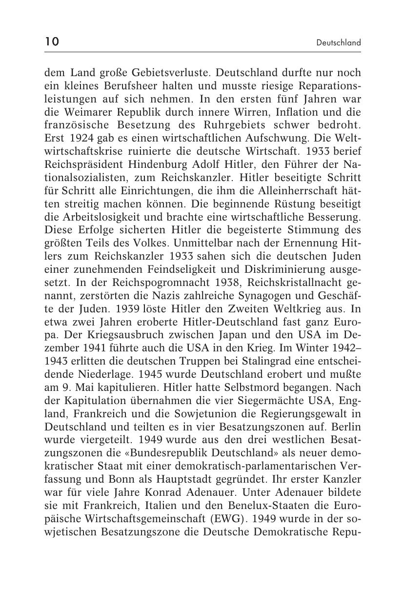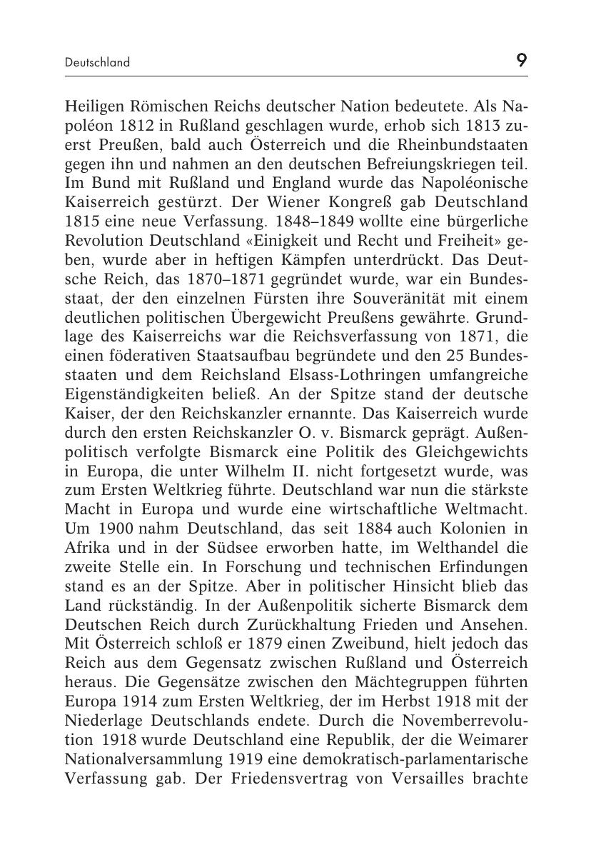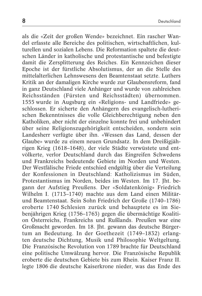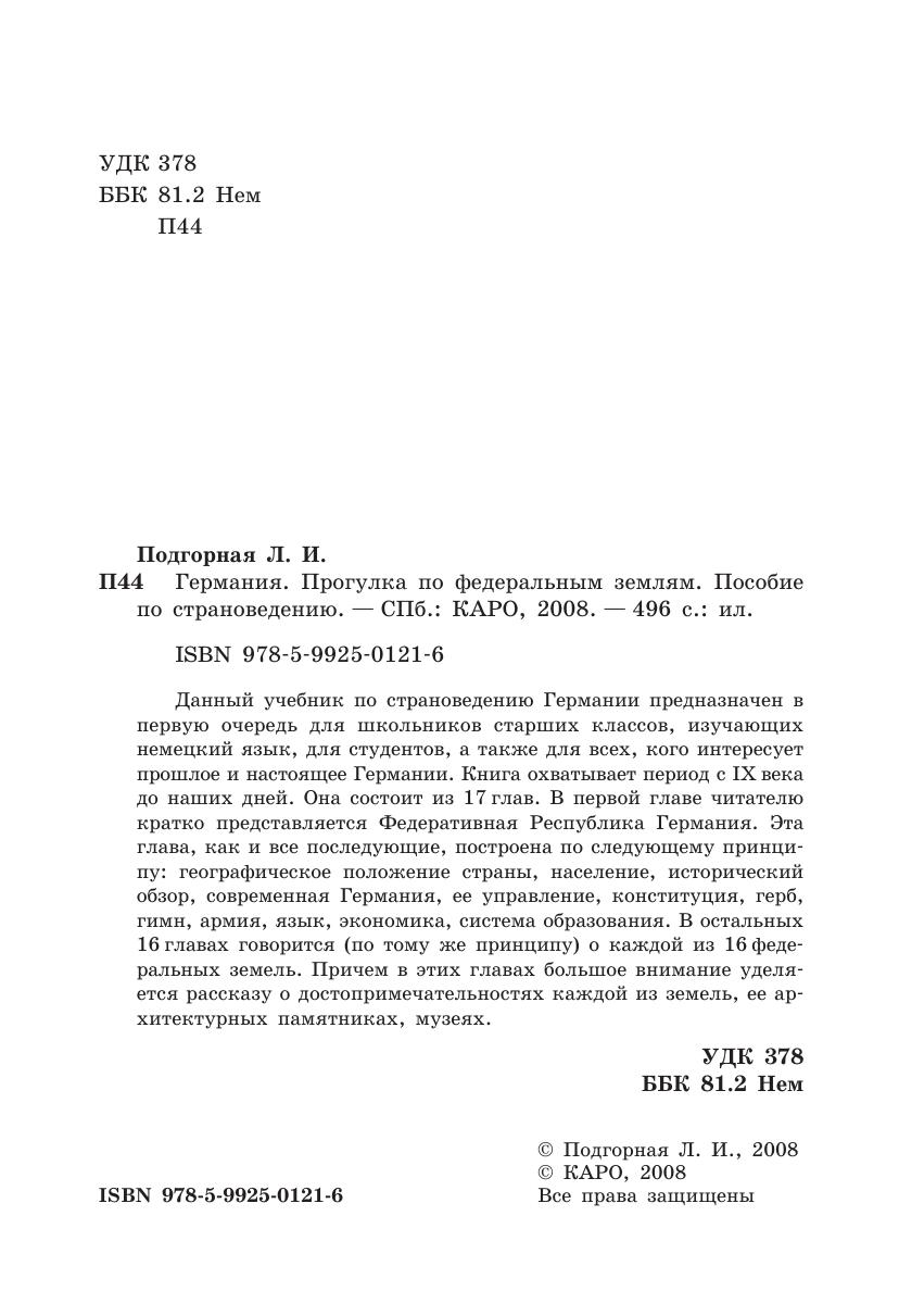 Данный учебник по страноведению Германии предназначен в первую очередь для школьников старших классов, изучающих немецкий язык, для студентов, а также для всех, кого интересует прошлое и настоящее Германии. Книга охватывает период с IX века до наших дней. Она состоит из 17 глав. В первой главе читателю кратко представляется Федеративная Республика Германия. Эта глава, как и все последующие, построена по следующему принципу: географическое положение страны, население, исторический обзор, современная Германия, ее управление, конституция, герб, гимн, армия, язык, экономика, система образования. В остальных 16 главах говорится (по тому же принципу) о каждой из 16 феде) ральных земель. Причем в этих главах большое внимание уделя) ется рассказу о достопримечательностях каждой из земель, ее архитектурных памятниках, музеях.