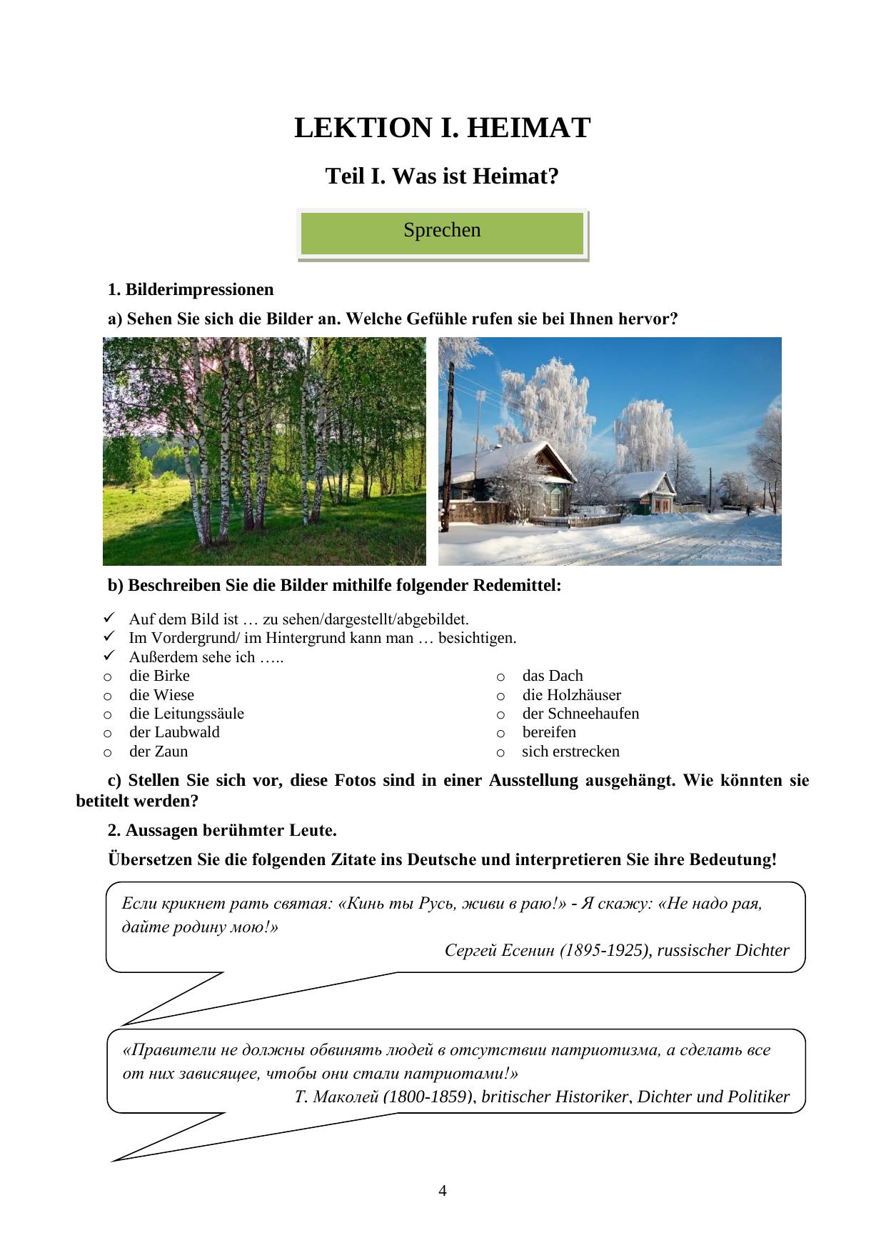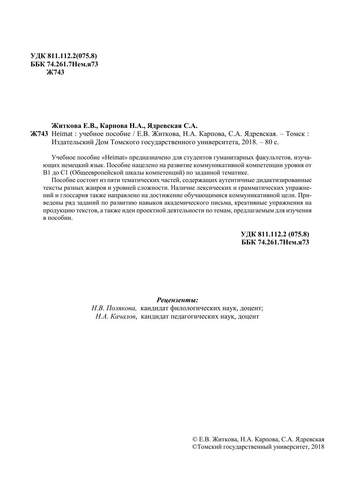 Учебное пособие «Heimat» предназначено для студентов гуманитарных факультетов, изучающих немецкий язык. Пособие нацелено на развитие коммуникативной компетенции уровня от В1 до С1 (Общеевропейской шкалы компетенций) по заданной тематике. Пособие состоит из пяти тематических частей, содержащих аутентичные дидактизированные тексты разных жанров и уровней сложности. Наличие лексических и грамматических упражнений и глоссария также направлено на достижение обучающимися коммуникативной цели. Приведены ряд заданий по развитию навыков академического письма, креативные упражнения на продукцию текстов, а также идеи проектной деятельности по темам, предлагаемым для изучения в пособии.