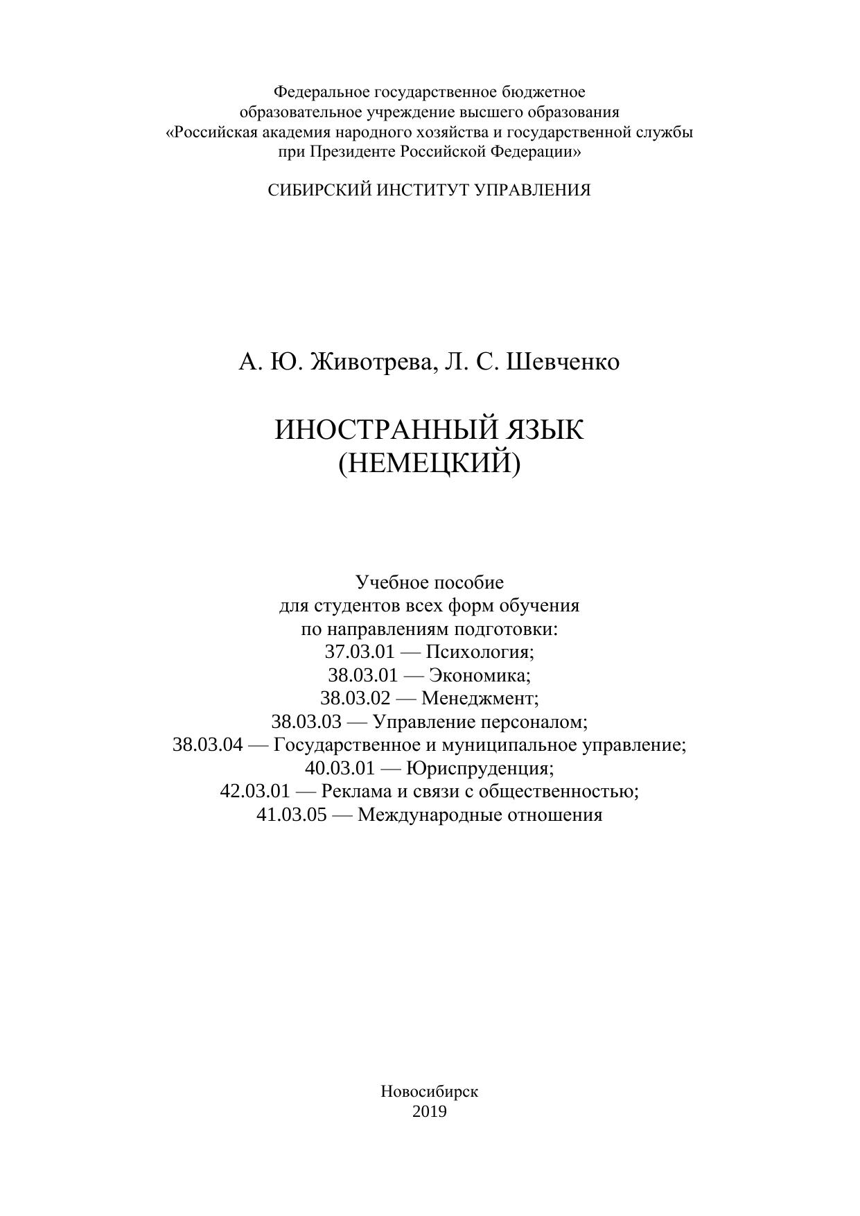 Учебное пособие призвано способствовать приобретению языковых и коммуникативных навыков на первом этапе обучения, отвечает современным требованиям подготовки будущих специалистов в получении высшего образования. Материалы рассчитаны на студентов с различным уровнем базовых знаний по немецко-му языку и ориентированы на обучение всем видам речевой деятельности: говорению, ауди-рованию, письму, чтению, переводу. Предназначено для студентов всех форм обучения по направлениям подготовки 37.03.01 — Психология, 38.03.01 — Экономика, 38.03.02 — Менеджмент, 38.03.03 — Управ-ление персоналом, 38.03.04 — Государственное и муниципальное управление, 40.03.01 — Юриспруденция, 42.03.01 — Реклама и связи с общественностью. Также может быть исполь-зовано студентами направления 41.03.05 — Международные отношения при изучении немецкого языка как второго иностранного.