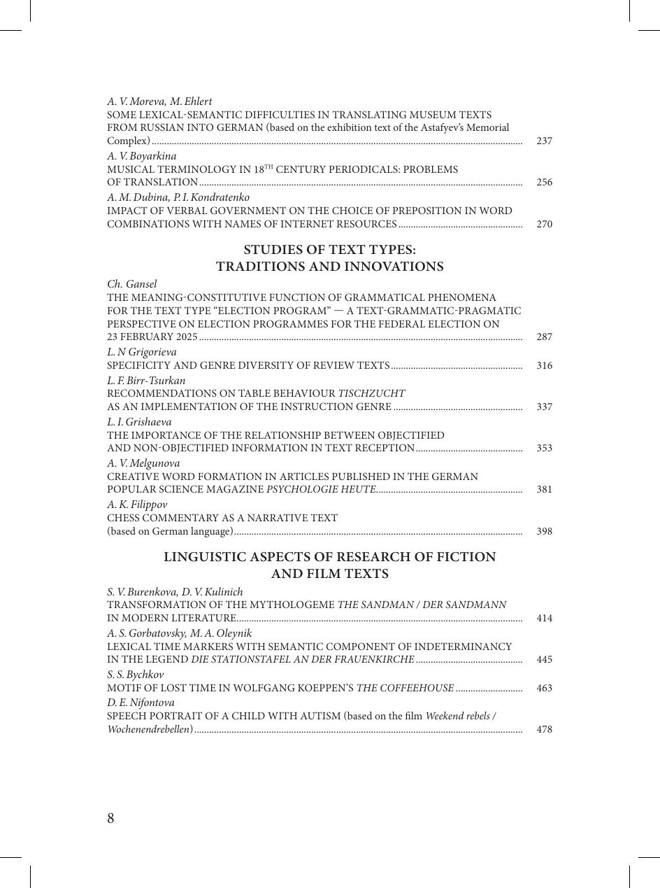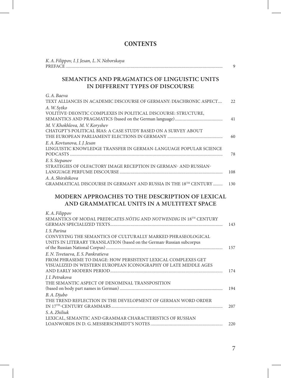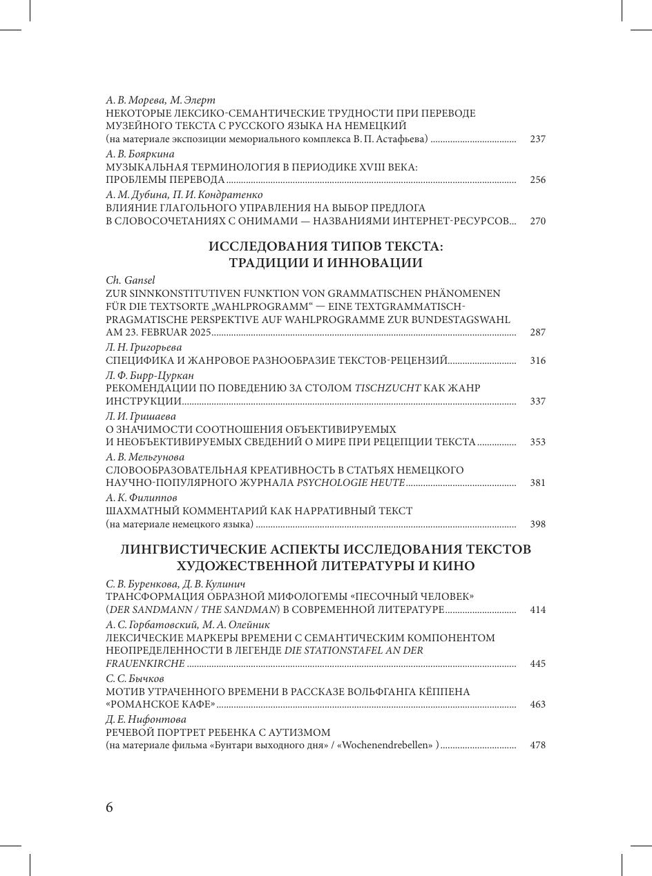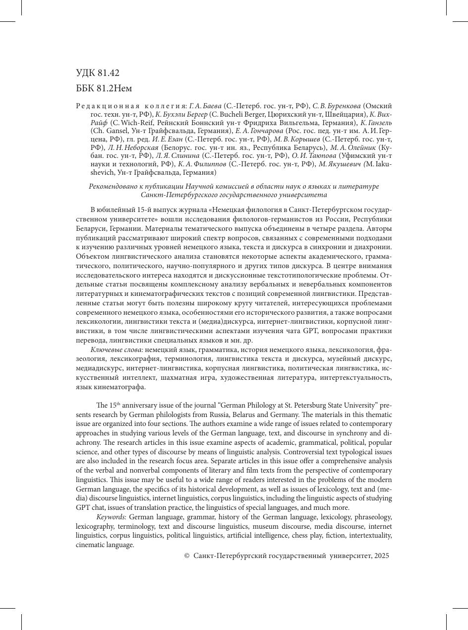 В юбилейный 15-й выпуск журнала "Немецкая филология в Санкт-Петербургском государственном университете" вошли исследования филологов-германистов из России, республики Беларуси, Германии. Материалы тематического выпуска объединены в четыре раздела. Авторы публикаций рассматривают широкий спектр вопросов, связанных с современными подходами к изучению различных уровней немецкого языка, текста и дискурса в синхронии и диахронии. объектом лингвистического анализа становятся некоторые аспекты академического, грамматического, политического, научно-популярного и других типов дискурса. В центре внимания исследовательского интереса находятся и дискуссионные текстотипологические проблемы. Отдельные статьи посвящены комплексному анализу вербальных и невербальных компонентов литературных и кинематографических текстов с позиций современной лингвистики. Представленные статьи могут быть полезны широкому кругу читателей, интересующихся проблемами современного немецкого языка, особенностями его исторического развития, а также вопросами лексикологии, лингвистики текста и (медиа) дискурса, интернет-лингвистики, корпусной лингвистики, в том числе лингвистическими аспектами изучения чата GPT, вопросами практики перевода, лингвистики специальных языков и мн. др.