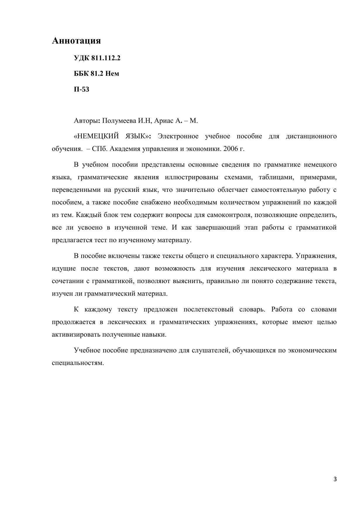 В учебном пособии представлены основные сведения по грамматике немецкого языка, грамматические явления иллюстрированы схемами, таблицами, примерами, переведенными на русский язык, что значительно облегчает самостоятельную работу с пособием, а также пособие снабжено необходимым количеством упражнений по каждой из тем. Каждый блок тем содержит вопросы для самоконтроля, позволяющие определить, все ли усвоено в изученной теме. И как завершающий этап работы с грамматикой предлагается тест по изученному материалу. В пособие включены также тексты общего и специального характера. Упражнения, идущие после текстов, дают возможность для изучения лексического материала в сочетании с грамматикой, позволяют выяснить, правильно ли понято содержание текста, изучен ли грамматический материал. К каждому тексту предложен послетекстовый словарь. Работа со словами продолжается в лексических и грамматических упражнениях, которые имеют целью активизировать полученные навыки. Учебное пособие предназначено для слушателей, обучающихся по экономическим специальностям. Электронное учебное пособие для дистанционного обучения