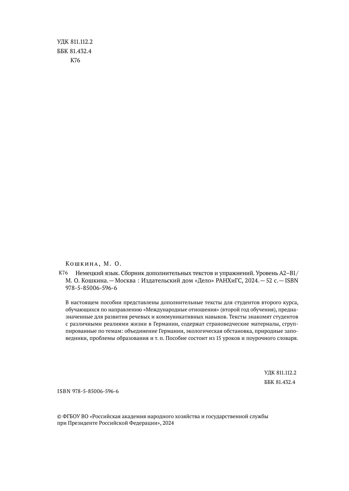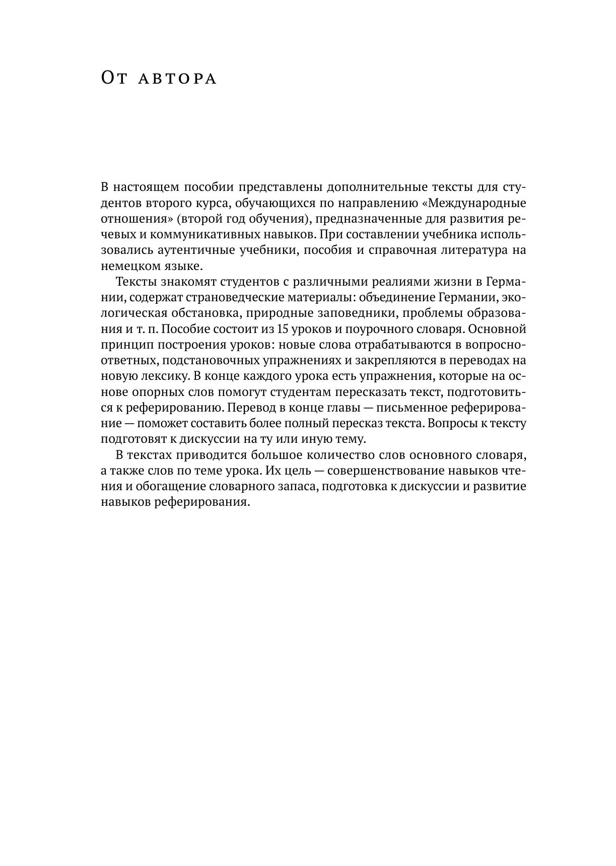 В настоящем пособии представлены дополнительные тексты для студентов второго курса, обучающихся по направлению «Международные отношения» (второй год обучения), предназначенные для развития речевых и коммуникативных навыков. Тексты знакомят студентов с различными реалиями жизни в Германии, содержат страноведческие материалы, сгруппированные по темам: объединение Германии, экологическая обстановка, природные заповедники, проблемы образования и т. п. Пособие состоит из 15 уроков и поурочного словаря.