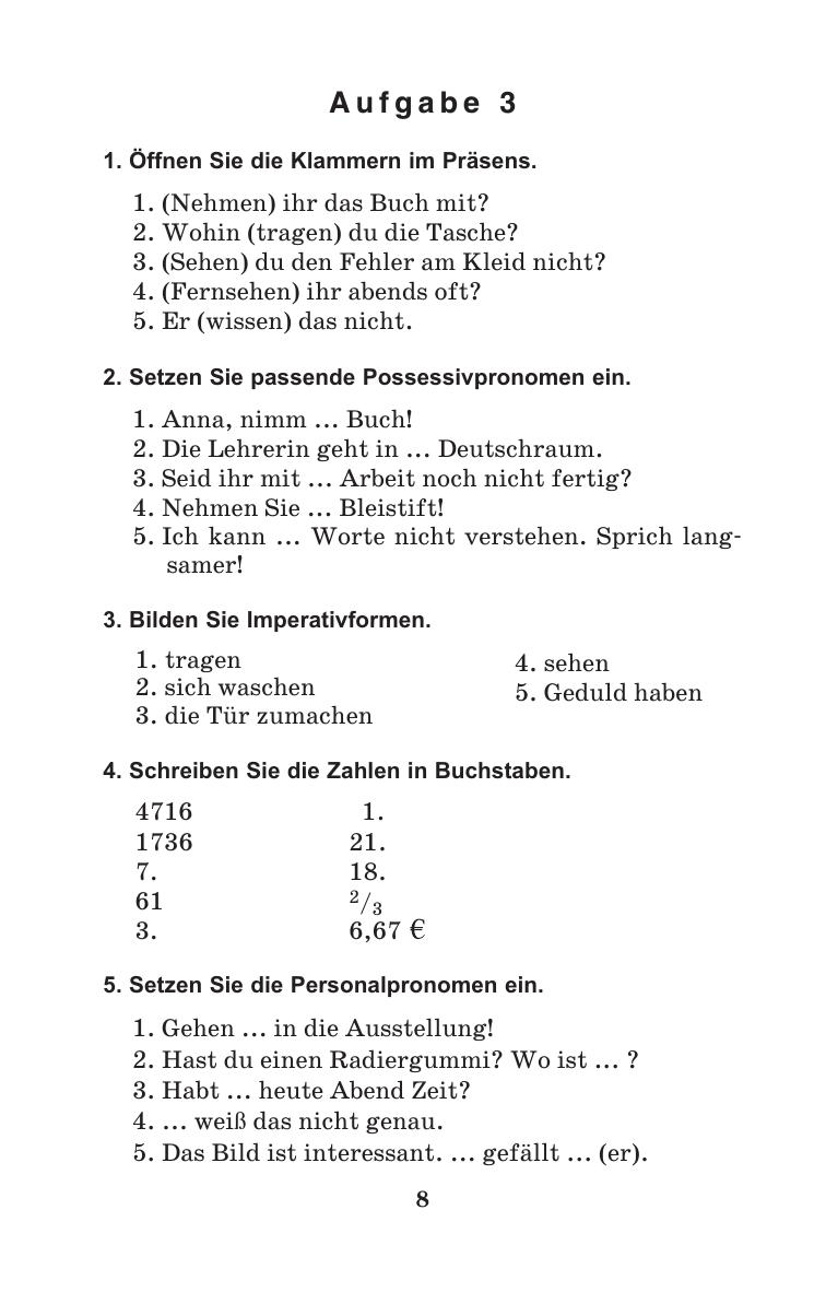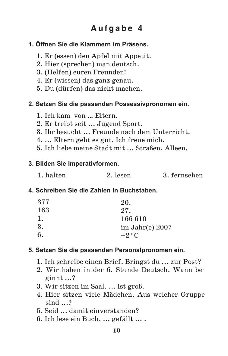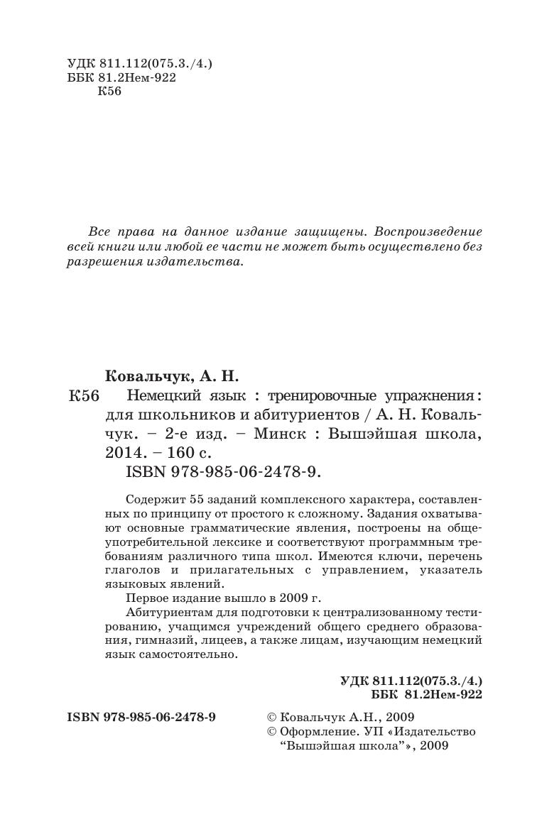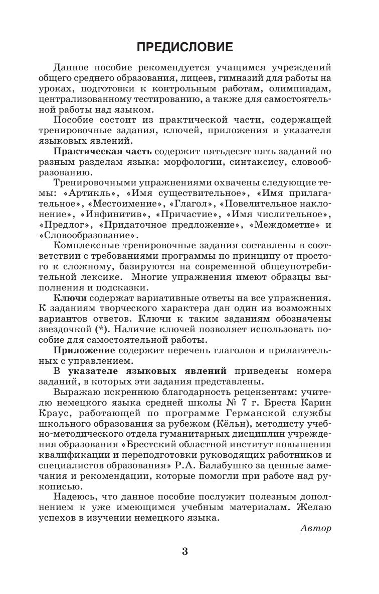 Содержит 55 заданий комплексного характера, составленных по принципу от простого к сложному. Задания охватывают основные грамматические явления, построены на общеупотребительной лексике и соответствуют программным требованиям различного типа школ. Имеются ключи, перечень глаголов и прилагательных с управлением, указатель языковых явлений. Абитуриентам для подготовке к централизованному тестированию, учащимся общеобразовательных школ, гимназий, лицеев, а также лицам, изучающим немецкий язык самостоятельно.