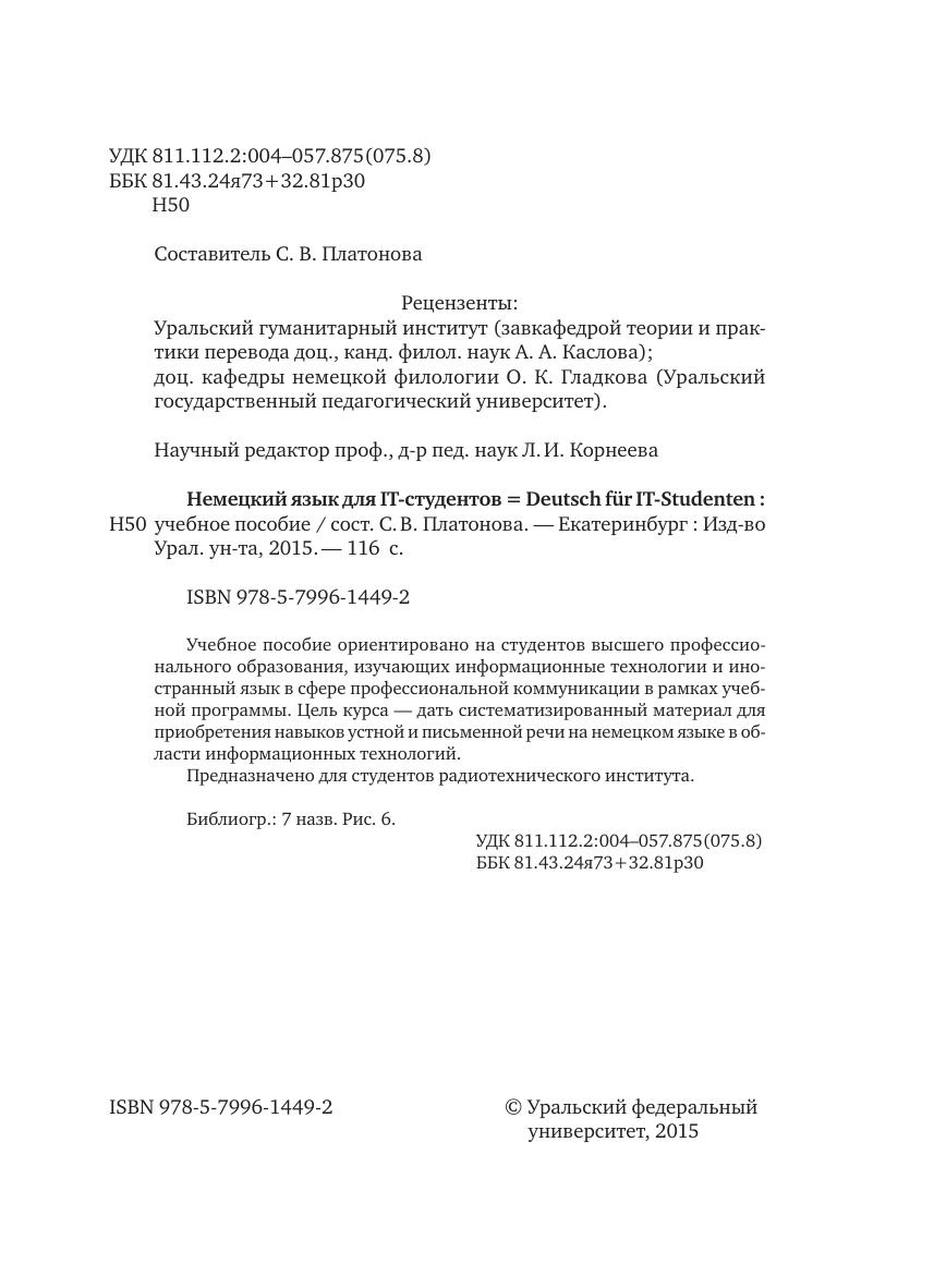 Учебное пособие ориентировано на студентов высшего профессионального образования, изучающих информационные технологии и иностранный язык в сфере профессиональной коммуникации в рамках учебной программы. Цель курса — дать систематизированный материал для приобретения навыков устной и письменной речи на немецком языке в области информационных технологий. Предназначено для студентов радиотехнического института.