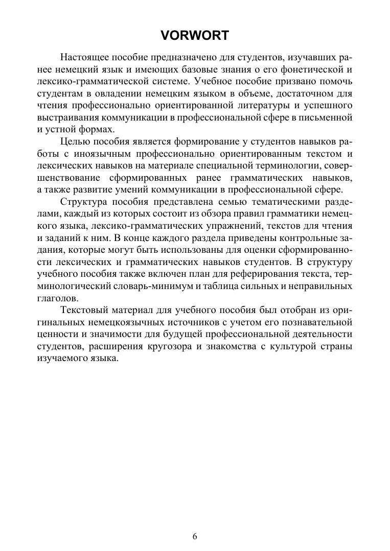 Настоящее пособие предназначено для студентов, изучавших ранее немецкий язык и имеющих базовые знания о его фонетической и лексико-грамматической системе. Учебное пособие призвано помочь студентам в овладении немецким языком в объеме, достаточном для чтения профессионально ориентированной литературы и успешного выстраивания коммуникации в профессиональной сфере в письменной и устной формах. Его целью является формирование у студентов навыков работы с иноязычным профессионально ориентированным текстом на материале специальной терминологии, а также развитие умения коммуницировать с партнерами в профессиональной среде. Соответствует современным требованиям Федерального государственного образовательного стандарта среднего профессионального образования и профессиональным квалификационным требованиям. Пособие адресовано в первую очередь студентам организаций среднего профессионального образования, обучающимся по сельскохозяйственным направлениям подготовки и изучающим немецкий язык в качестве иностранного языка профессионального общения, но может быть использовано и для языкового обучения специалистов в смежных областях.
