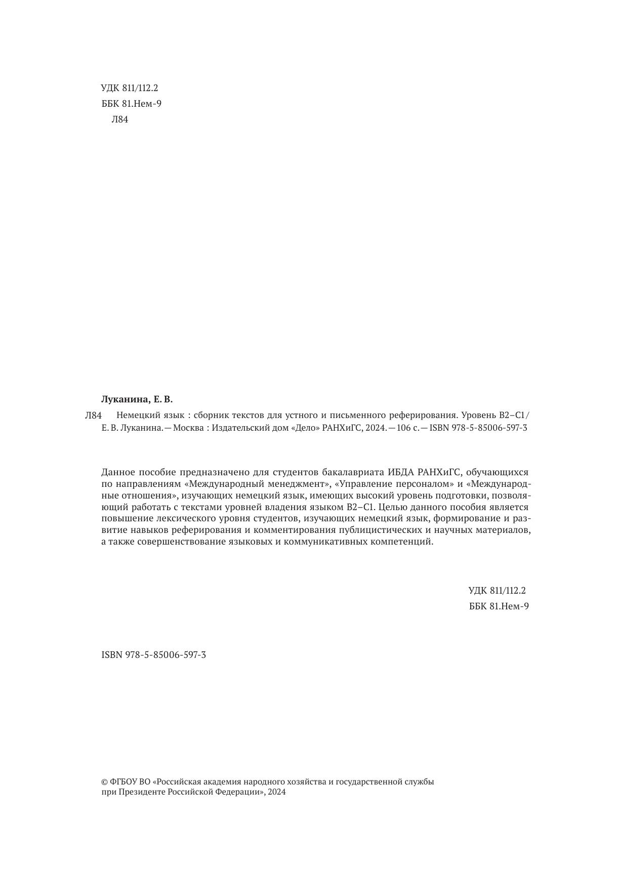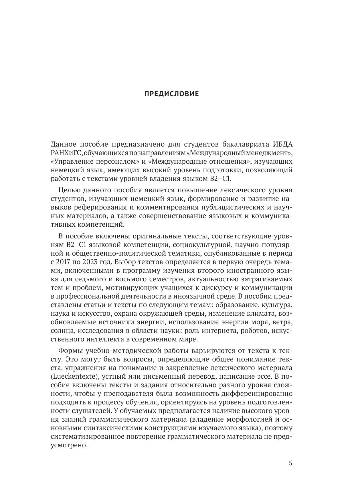 Данное пособие предназначено для студентов бакалавриата ИБДА РАНХиГС, обучающихся по направлениям «Международный менеджмент», «Управление персоналом» и «Международные отношения», изучающих немецкий язык, имеющих высокий уровень подготовки, позволяющий работать с текстами уровней владения языком B2–C1. Целью данного пособия является повышение лексического уровня студентов, изучающих немецкий язык, формирование и развитие навыков реферирования и комментирования публицистических и научных материалов, а также совершенствование языковых и коммуникативных компетенций.