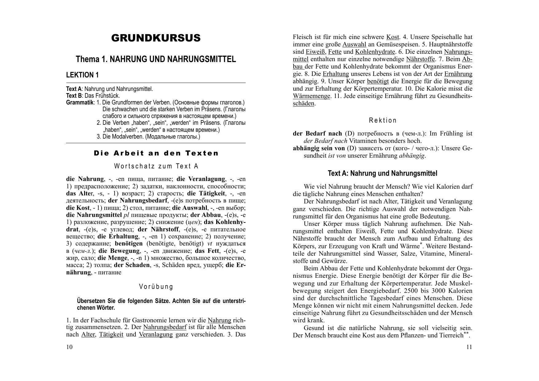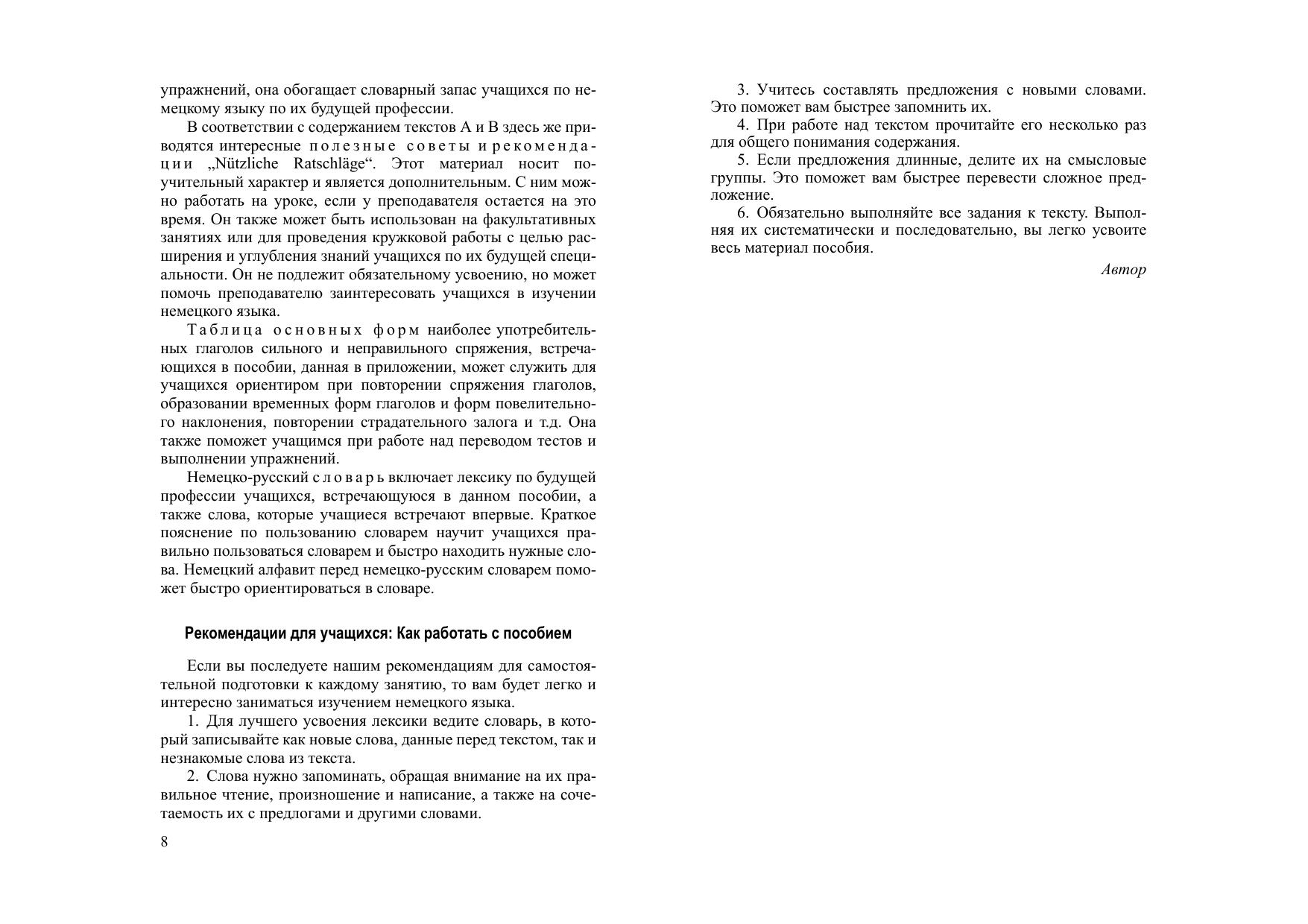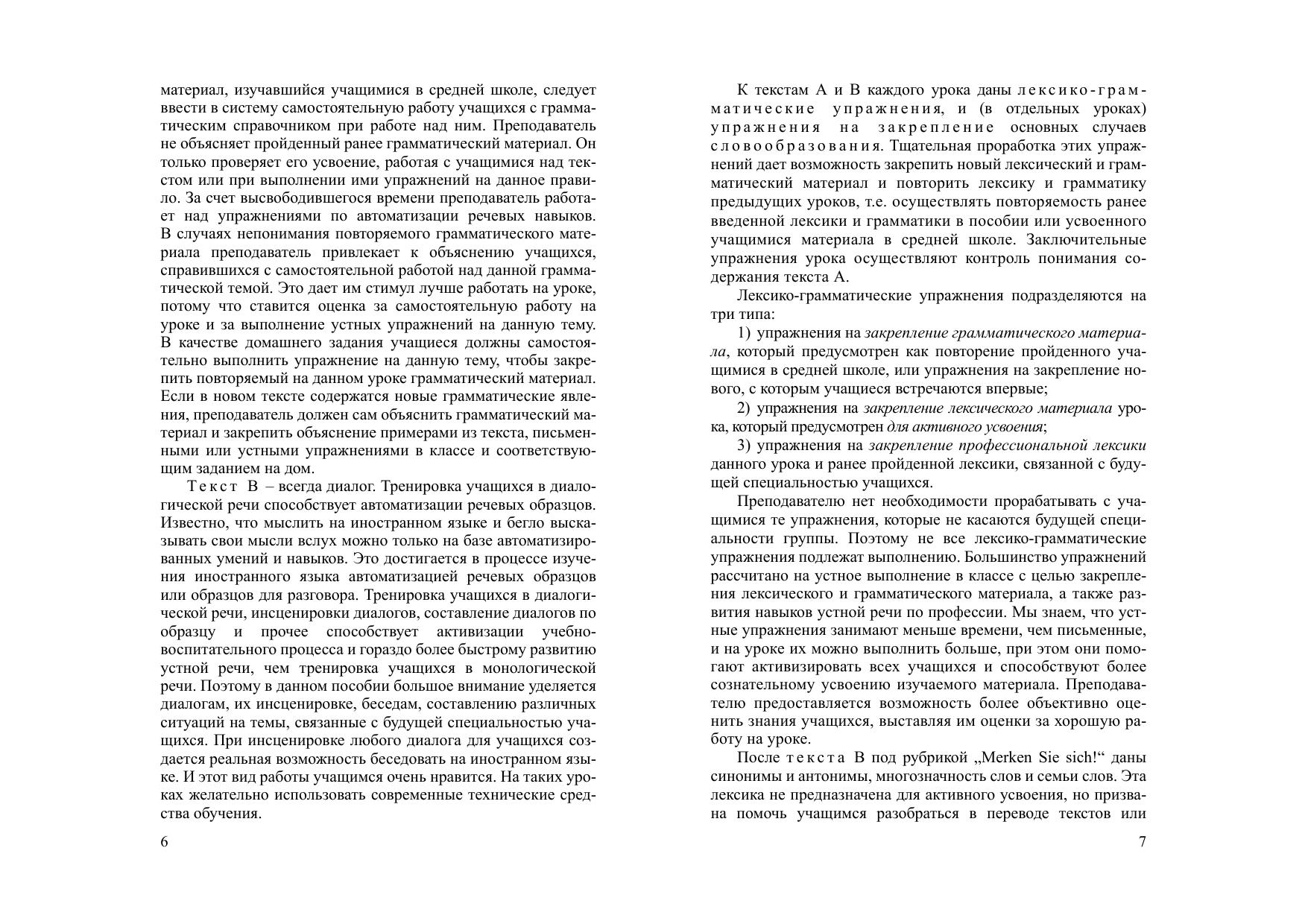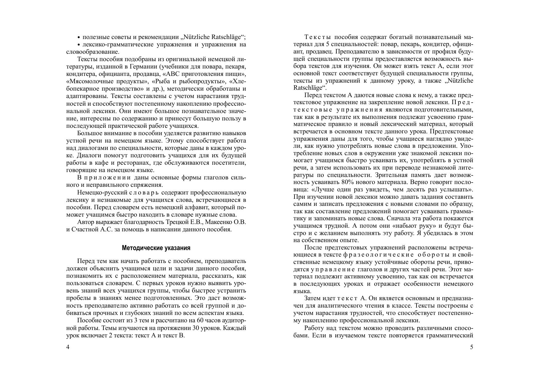 Состоит из основного курса и приложения. Основной курс охватывает три темы (30 уроков, рассчитанных на 60 аудиторных занятий). Каждый урок включает текст А (аналитический) и текст В (диалог) для развития умений и навыков устной речи лексические и грамматические упражнения, а также упражнения на словообразование. Приложение содержит список основных форм глаголов сильного и неправильного спряжения. В конце пособия имеется немецко-русский словарь. Для учащихся ССУЗов.