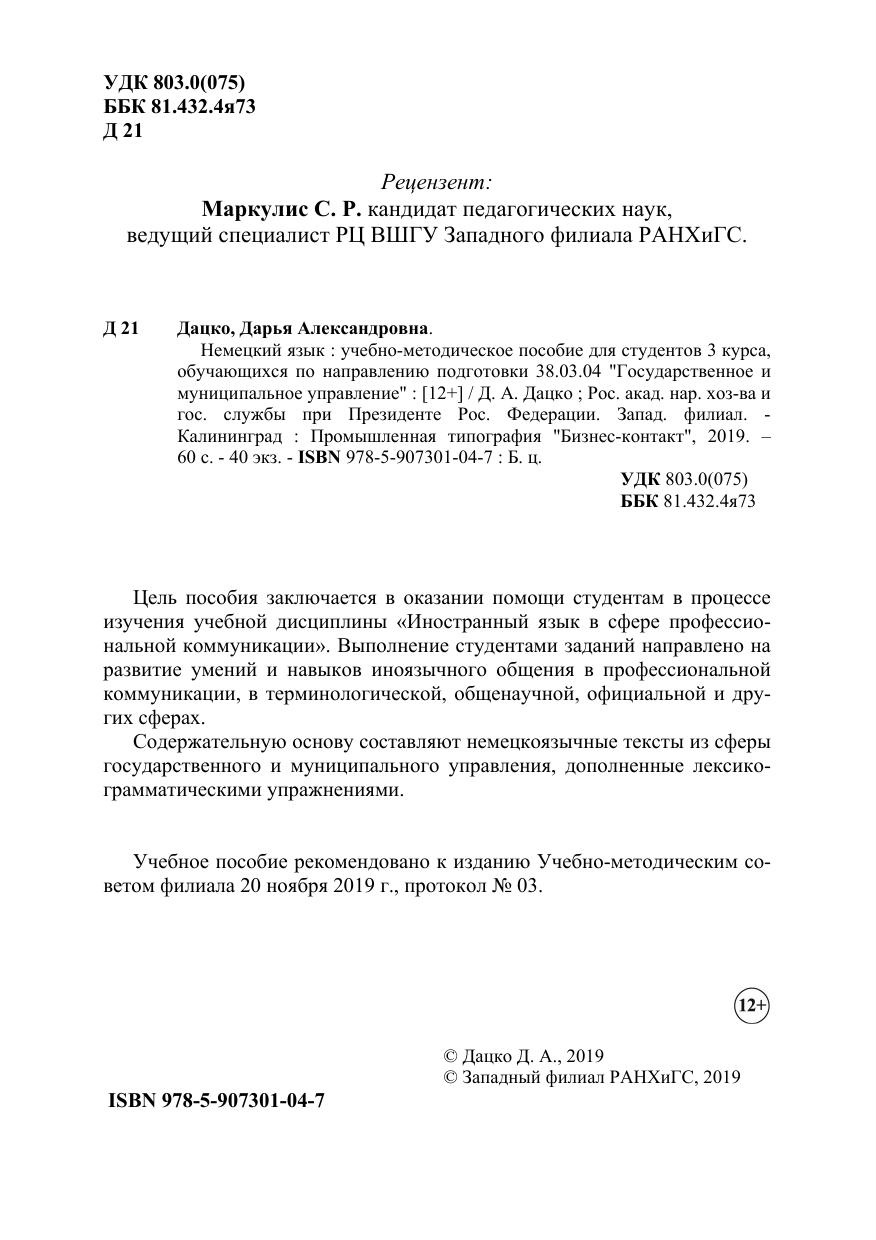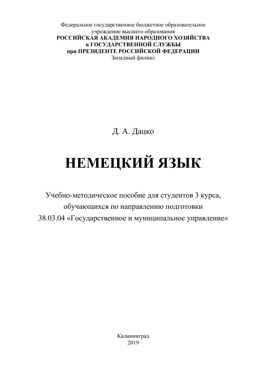 Цель пособия заключается в оказании помощи студентам в процессе изучения учебной дисциплины «Иностранный язык в сфере профессиональной коммуникации». Выполнение студентами заданий направлено на развитие умений и навыков иноязычного общения в профессиональной коммуникации, в терминологической, общенаучной, официальной и других сферах. Содержательную основу составляют немецкоязычные тексты из сферы государственного и муниципального управления, дополненные лексикограмматическими упражнениями.
