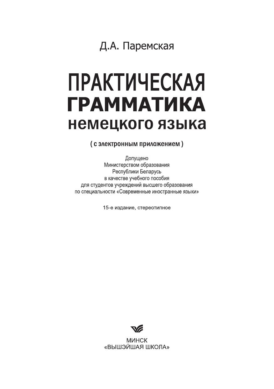 Предназначено для комплексной работы над немецкой грамматикой (морфология и синтаксис) на начальном и продвинутом этапах обучения немецкому языку. Cостоит из двух частей. В первой части даются тщательно подобранные по принципу нарастания трудности упражнения, а также контрольные задания. Вторая часть представляет собой грамматический справочник, содержащий правила по всем темам, изложенные на русском языке. Приведены ключи к контрольным заданиям. Для студентов учреждений высшего образования. Может быть использовано учащимися школ с углубленным изучением немецкого языка, а также изучающими немецкий язык на языковых курсах или самостоятельно. Предыдущее издание вышло в 2014 г.