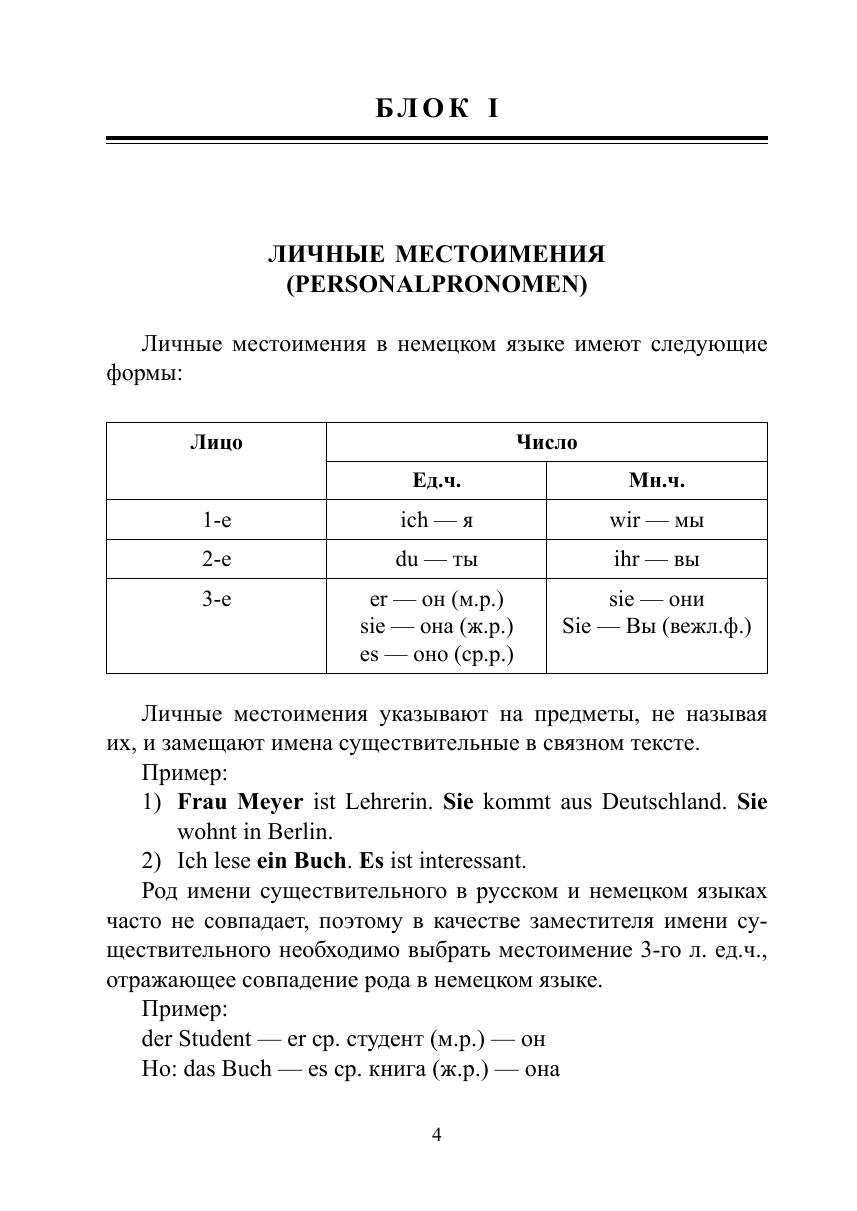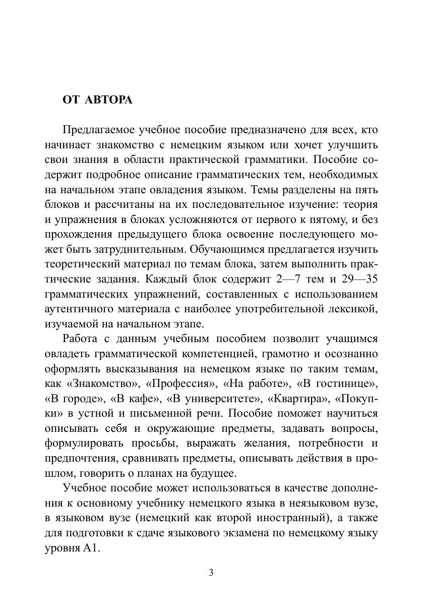 Пособие содержит подробное описание грамматических тем, необходимых на начальном этапе овладения языком. Темы разделены на пять блоков и рассчитаны на их последовательное изучение: теория и упражнения в блоках усложняются от первого к пятому, и без прохождения предыдущего блока освоение последующего может быть затруднительным. Работа с пособием позволит учащимся овладеть грамматической компетенцией, грамотно и осознанно оформлять высказывания на немецком языке по таким темам как «Знакомство», «Профессия», «На работе», «В гостинице», «В горо-де», «В кафе», «В университете», «Квартира», «Покупки» в устной и письменной речи.