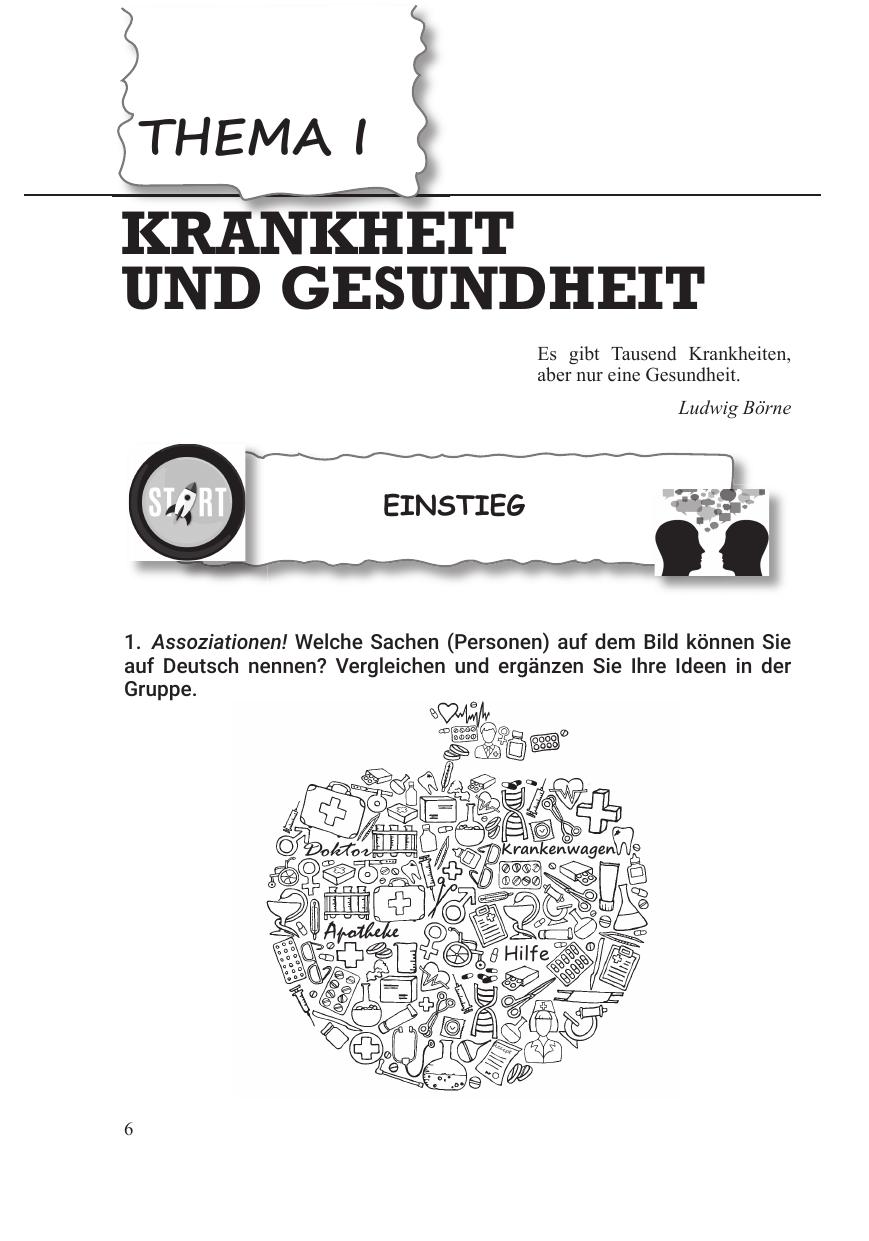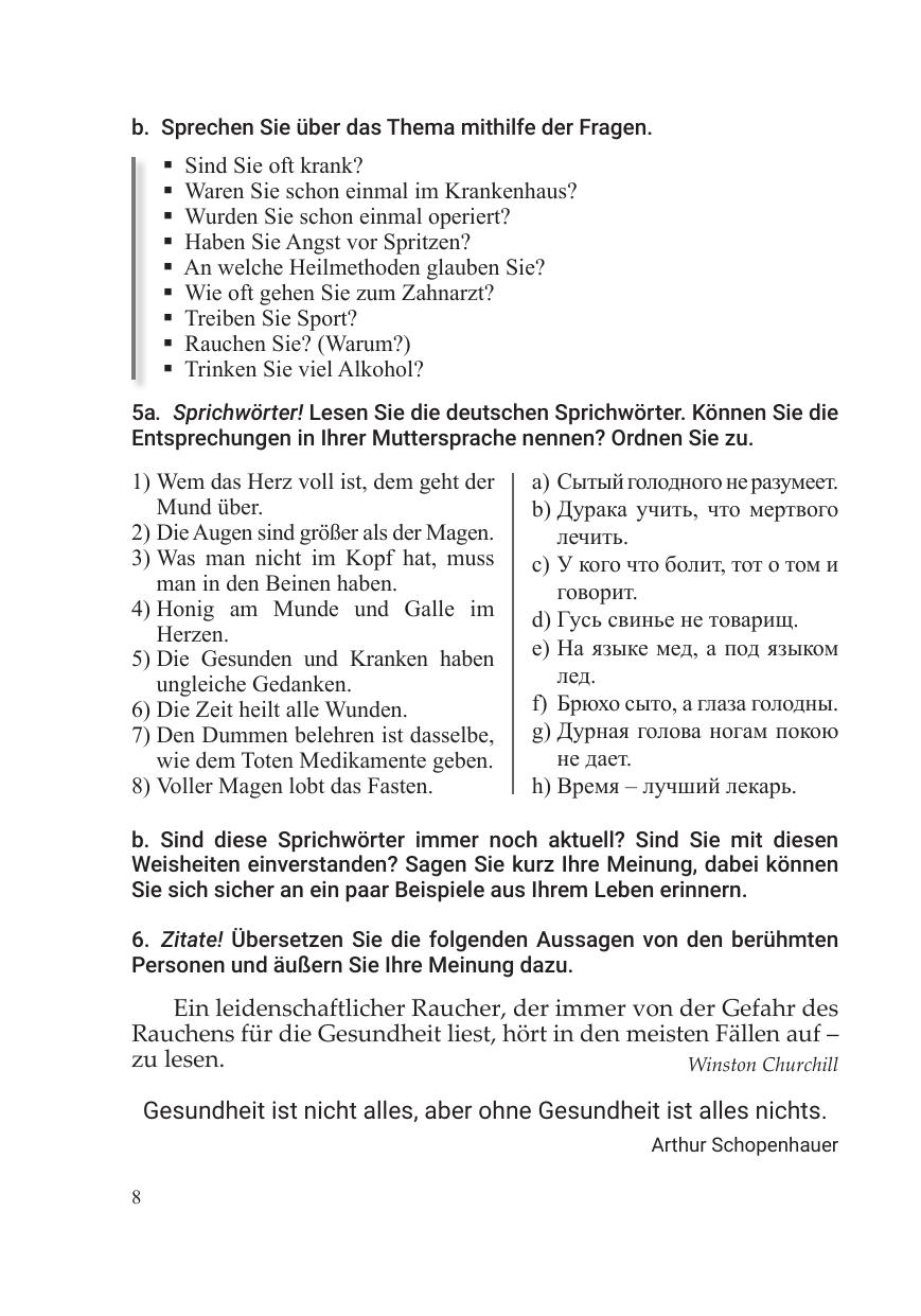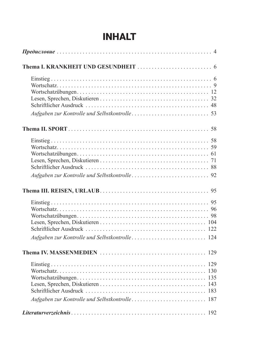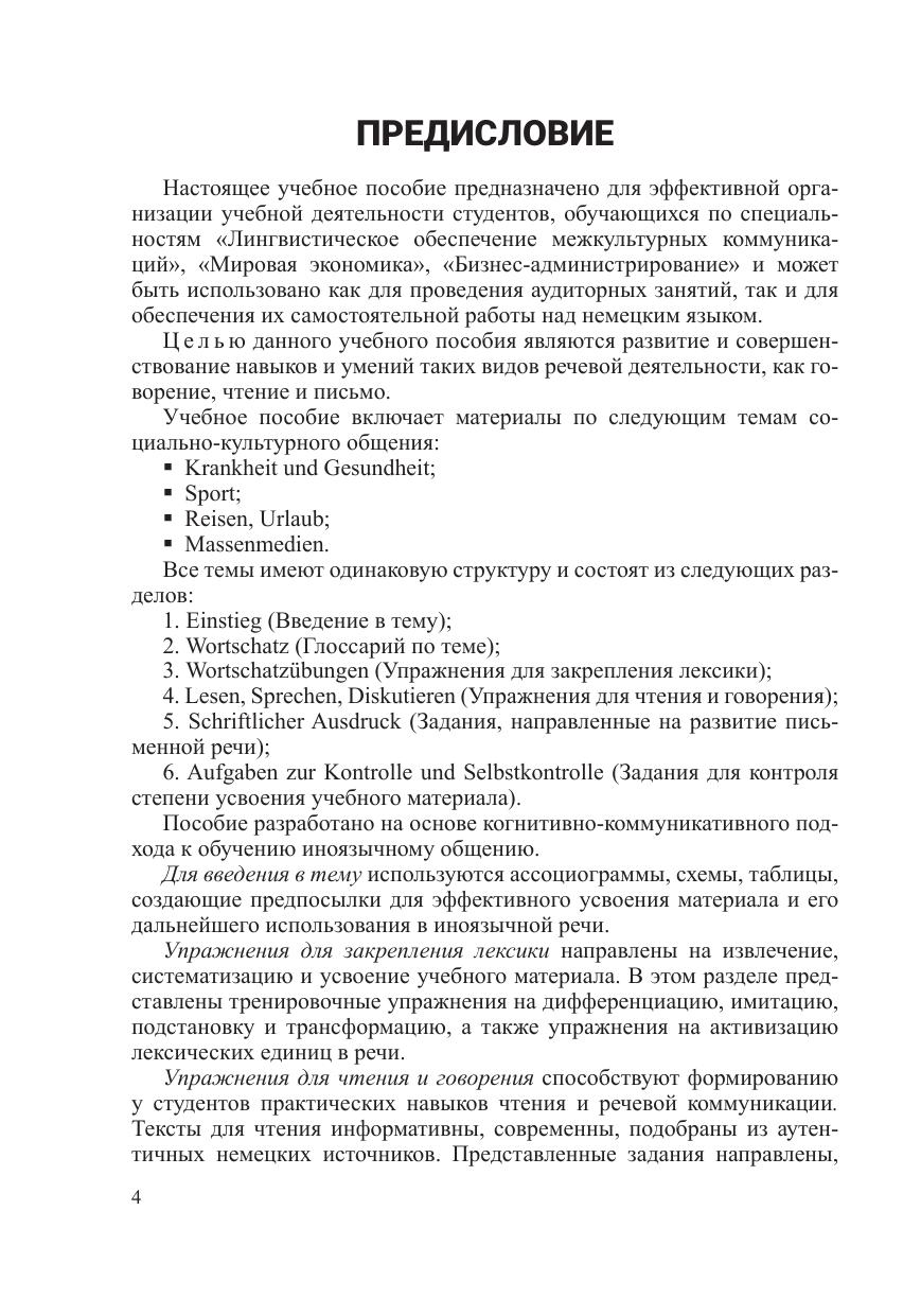 Состоит из четырех разделов, представляющих темы социально-культурного общения: „Krankheit und Gesundheit“, „Sport“, „Reisen, Urlaub“, „Massenmedien“. Каждая тема содержит глоссарий, упражнения для введения в тему, закрепления лексики по теме и развития умений и навыков устной и письменной речи, а также задания для контроля и самоконтроля. Предназначено для студентов специальностей «Лингвистическое обеспечение межкультурных коммуникаций», «Мировая экономика», «Бизнес-администрирование», а также для всех изучающих немецкий язык самостоятельно.