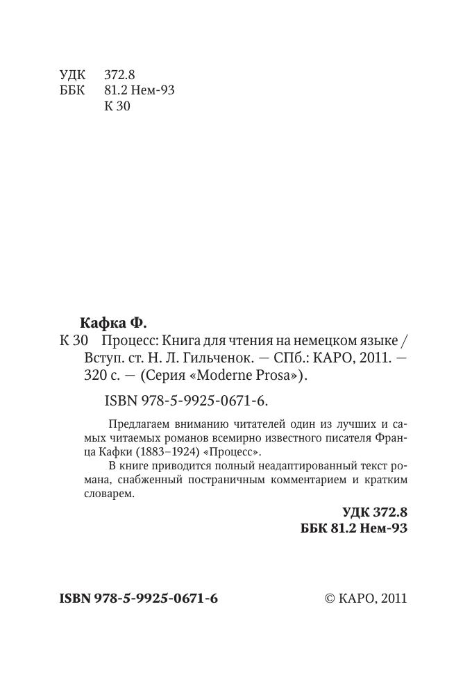 Предлагаем вниманию читателей один из лучших и самых читаемых романов всемирно известного писателя Франца Кафки (1883–1924) «Процесс». В книге приводится полный неадаптированный текст романа, снабженный постраничным комментарием и кратким словарем