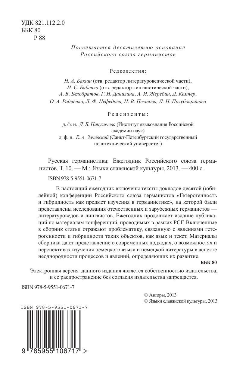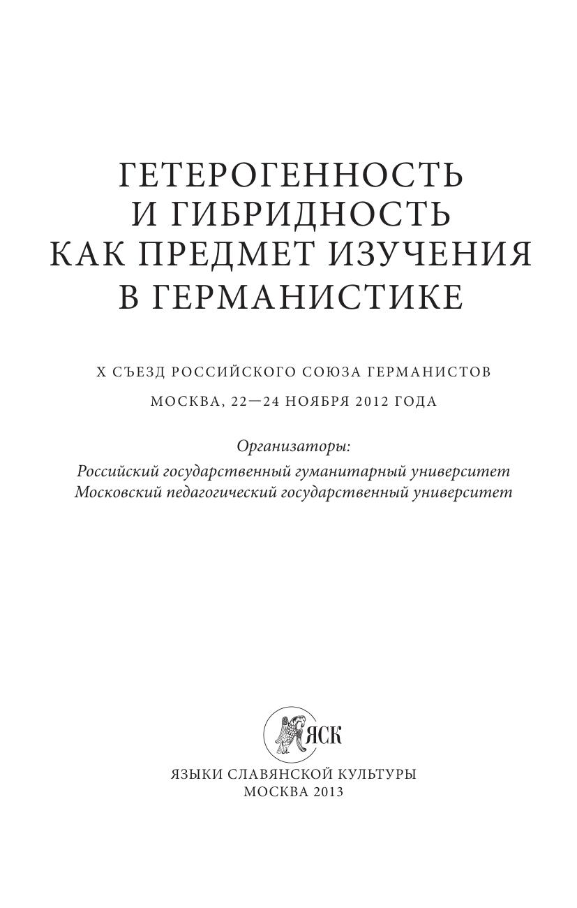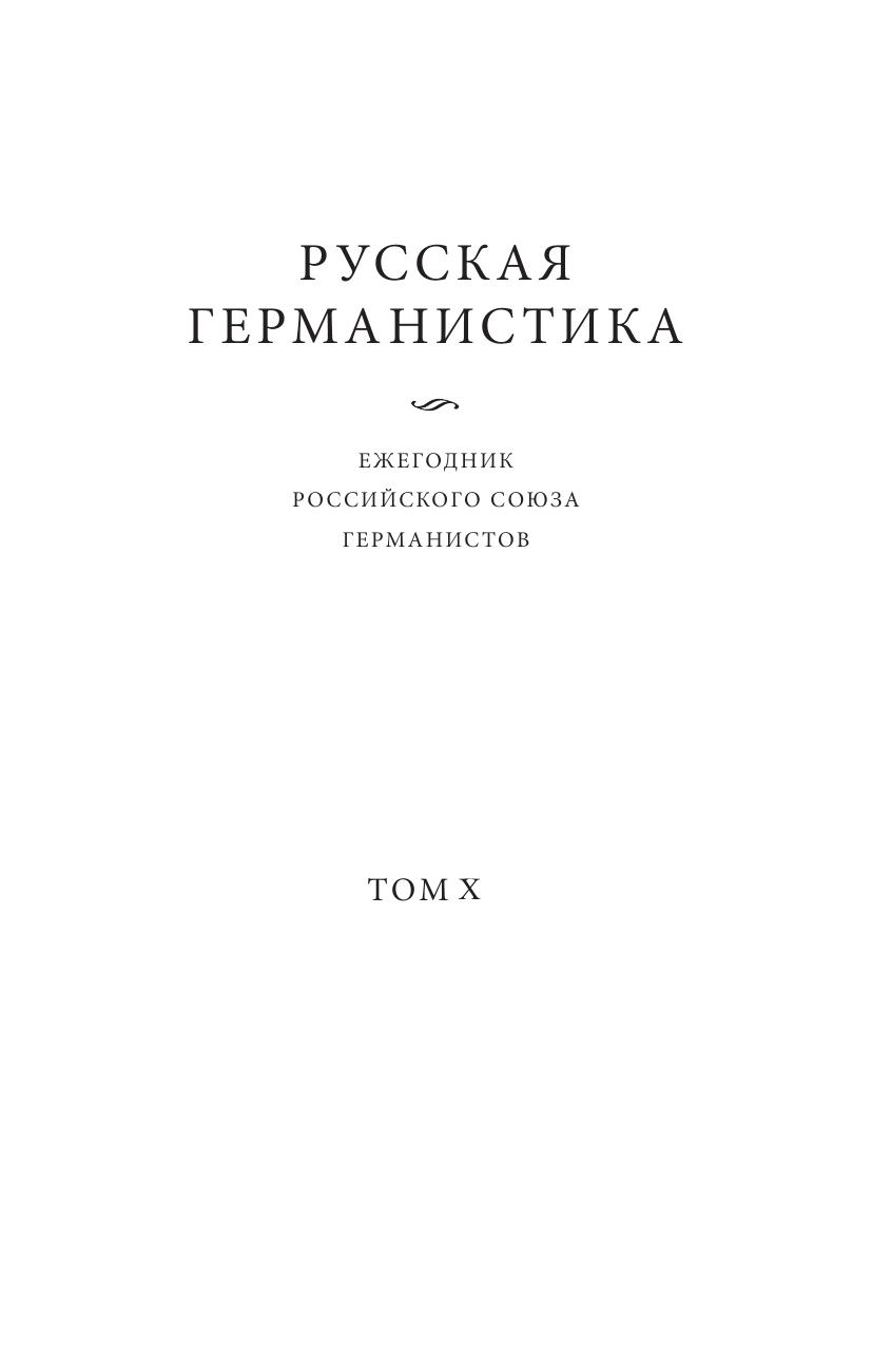 В настоящий ежегодник включены тексты докладов десятой (юбилейной) конференции Российского союза германистов «Гетерогенность и гибридность как предмет изучения в германистике», на которой были представлены исследования отечественных и зарубежных германистов литературоведов и лингвистов. Ежегодник продолжает издание публикаций по материалам конференций, проводимых в рамках РСГ. Включенные в сборник статьи отражают проблематику, связанную с явлениями гетерогенности и гибридности таких объектов, как язык и текст. Материалы сборника дают представление о современных подходах, о возможностях и перспективах изучения немецкого языка и немецкой литературы в аспекте неоднородности процессов и явлений, определяющих их развитие.