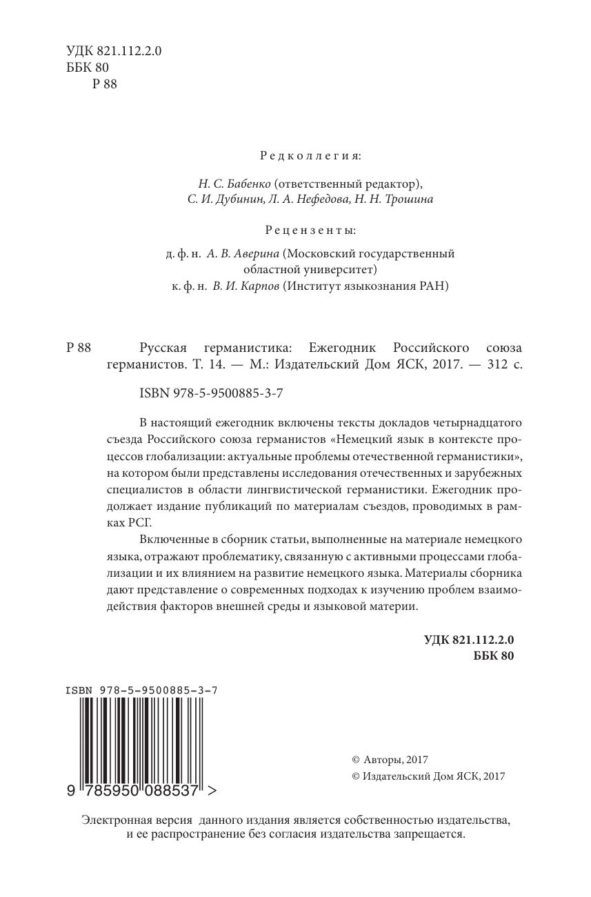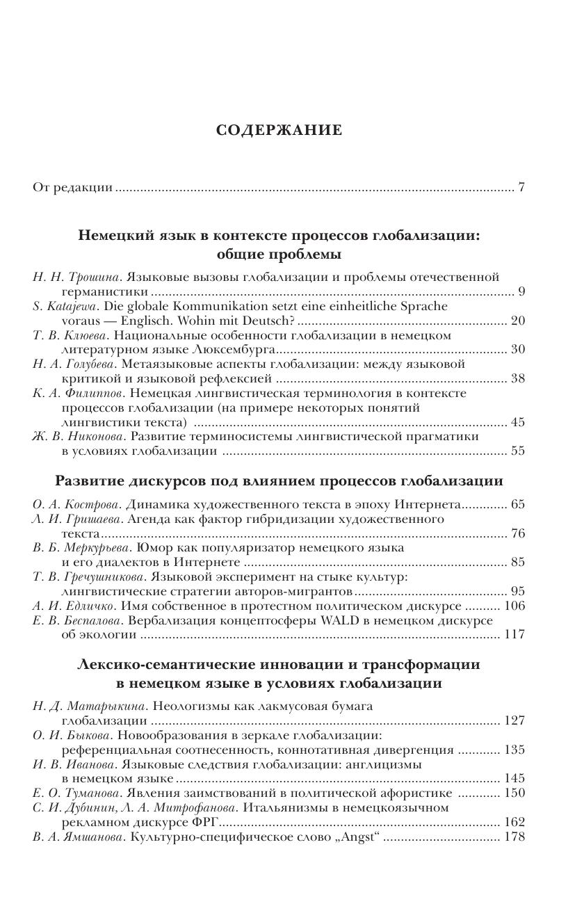 В настоящий ежегодник включены тексты докладов четырнадцатого съезда Российского союза германистов «Немецкий язык в контексте процессов глобализации: актуальные проблемы отечественной германистики», на котором были представлены исследования отечественных и зарубежных специалистов в области лингвистической германистики. Ежегодник продолжает издание публикаций по материалам съездов, проводимых в рамках РСГ. Включенные в сборник статьи, выполненные на материале немецкого языка, отражают проблематику, связанную с активными процессами глобализации и их влиянием на развитие немецкого языка. Материалы сборника дают представление о современных подходах к изучению проблем взаимодействия факторов внешней среды и языковой материи.