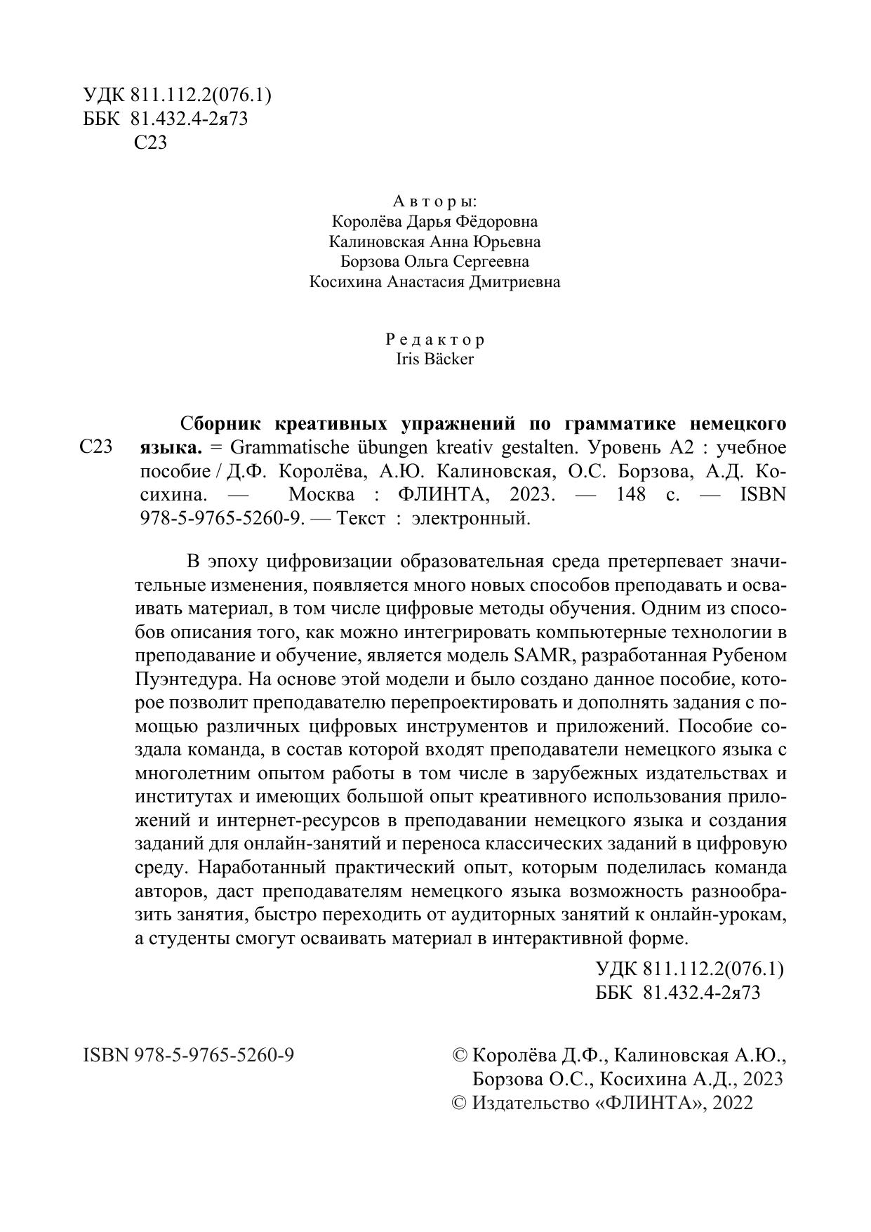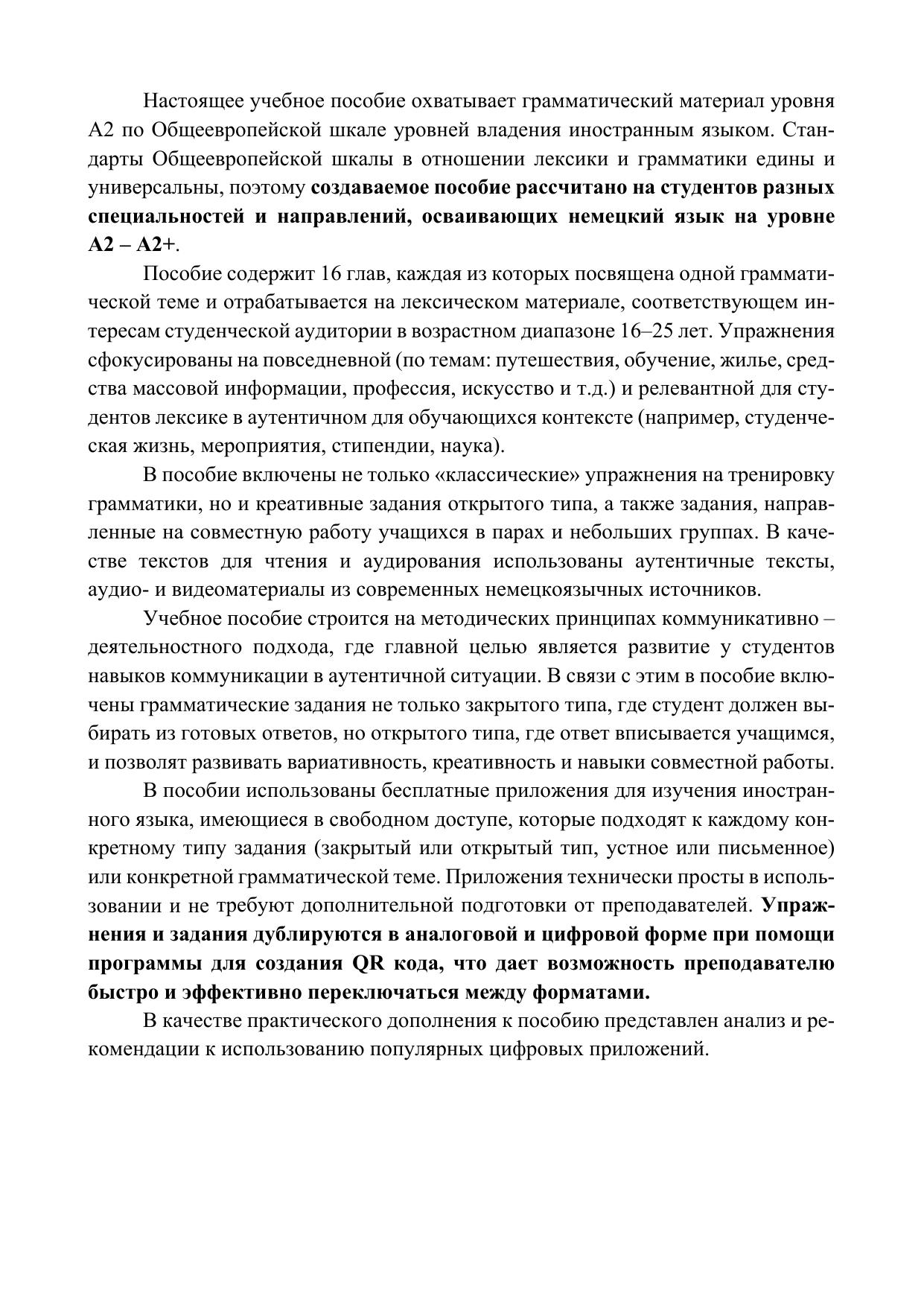 В эпоху цифровизации образовательная среда претерпевает значительные изменения, появляется много новых способов преподавать и осваивать материал, в том числе цифровые методы обучения. Одним из способов описания того, как можно интегрировать компьютерные технологии в преподавание и обучение, является модель SAMR, разработанная Рубеном Пуэнтедура. На основе этой модели и было создано данное пособие, кото-рое позволит преподавателю перепроектировать и дополнять задания с помощью различных цифровых инструментов и приложений. Пособие создала команда, в состав которой входят преподаватели немецкого языка с многолетним опытом работы в том числе в зарубежных издательствах и институтах и имеющих большой опыт креативного использования приложений и интернет-ресурсов в преподавании немецкого языка и создания заданий для онлайн-занятий и переноса классических заданий в цифровую среду. Наработанный практический опыт, которым поделилась команда авторов, даст преподавателям немецкого языка возможность разнообразить занятия, быстро переходить от аудиторных занятий к онлайн-урокам, а студенты смогут осваивать материал в интерактивной форме.