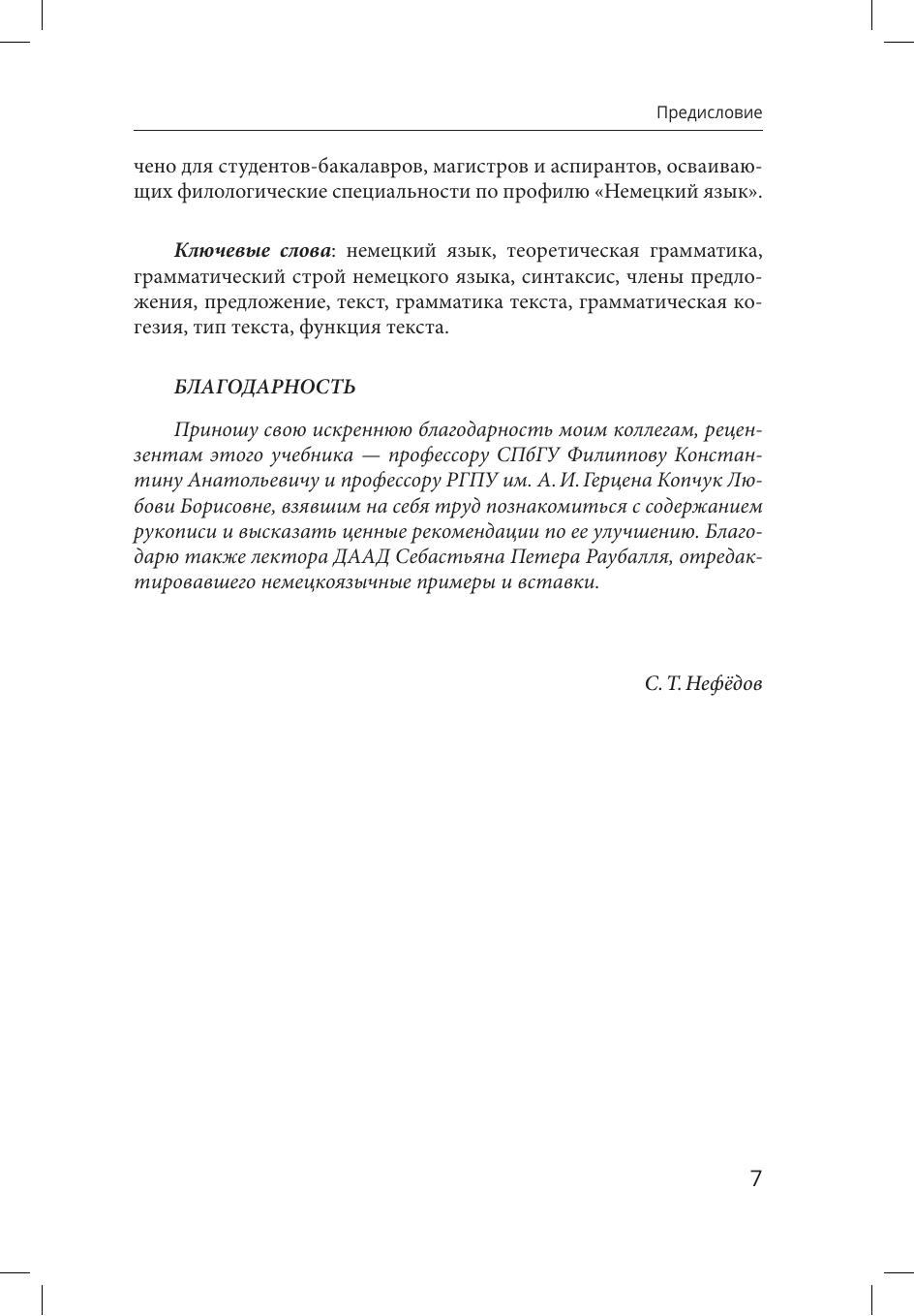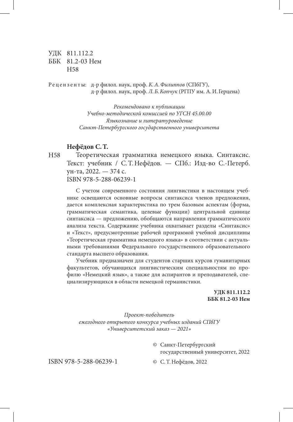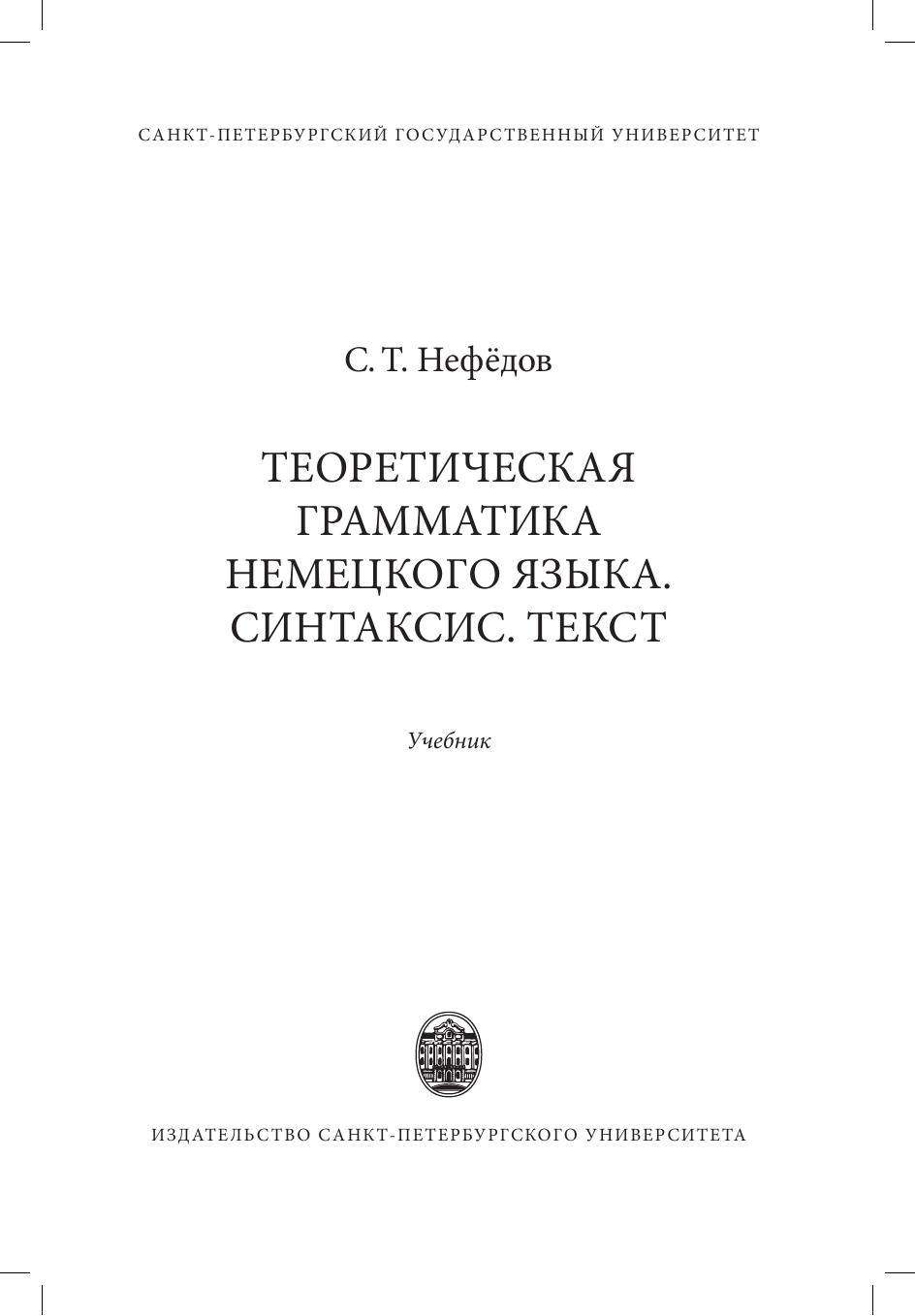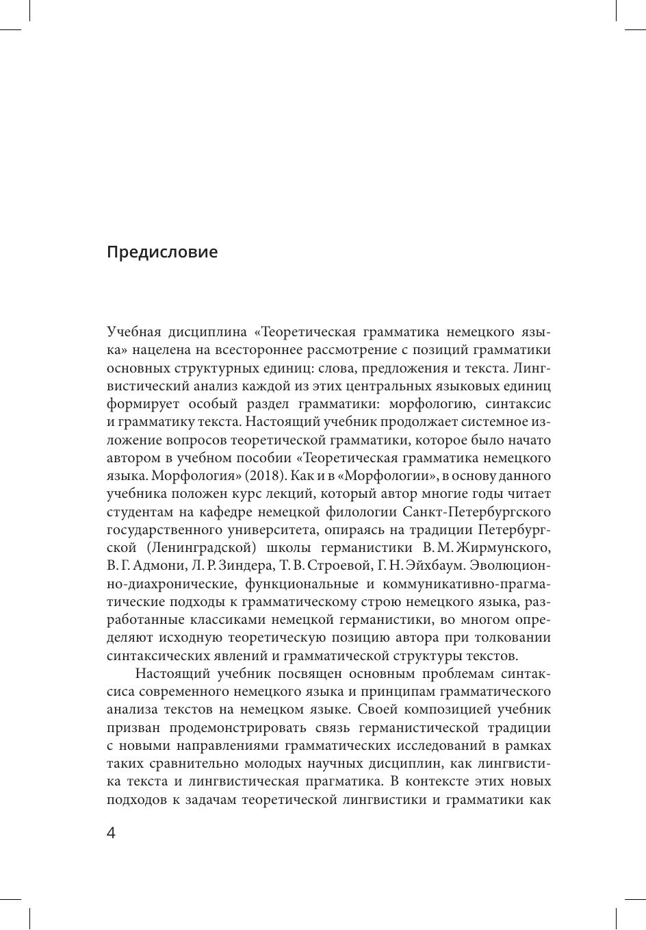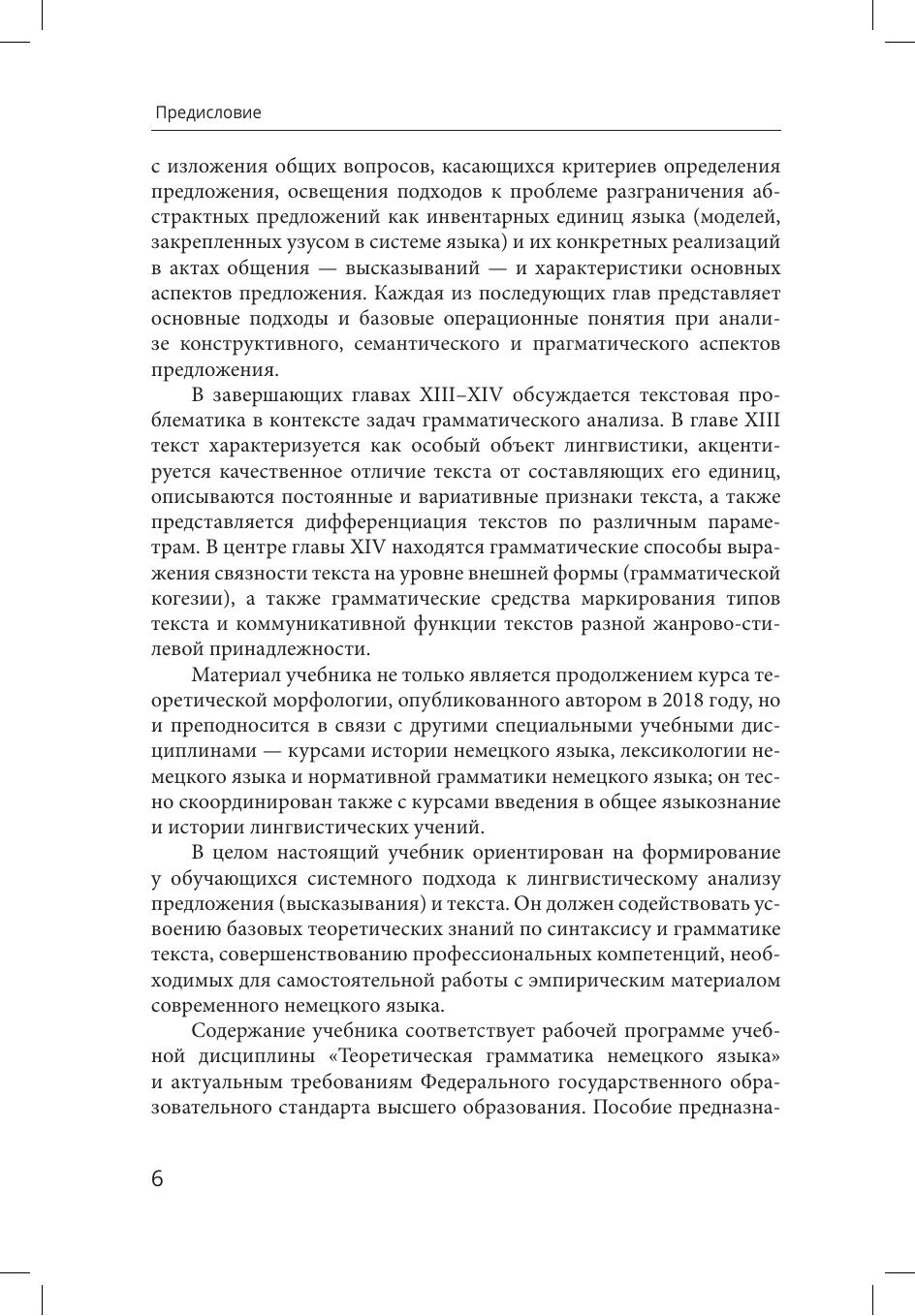 С учетом современного состояния лингвистики в настоящем учебнике освещаются основные вопросы синтаксиса членов предложения, дается комплексная характеристика по трем базовым аспектам (форма, грамматическая семантика, целевые функции) центральной единице синтаксиса - предложению, обобщаются направления грамматического анализа текста. Содержание учебника охватывает разделы "Синтаксис" и "Текст", предусмотренные рабочей программой учебной дисциплины "Теоретическая грамматика немецкого языка" в соответствии с актуальными требованиями Федерального государственного образовательного стандарта высшего образования.