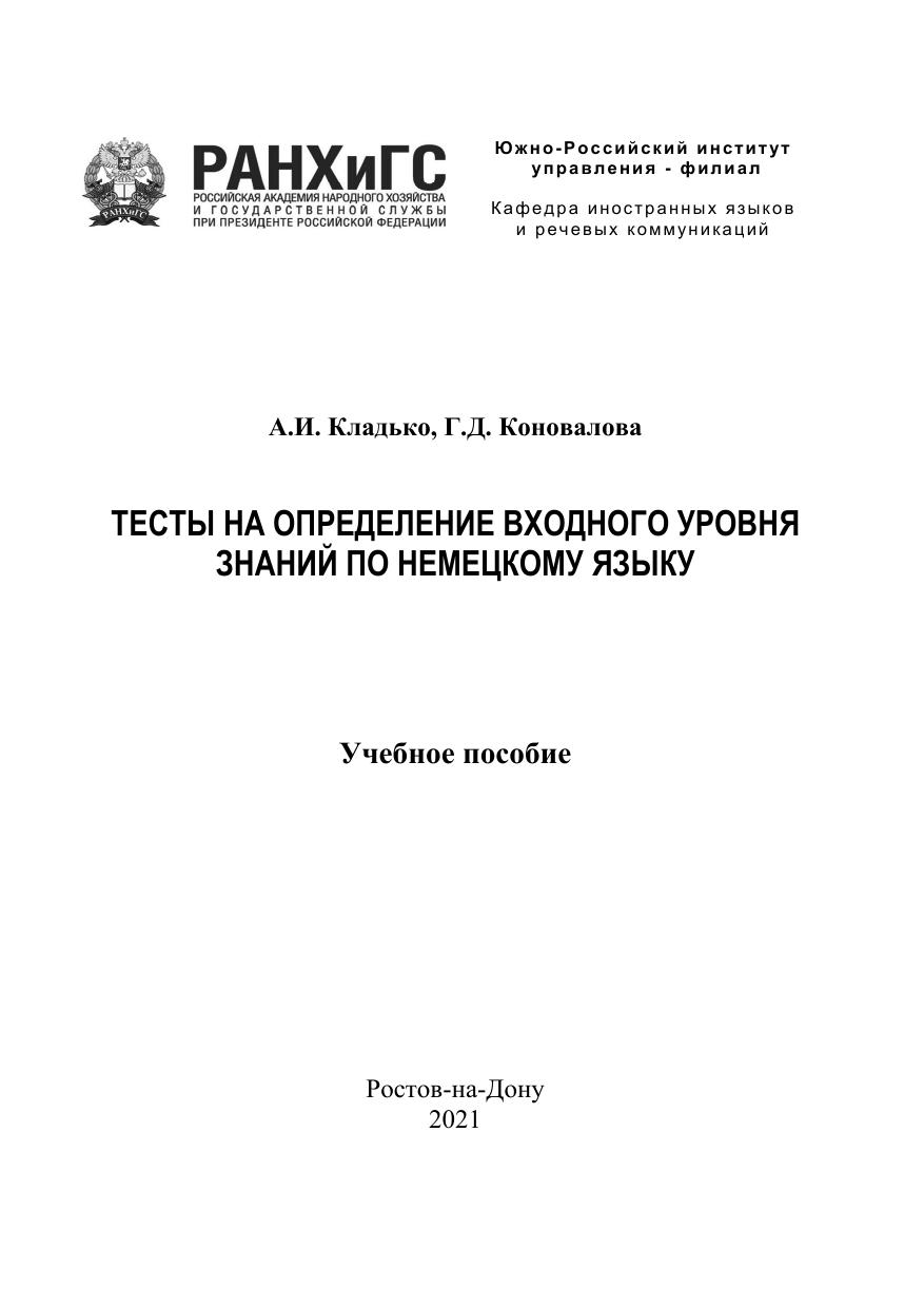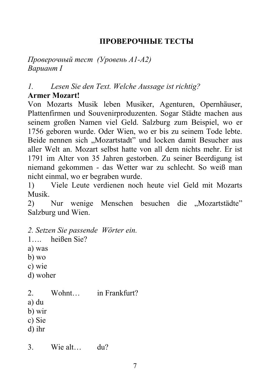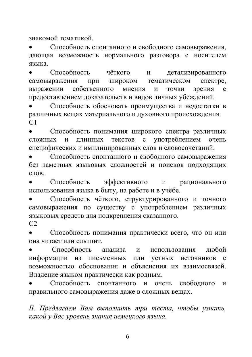 В пособии представлены тесты, цель которых определить уровень владения немецким языком по европейским стандартам, а также осуществить проверку лексико-грамматических навыков и навыков чтения с общим охватом содержания и с полным пониманием на разных этапах обучения. Тесты могу быть использованы для промежуточного и итогового контроля. Предназначено для бакалавров и магистрантов, обучающихся на всех факультетах.