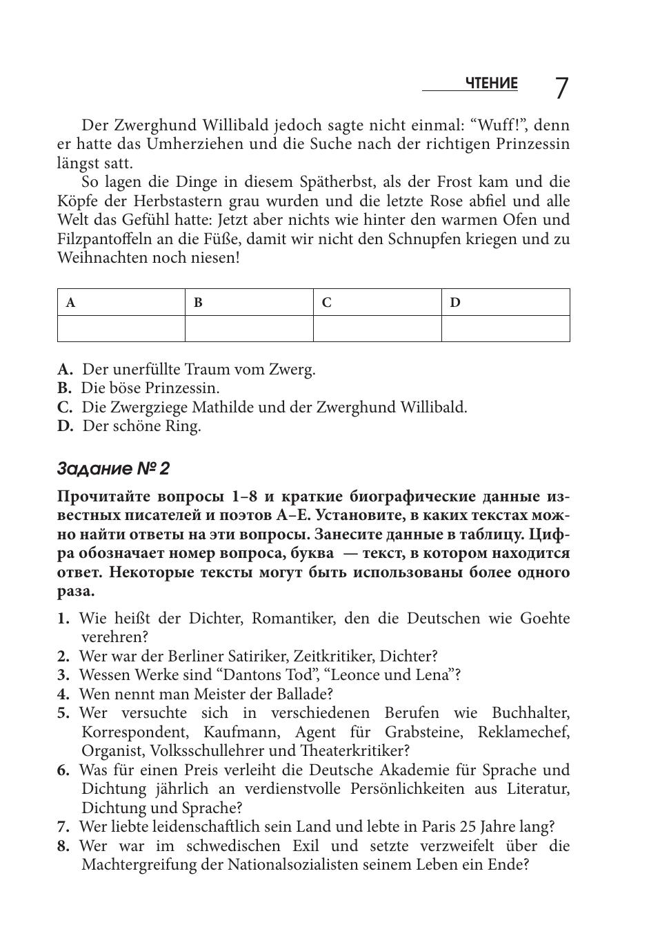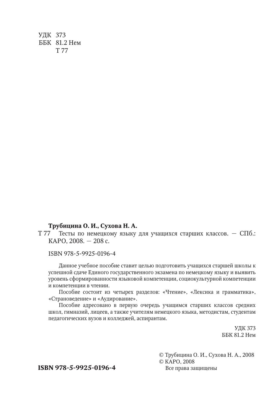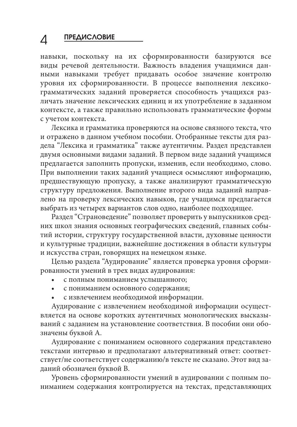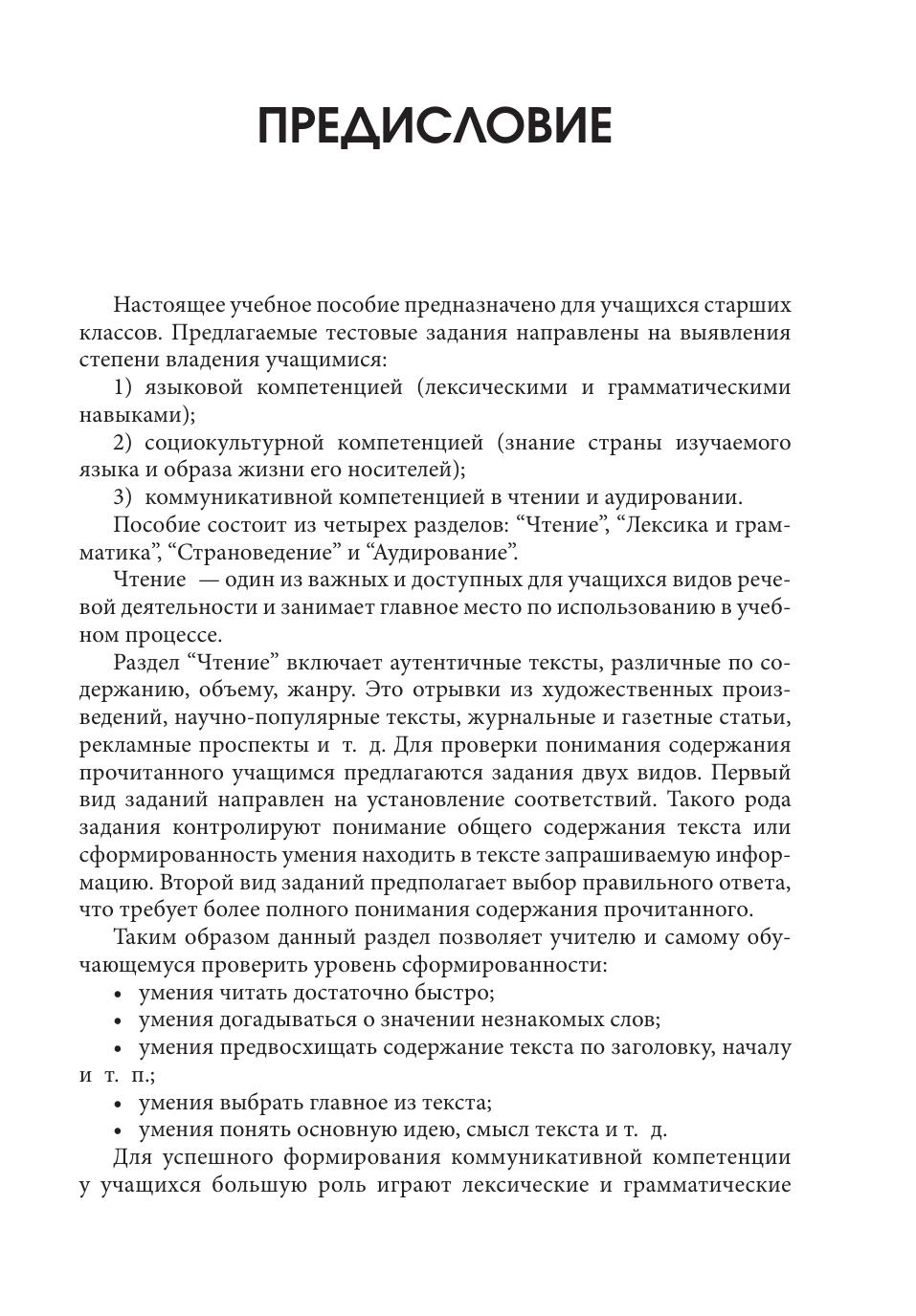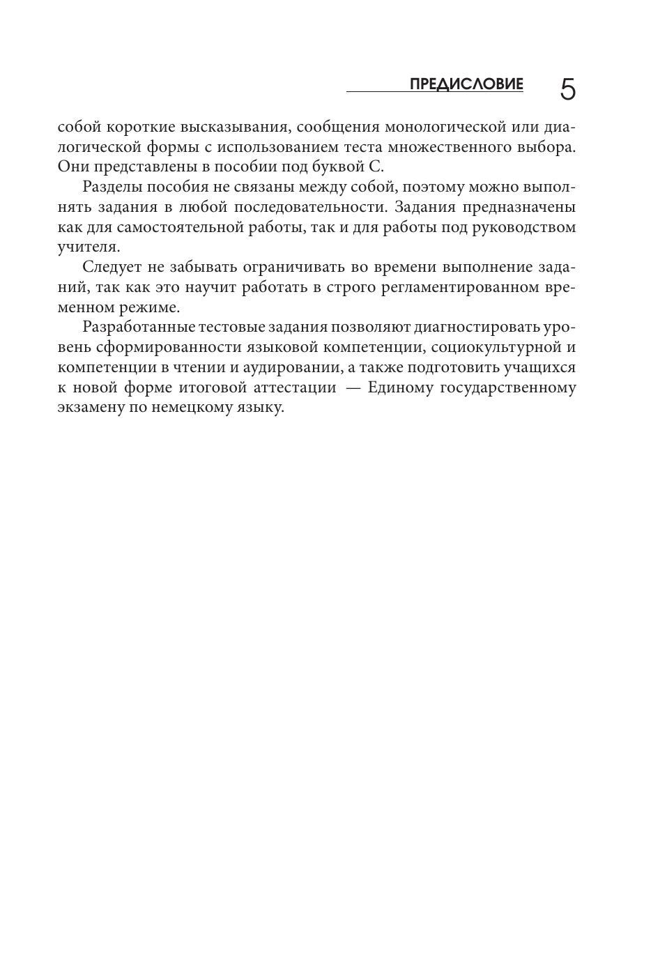 Данное учебное пособие ставит целью подготовить учащихся старшей школы к успешной сдаче Единого государственного экзамена по немецкому языку и выявить уровень сформированности языковой компетенции, социокультурной компетенции и компетенции в чтении. Пособие состоит из четырех разделов: «Чтение», «Лексика и грамматика», «Страноведение» и «Аудирование». Пособие адресовано в первую очередь учащимся старших классов средних школ, гимназий, лицеев, а также учителям немецкого языка, методистам, студентам педагогических вузов и колледжей, аспирантам.