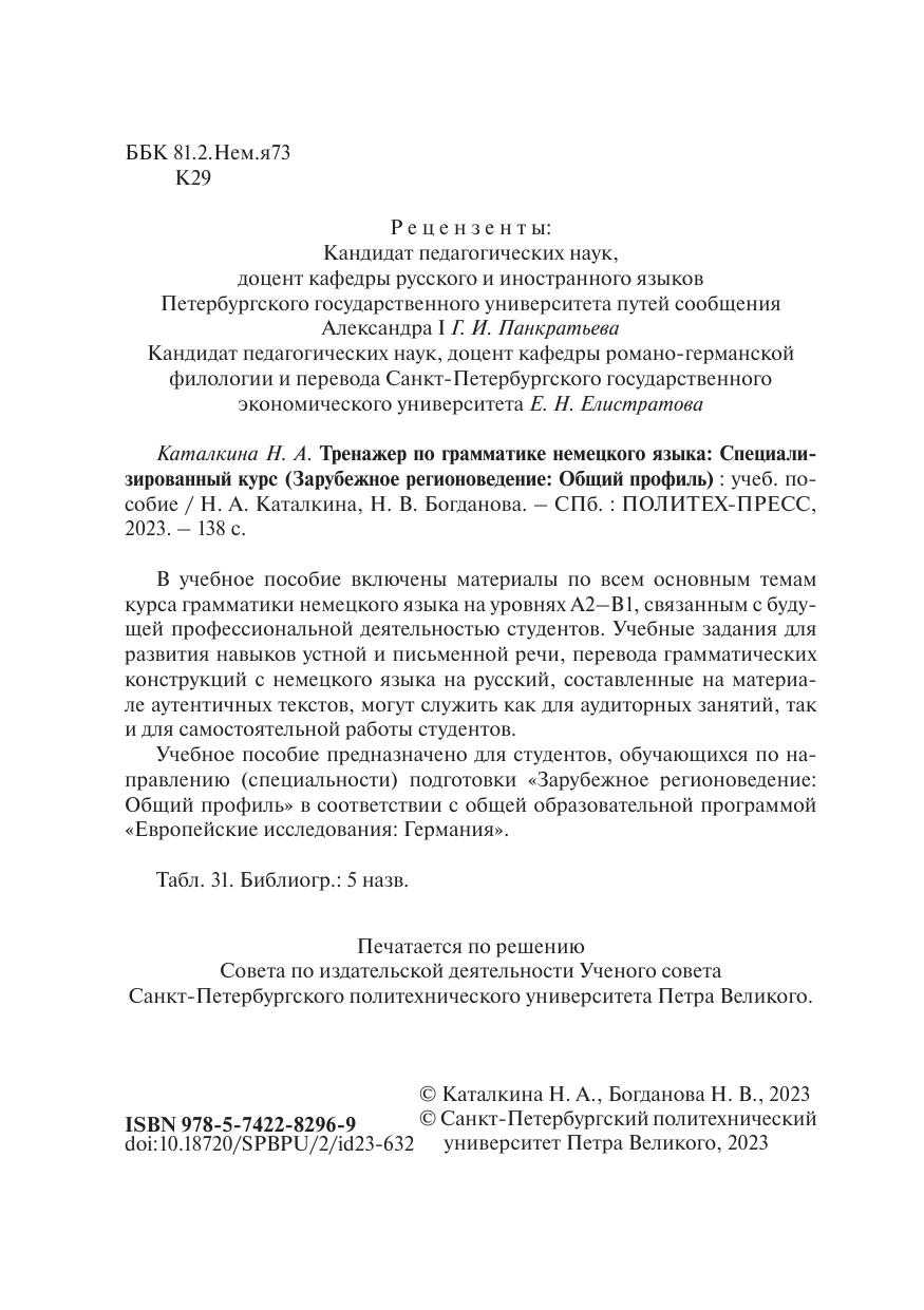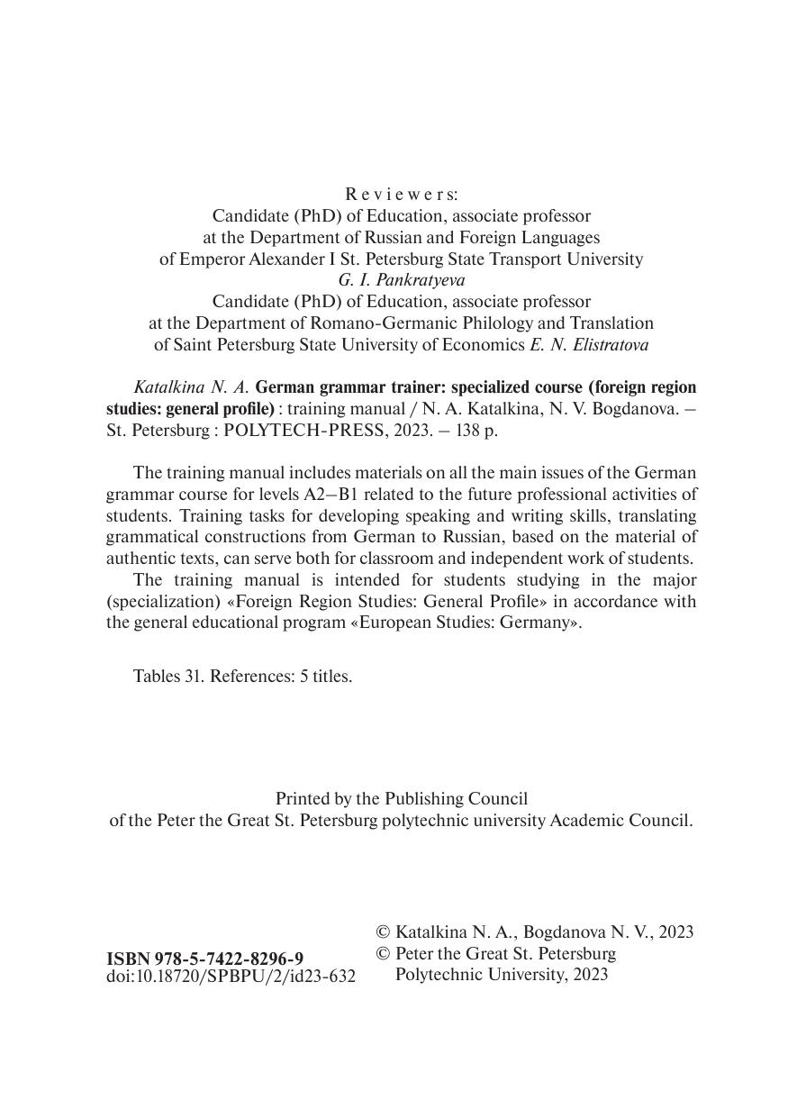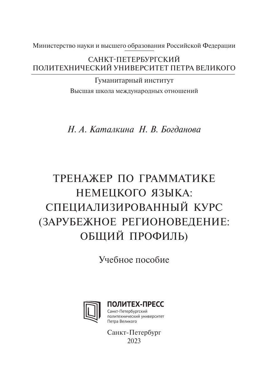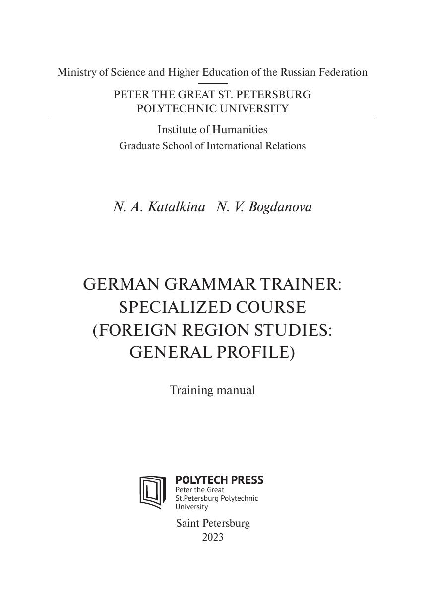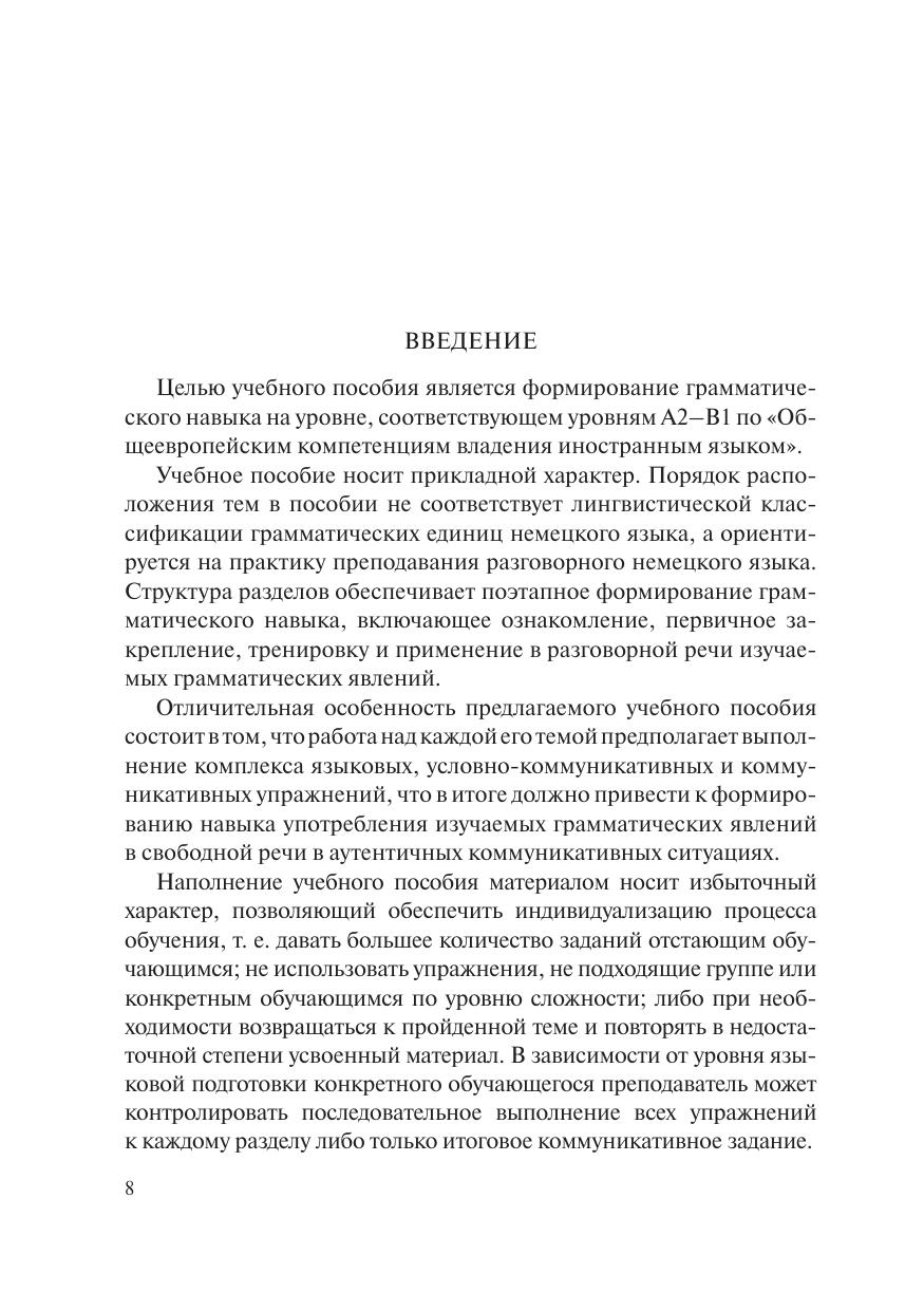 В учебное пособие включены материалы по всем основным темам курса грамматики немецкого языка на уровнях А2–B1, связанным с будущей профессиональной деятельностью студентов. Учебные задания для развития навыков устной и письменной речи, перевода грамматических конструкций с немецкого языка на русский, составленные на материале аутентичных текстов, могут служить как для аудиторных занятий, так и для самостоятельной работы студентов. Учебное пособие предназначено для студентов, обучающихся по направлению (специальности) подготовки «Зарубежное регионоведение: Общий профиль» в соответствии с общей образовательной программой «Европейские исследования: Германия».