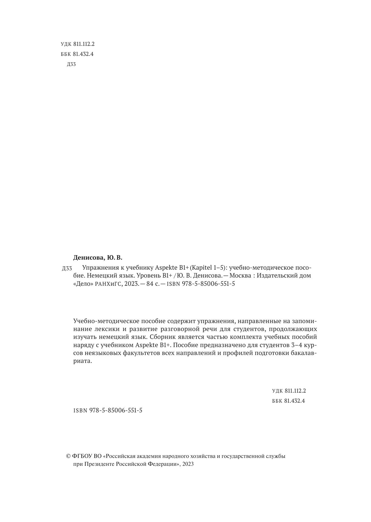Учебно-методическое пособие содержит упражнения, направленные на запоминание лексики и развитие разговорной речи для студентов, продолжающих изучать немецкий язык. Сборник является частью комплекта учебных пособий наряду с учебником Aspekte B1+. Пособие предназначено для студентов 3–4 курсов неязыковых факультетов всех направлений и профилей подготовки бакалавриата.