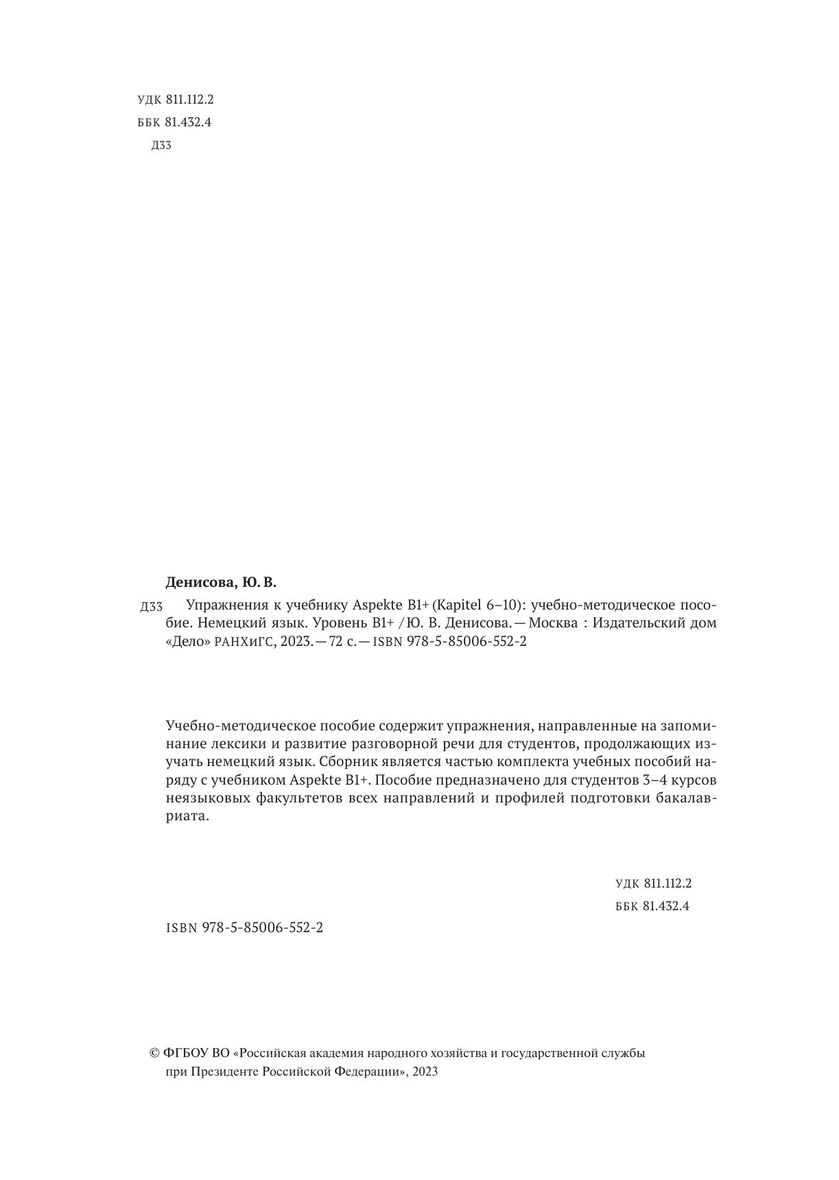 Учебно-методическое пособие содержит упражнения, направленные на запоминание лексики и развитие разговорной речи для студентов, продолжающих изучать немецкий язык. Сборник является частью комплекта учебных пособий наряду с учебником Aspekte B1+. Пособие предназначено для студентов 3–4 курсов неязыковых факультетов всех направлений и профилей подготовки бакалавриата.