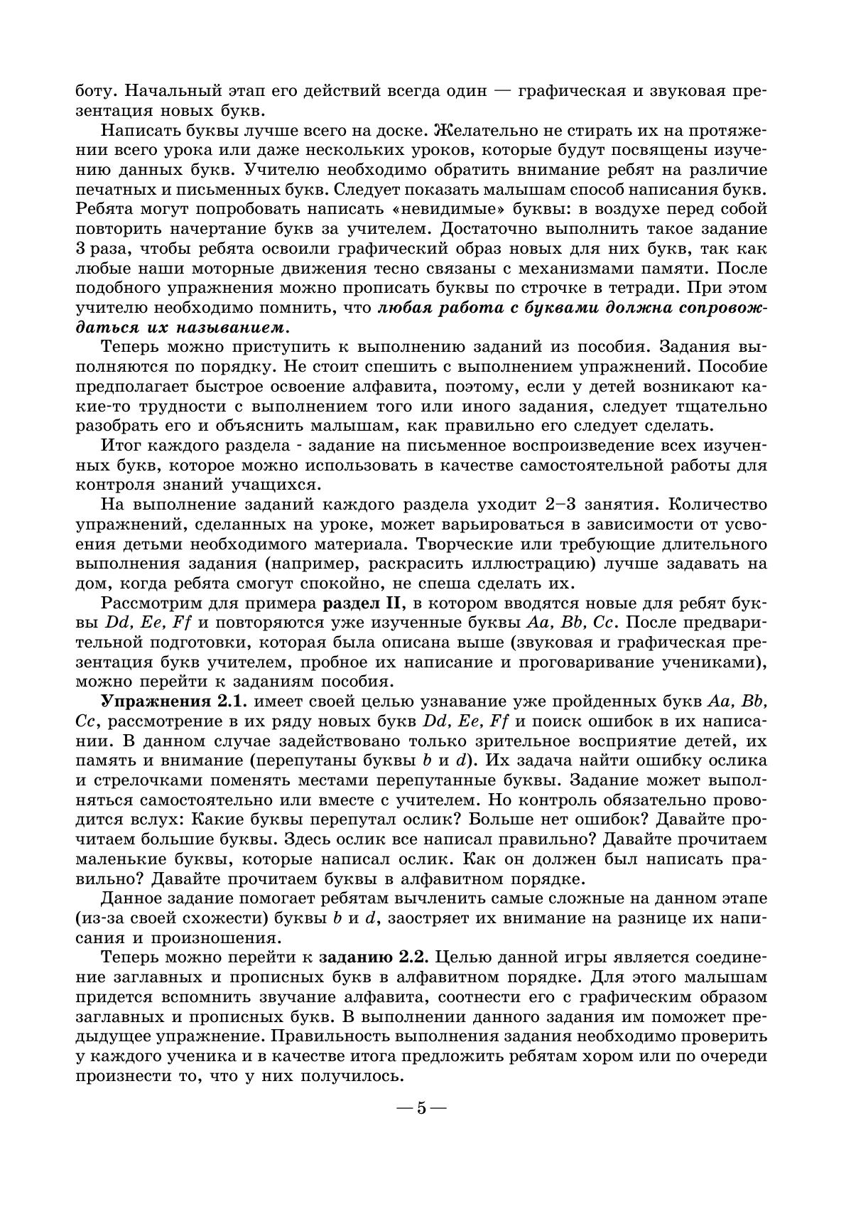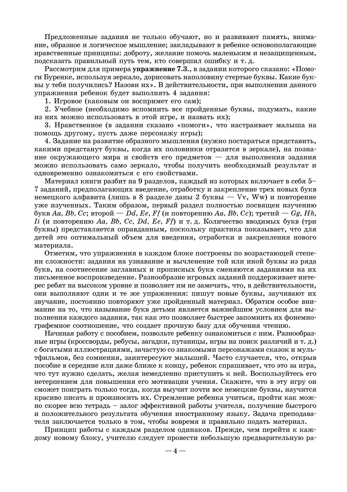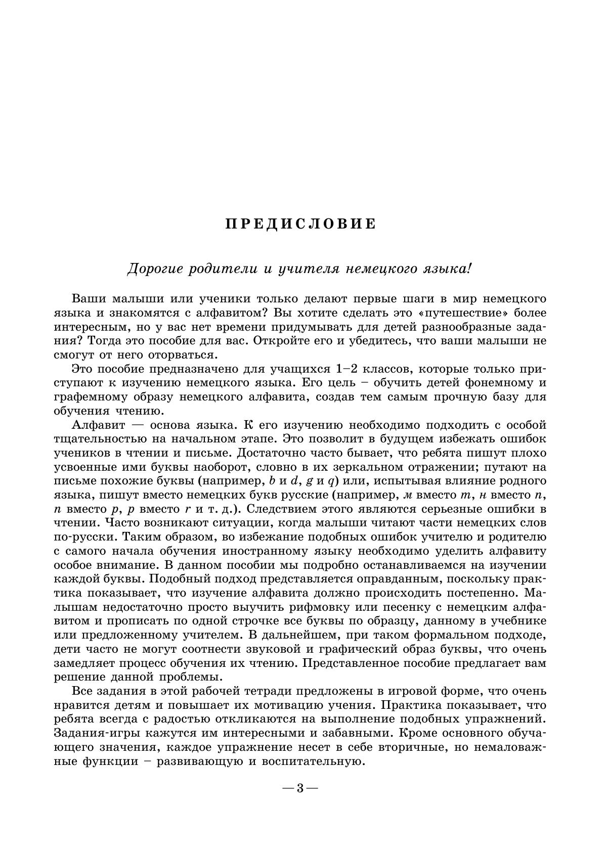 Данное пособие предназначено для учащихся 1–2 классов, которые только приступают к изучению немецкого языка. Его цель — обучить детей фонемному и графемному образу немецкого алфавита, создав тем самым прочную базу для обучения чтению. Все задания в этой книге даны в игровой форме. Материал пособия разбит на 9 блоков, каждый из которых включает в себя 5–7 упражнений, предполагающих введение, отработку и закрепление новых букв немецкого алфавита и повторение уже изученных. Упражнения в каждом блоке построены по возрастающей степени сложности: задания на узнавание и вычленение той или иной буквы из ряда букв, на соотнесение заглавных и прописных букв сменяются заданиями на их письменное воспроизведение. Пособие может использоваться как в работе на уроке, так и при домашнем индивидуальном обучении.